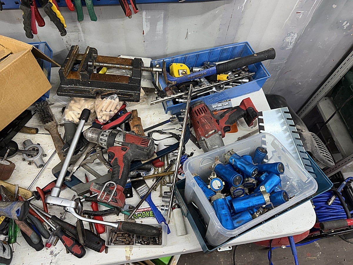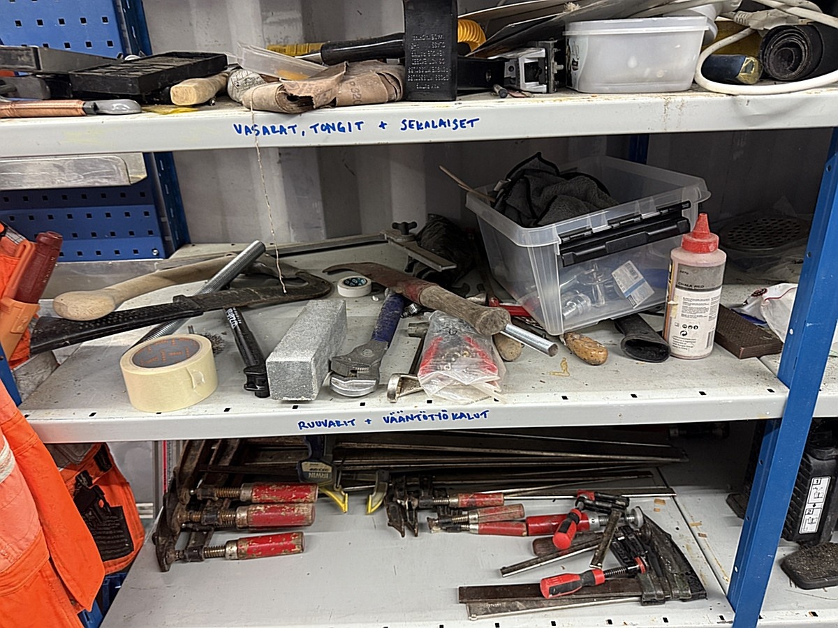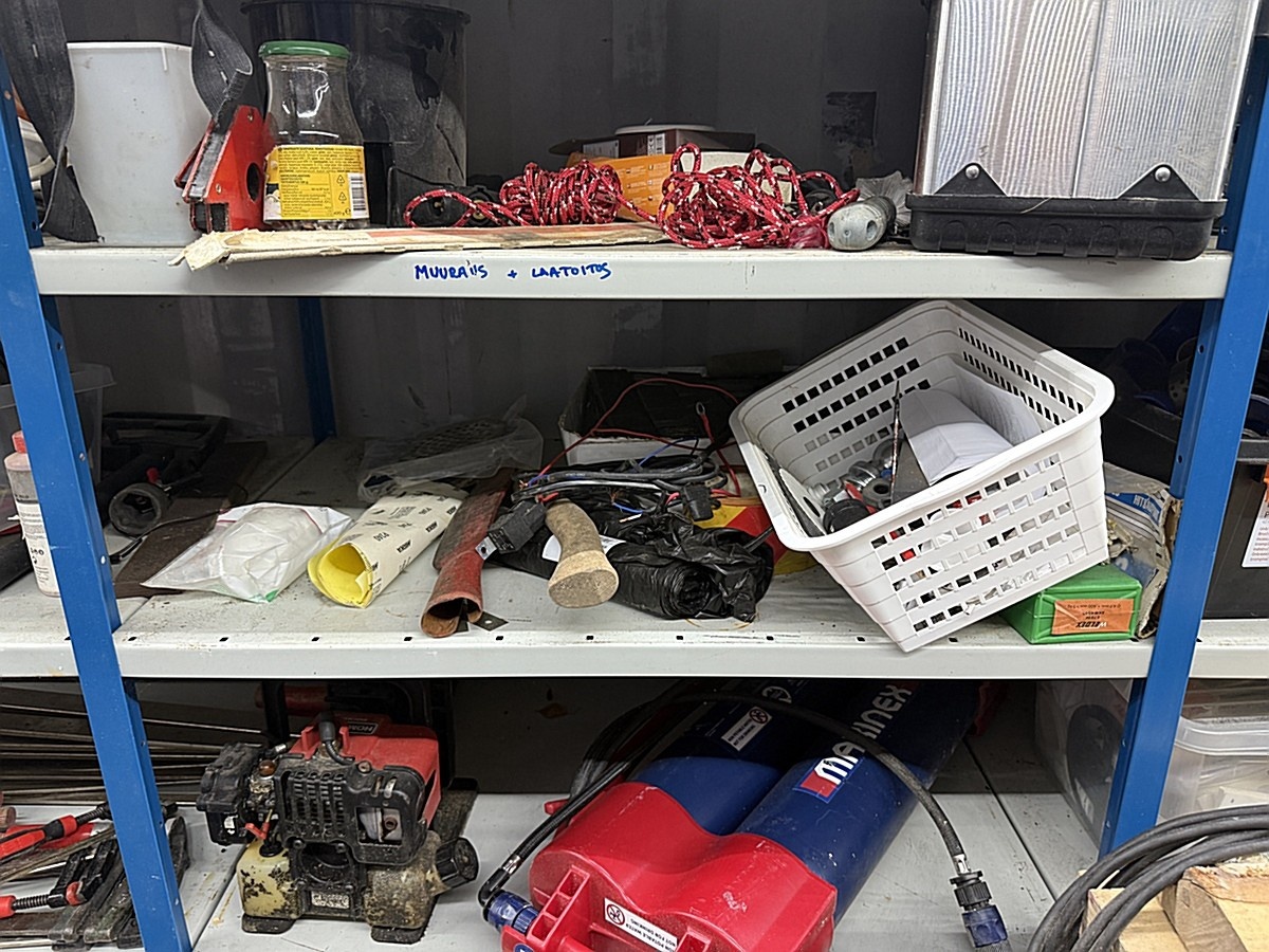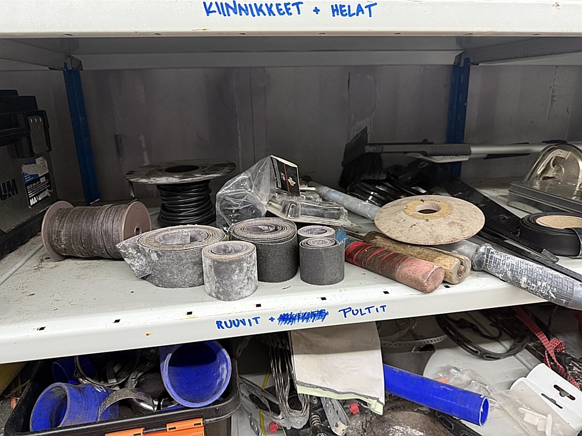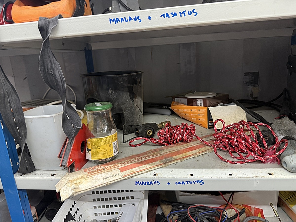 Myyntikohteet » UP Rakennus Tmi:n konkurssipesä (3155713-5), KÄMMENNIEMI, 05.11.2025 » 6.Hyllyn (5-hyllyväliä) ja työpöydän työkalut ja tavarat.