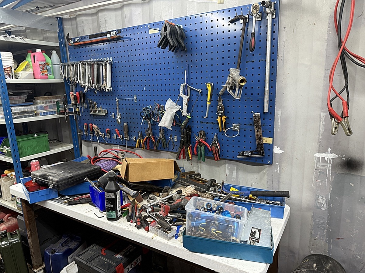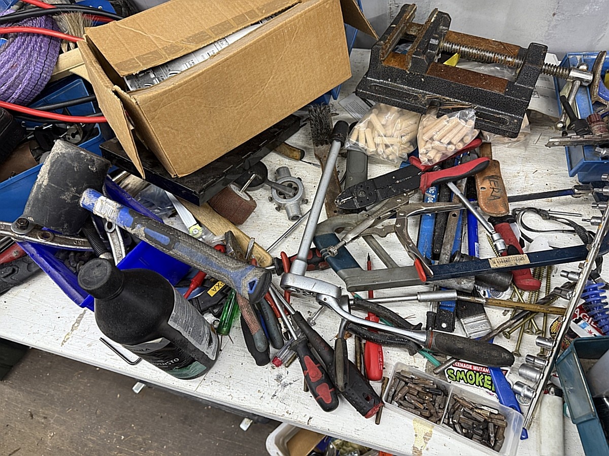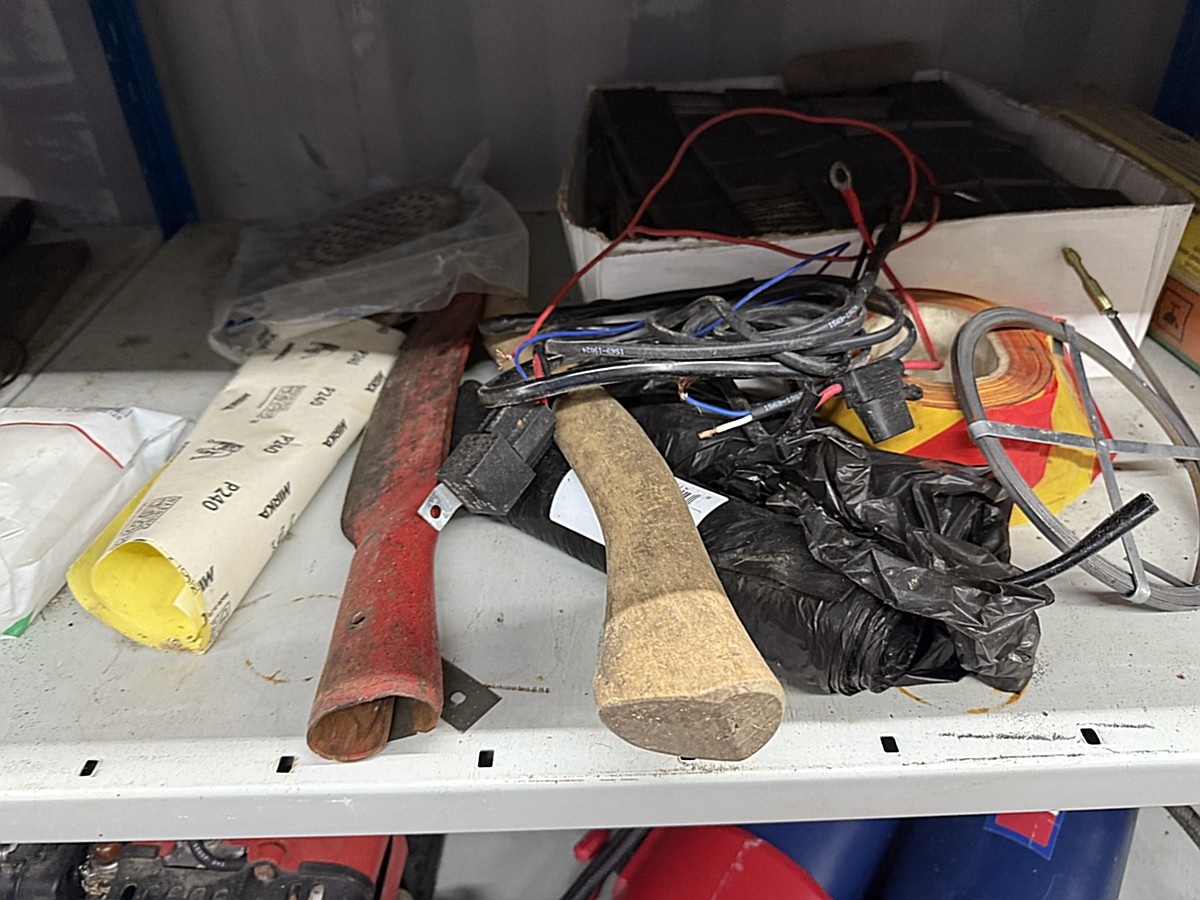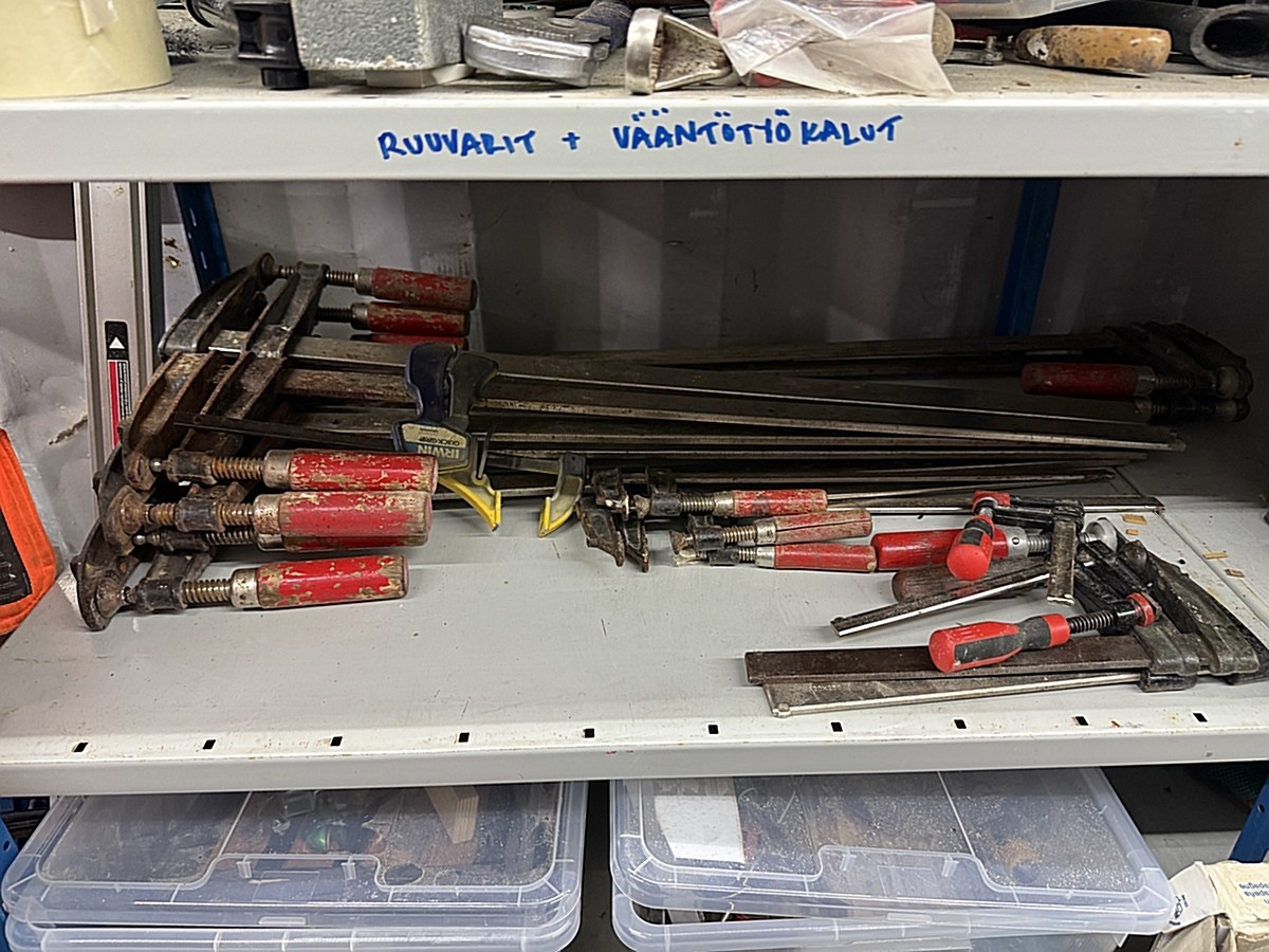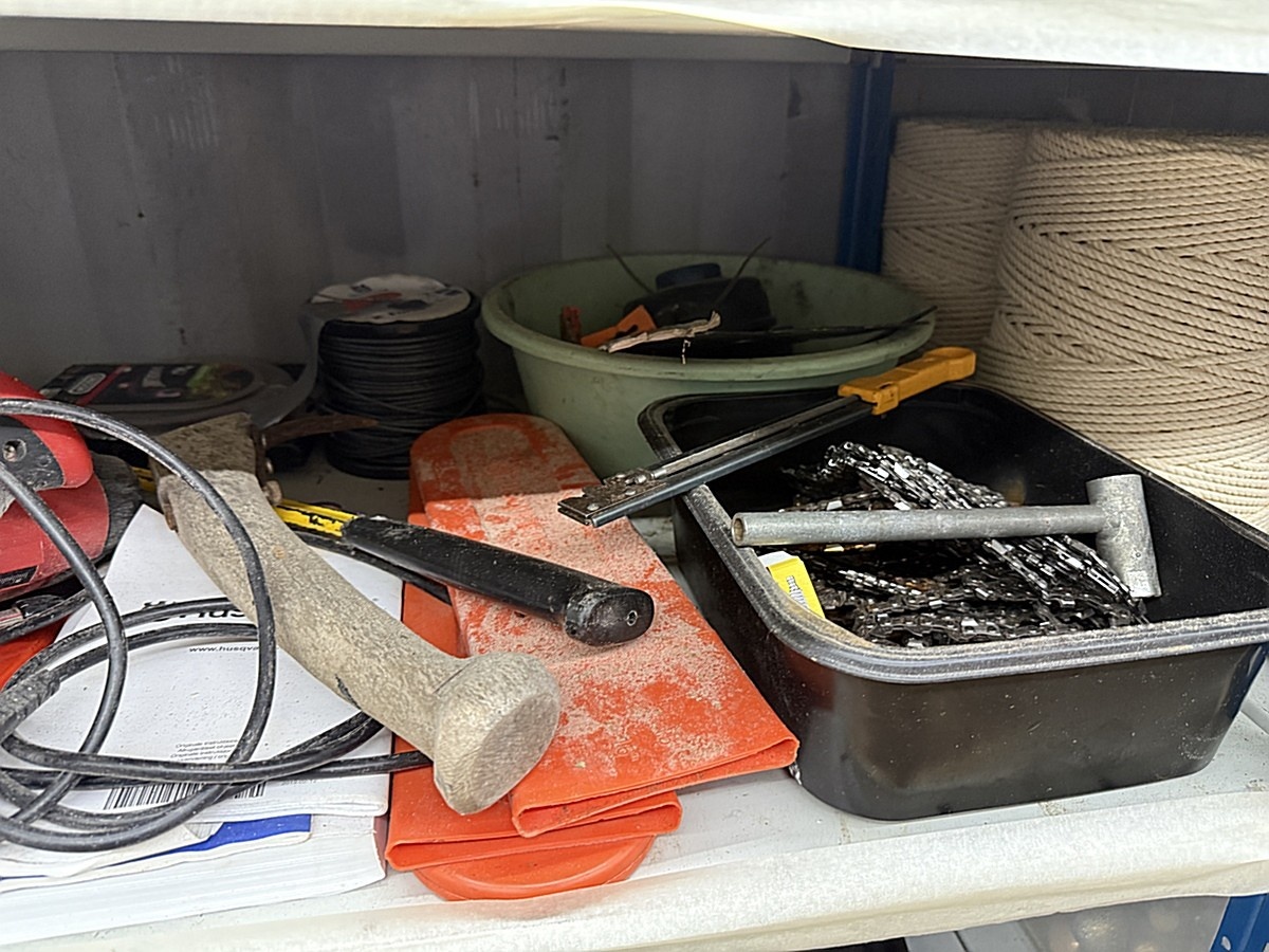 Myyntikohteet » UP Rakennus Tmi:n konkurssipesä (3155713-5), KÄMMENNIEMI, 05.11.2025 » 6.Hyllyn (5-hyllyväliä) ja työpöydän työkalut ja tavarat.