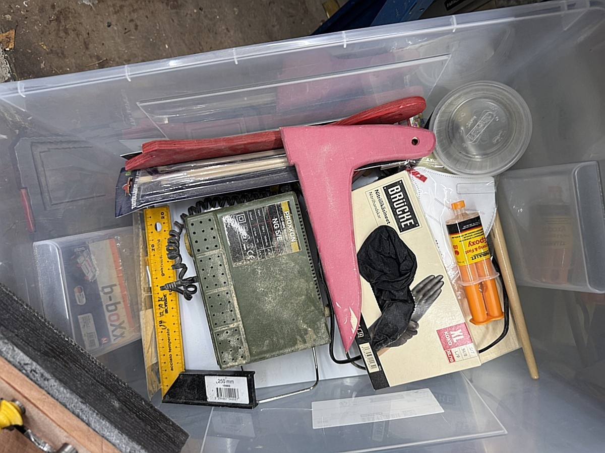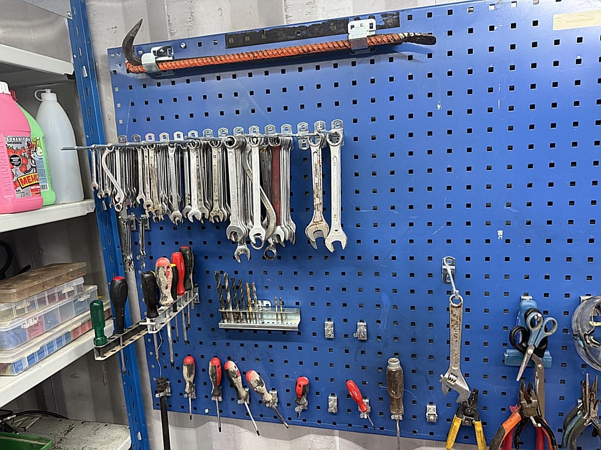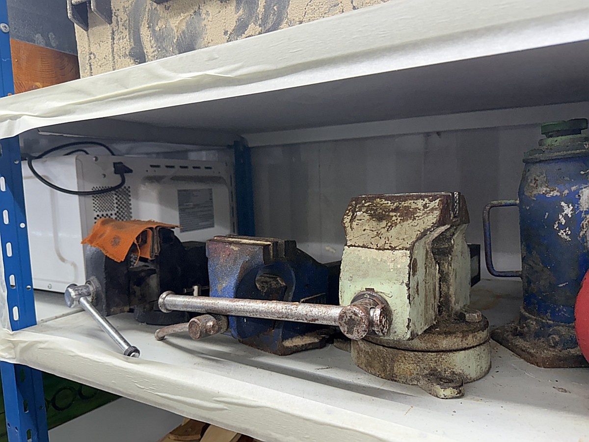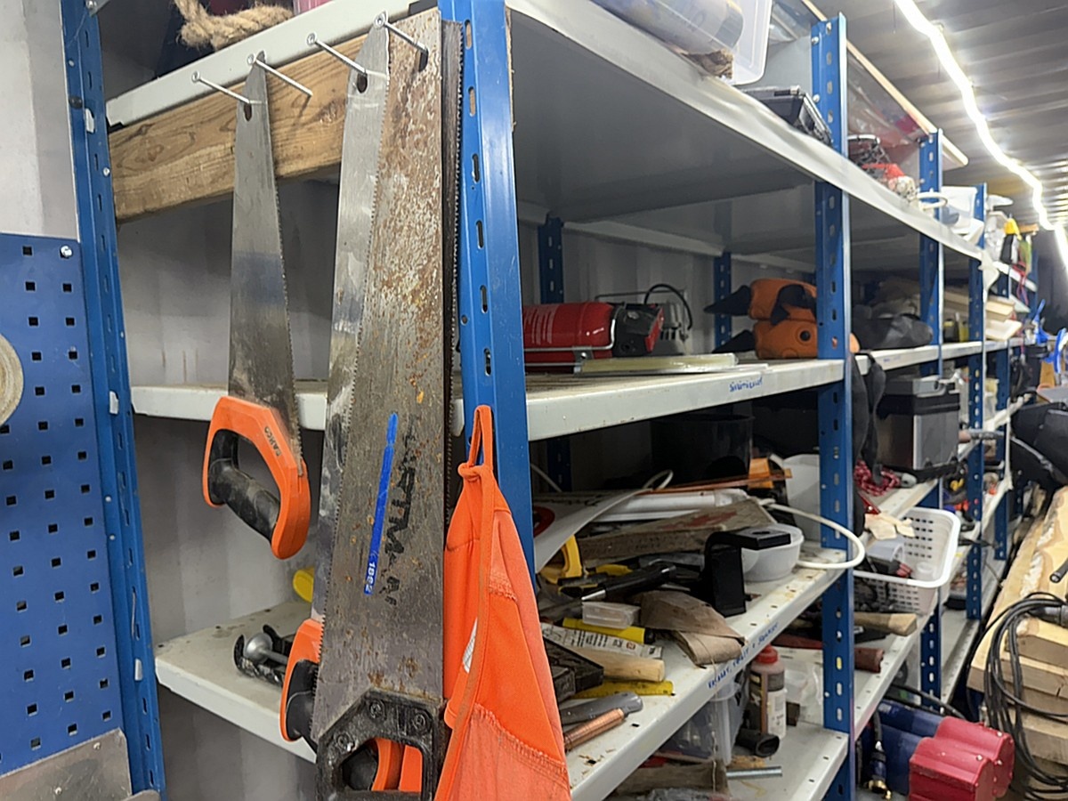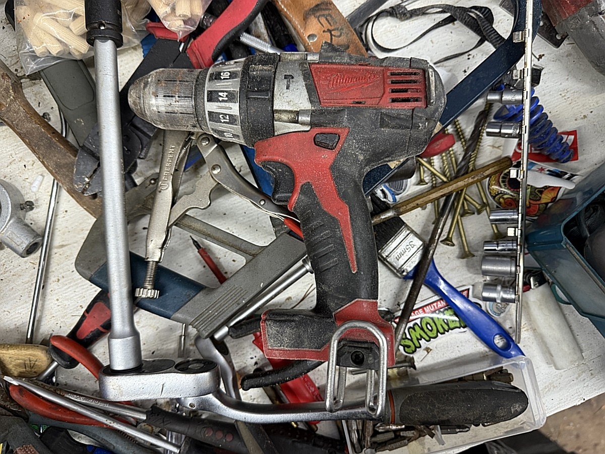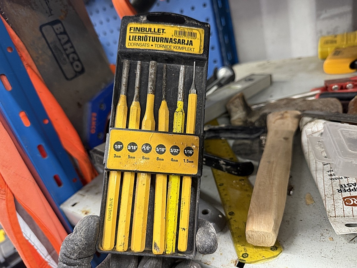 Myyntikohteet » UP Rakennus Tmi:n konkurssipesä (3155713-5), KÄMMENNIEMI, 05.11.2025 » 6.Hyllyn (5-hyllyväliä) ja työpöydän työkalut ja tavarat.