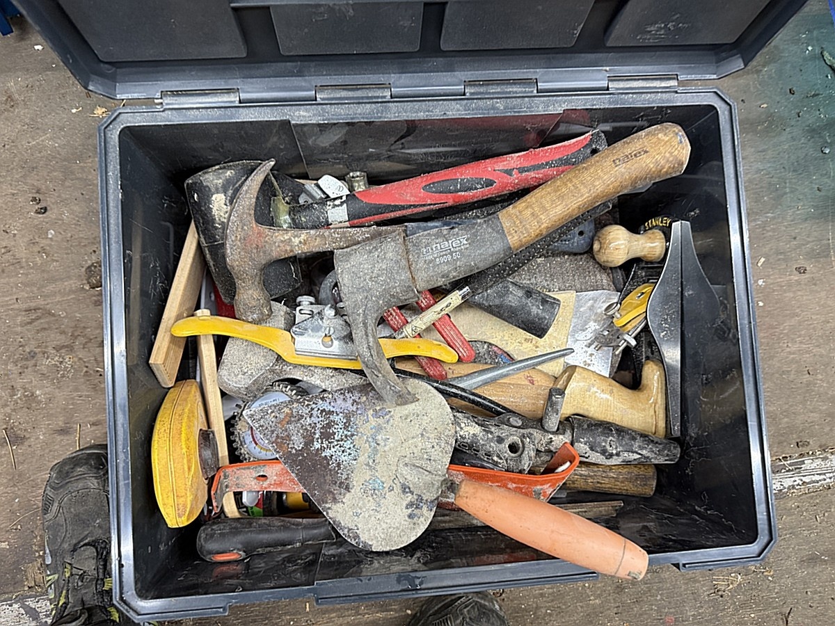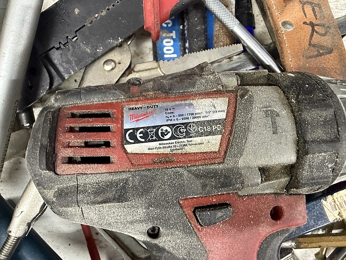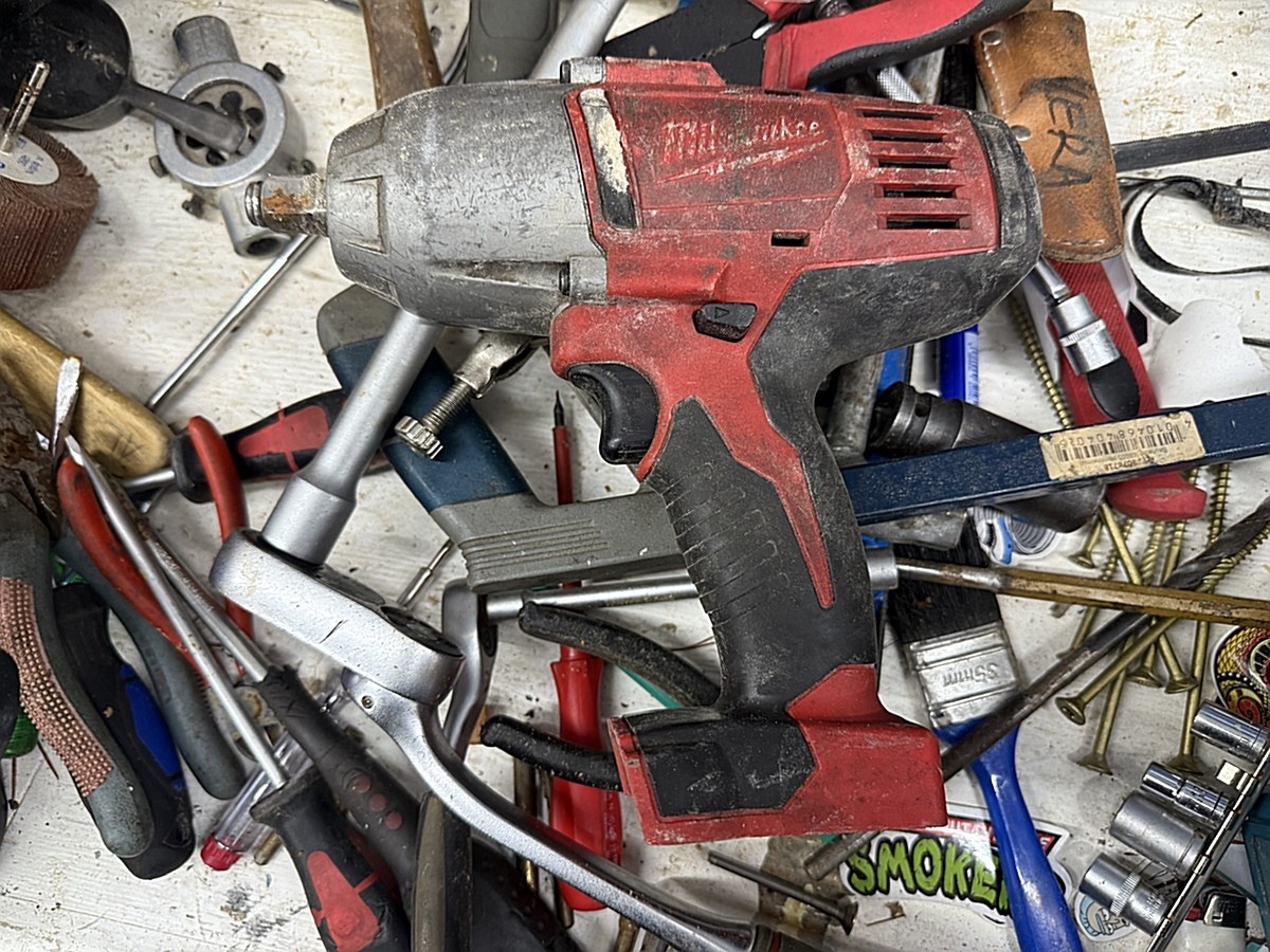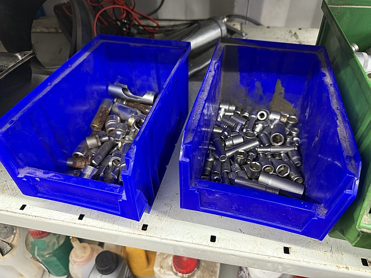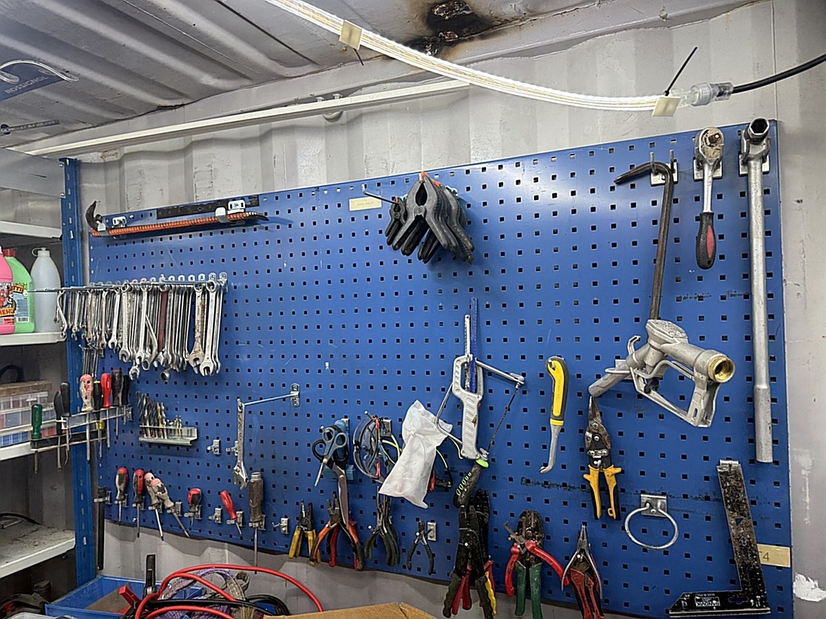 Myyntikohteet » UP Rakennus Tmi:n konkurssipesä (3155713-5), KÄMMENNIEMI, 05.11.2025 » 6.Hyllyn (5-hyllyväliä) ja työpöydän työkalut ja tavarat.