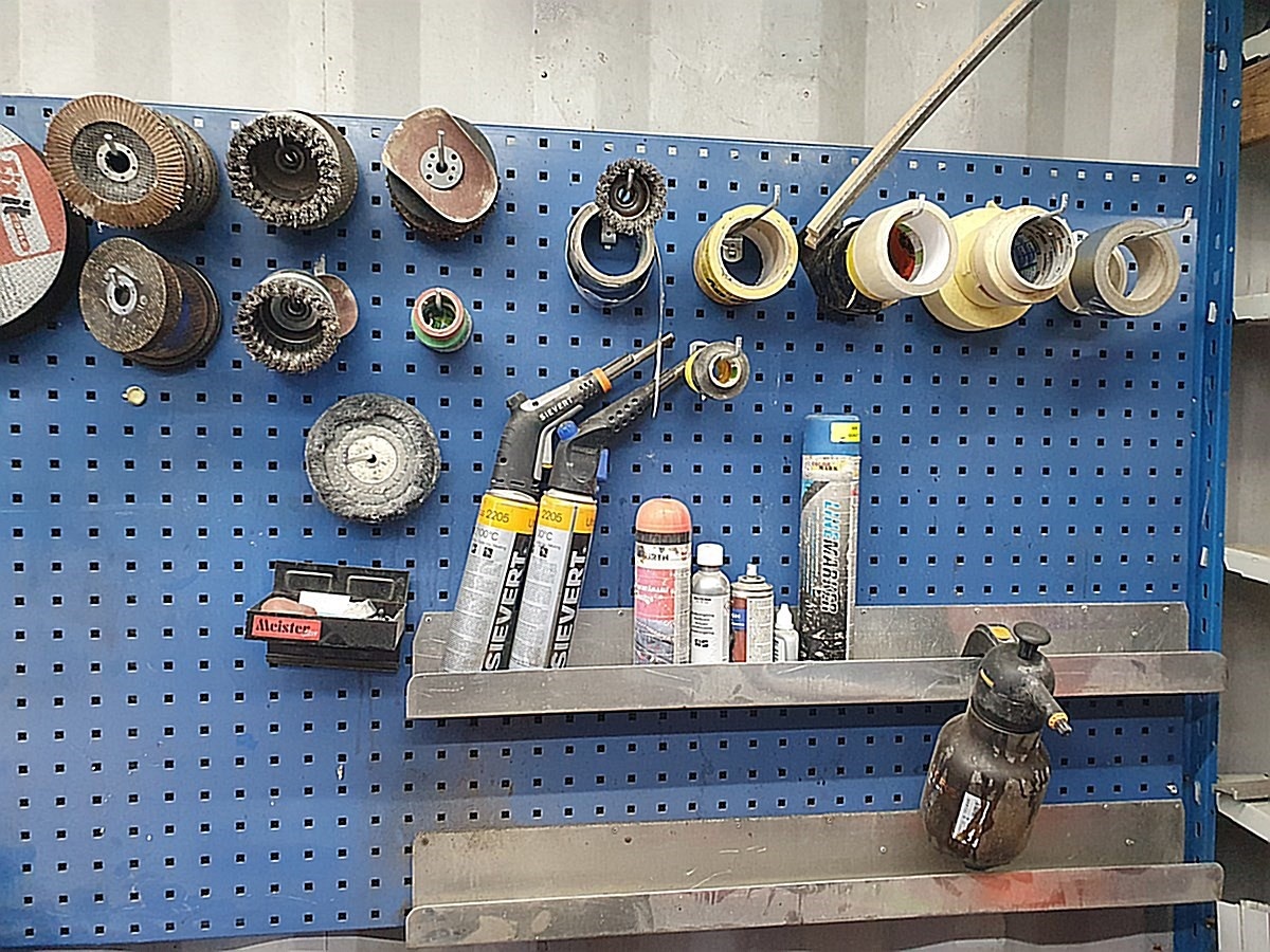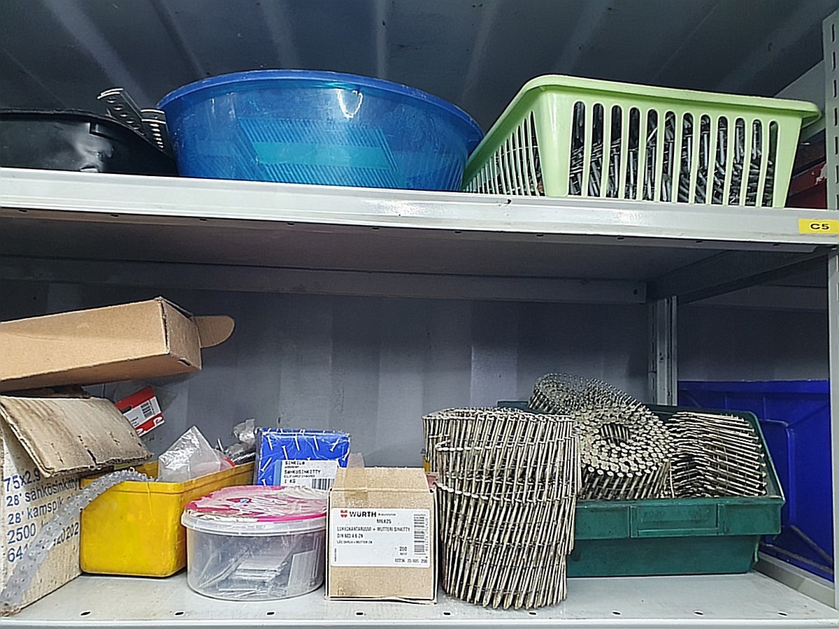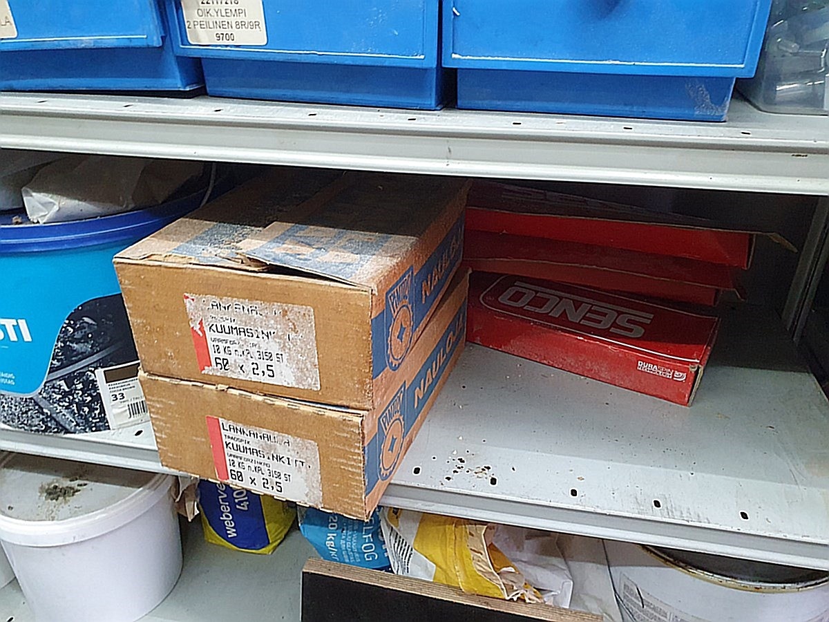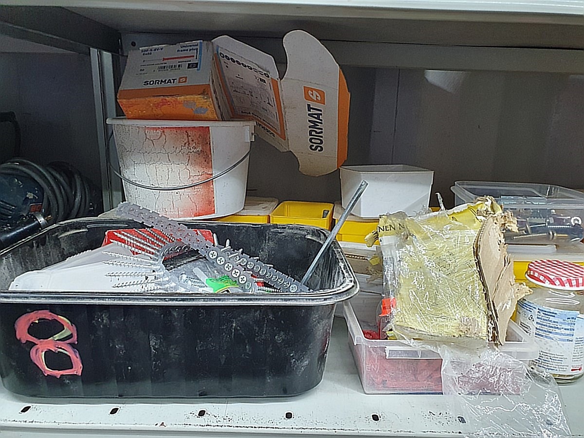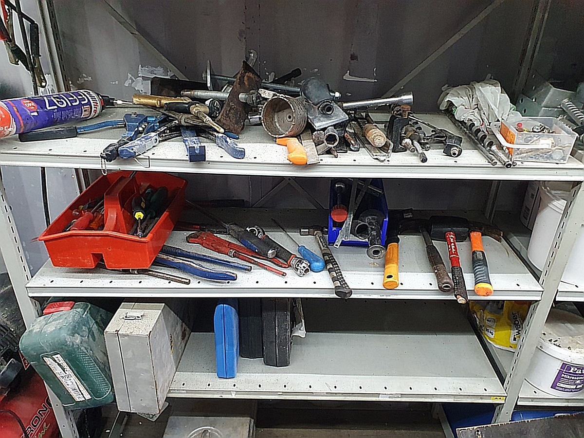 Myyntikohteet » UP Rakennus Tmi:n konkurssipesä (3155713-5), KÄMMENNIEMI, 05.11.2025 » 8. Hyllyn tavarat ja hyllyt (4 hyllyväliä) sekä työkalutaulu (8B)