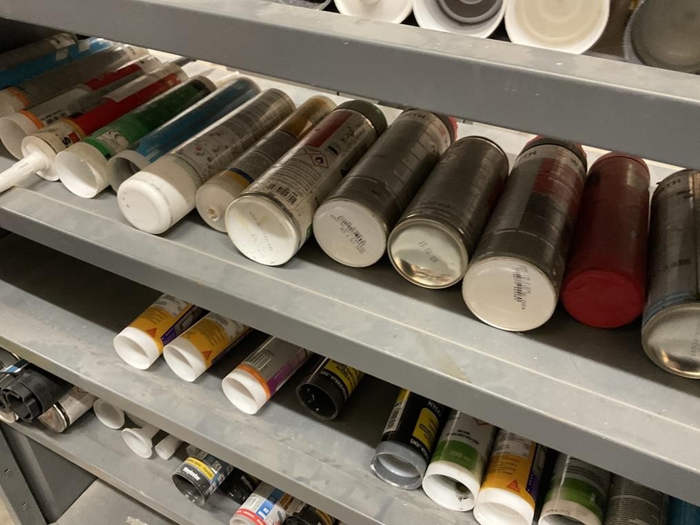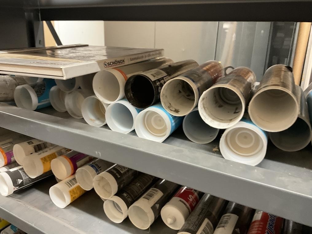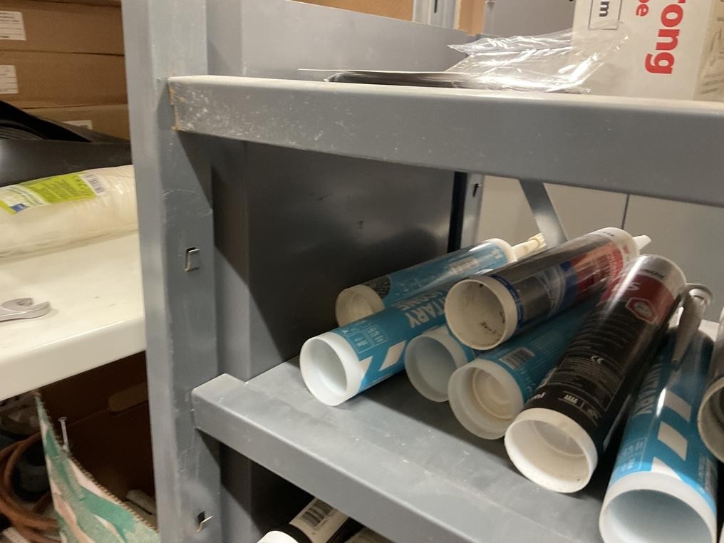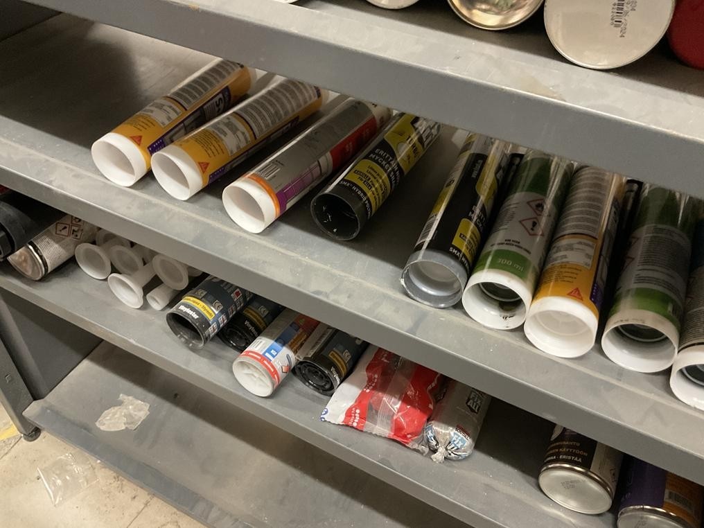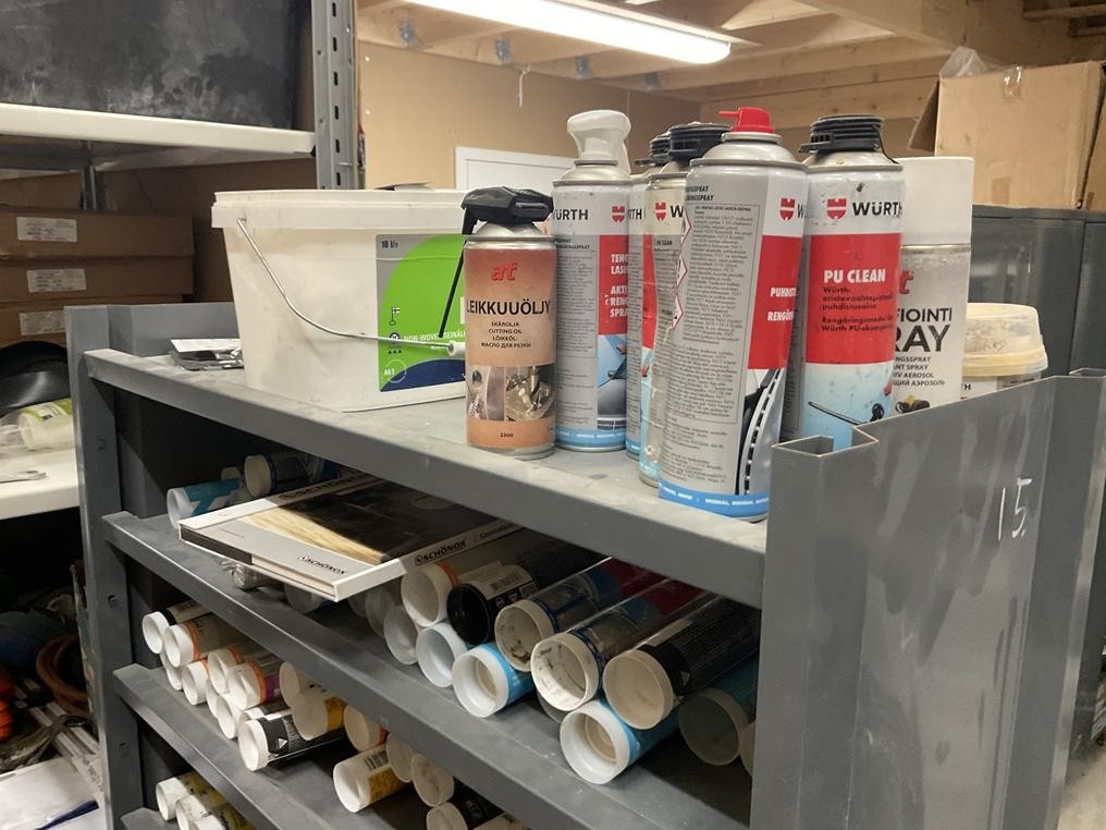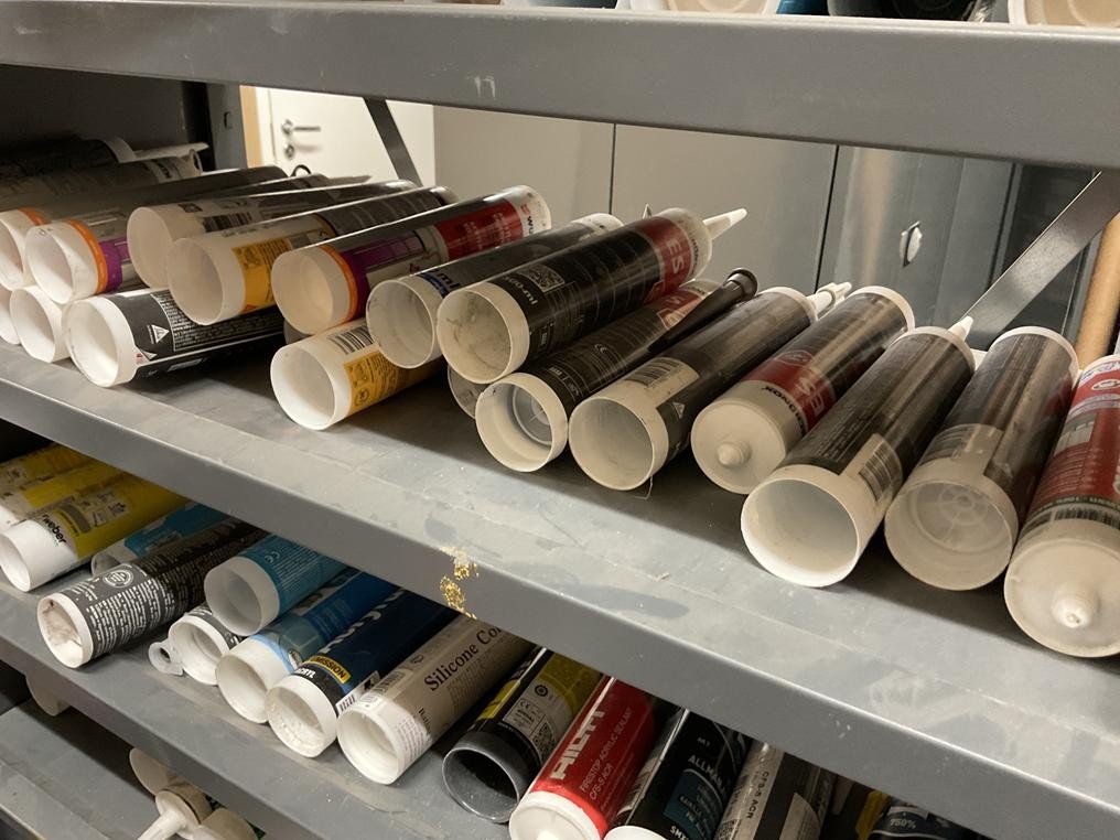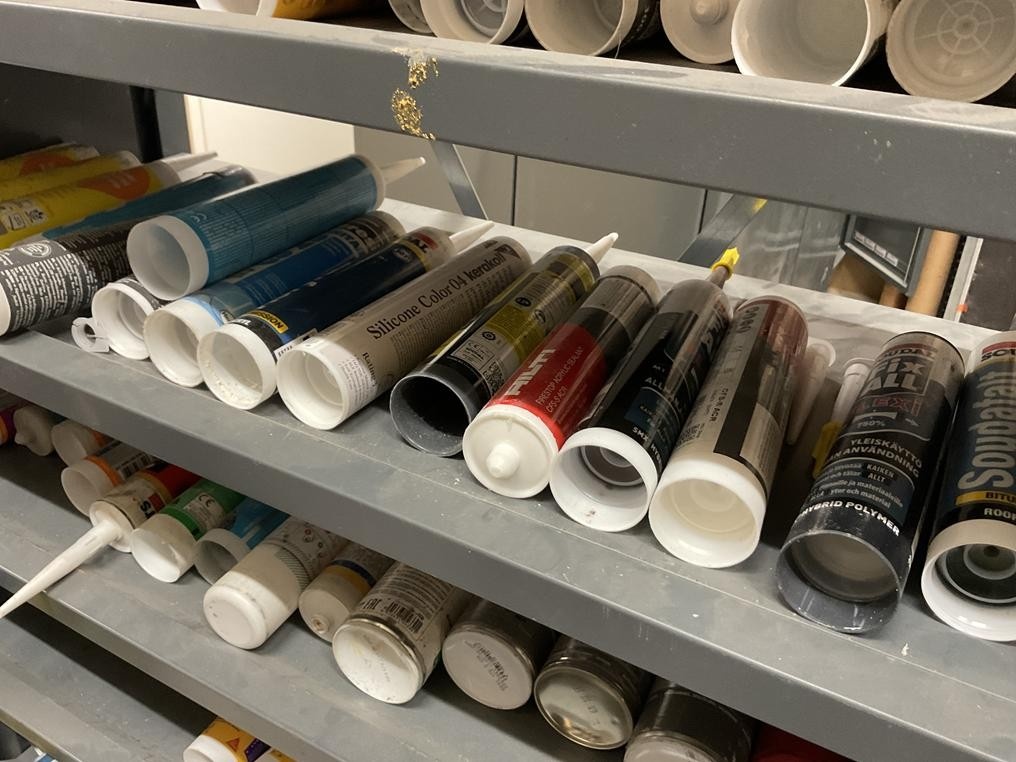 Myyntikohteet » 2. Rakennustyöt Pulkkinen Oy:n konkurssipesä, RAISIO (2912661-9), 18.11.2025 » 15. Harmaa varastohylly, hyllyssä olevat silikonit, massat ym.