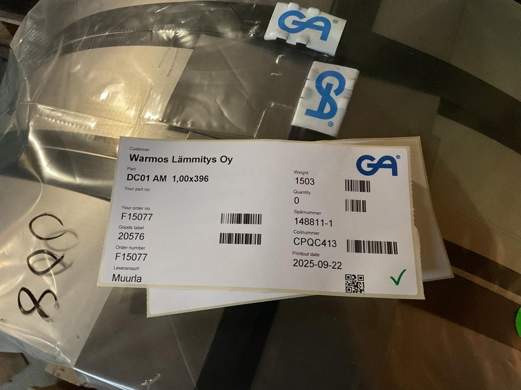 Myyntikohteet » 4. Warmos Lämmitys Oy:n konkurssipesä, MUURLA (0871192-3), 20.11.2025 » 08. Teräslevyrulla DC01 AM, 01 x 396 mm. 1503 kg (kylmävalssattu teräs)