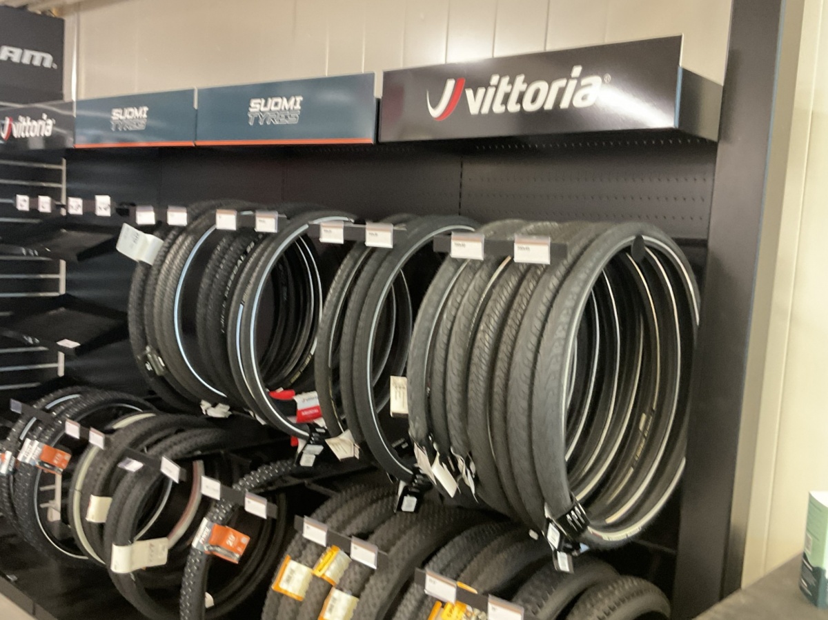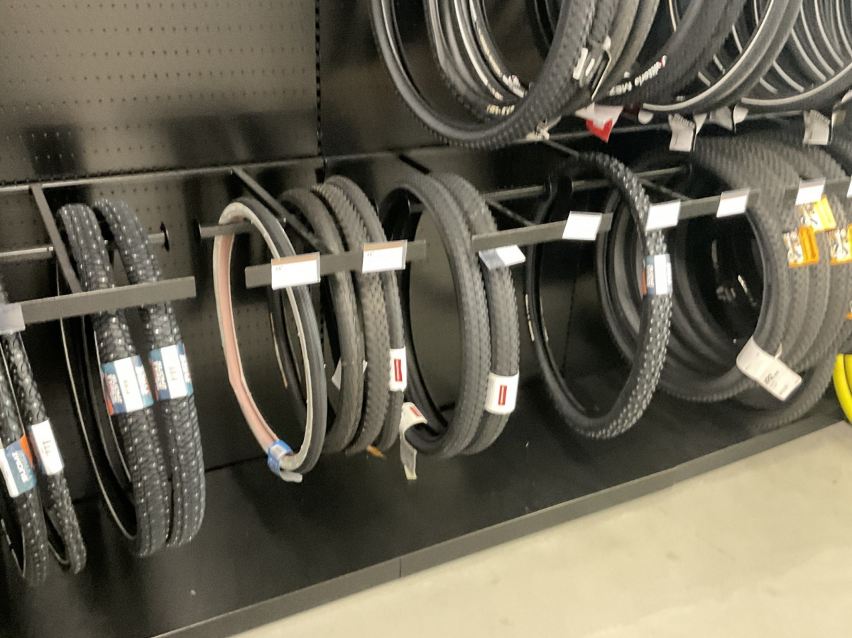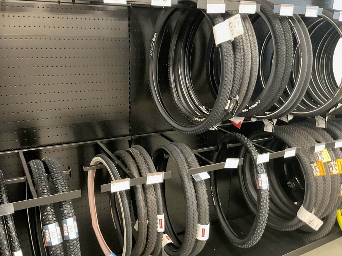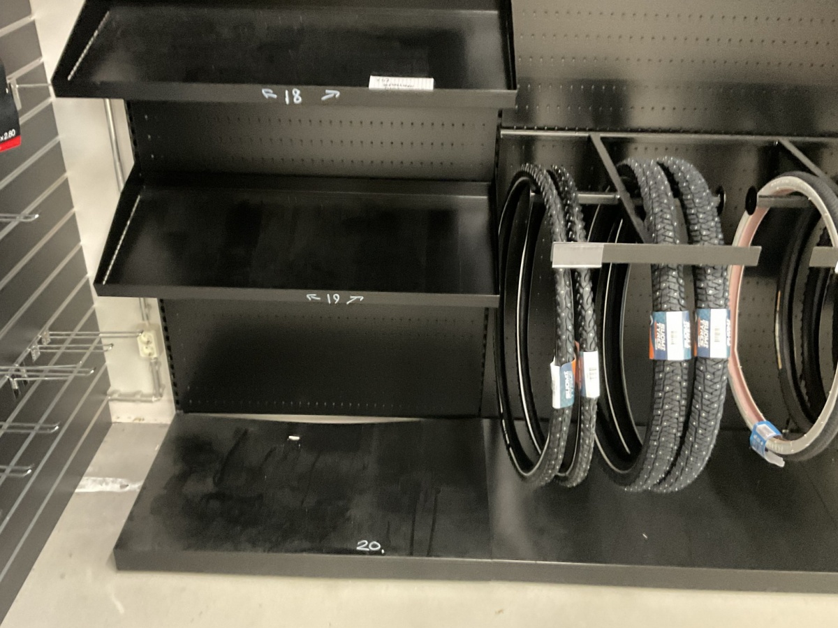 Myyntikohteet » 8. Seven Bikes Oy:n konkurssipesä, TAMPERE (3215327-1), 26.11.2025 » K 07. Pyöränkumeille ja vanteille rakenettu rengasteline/hylly (leveys n.3,3 metriä)