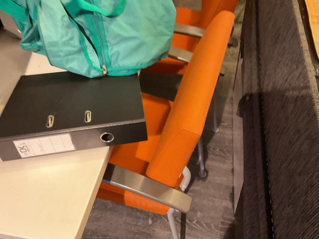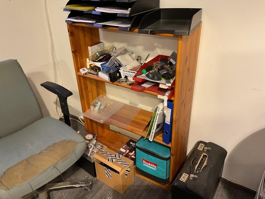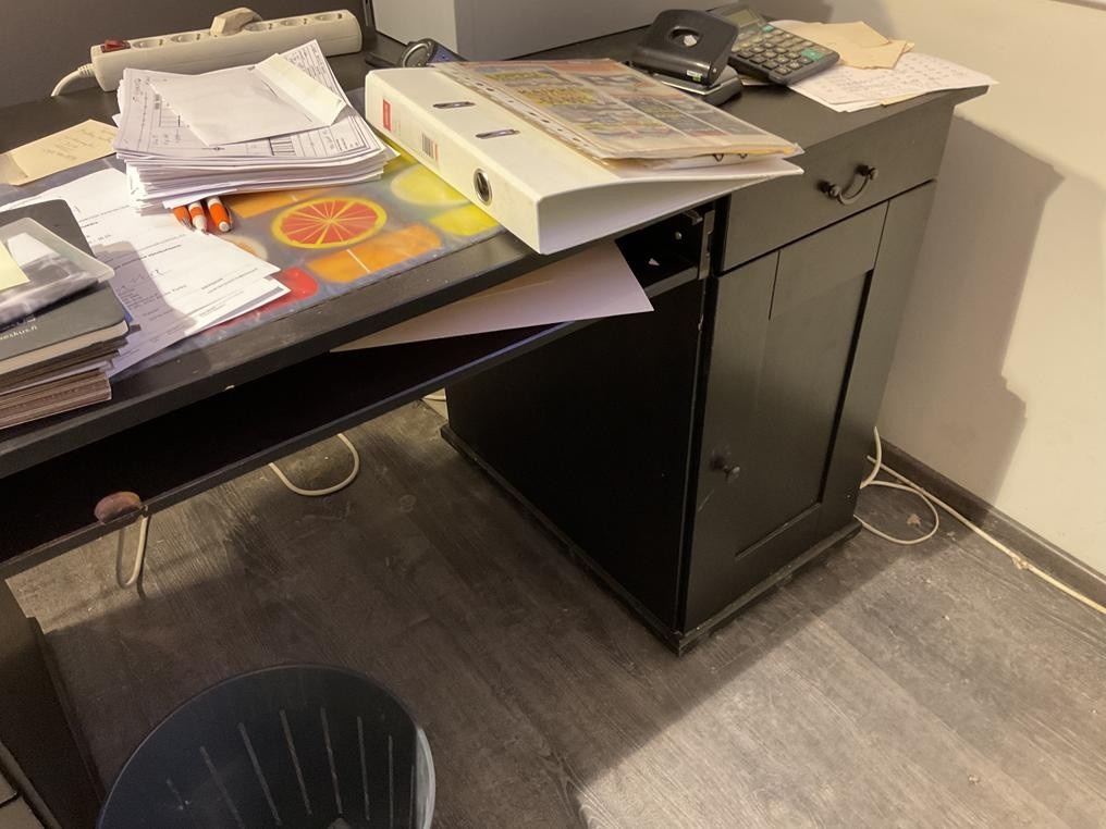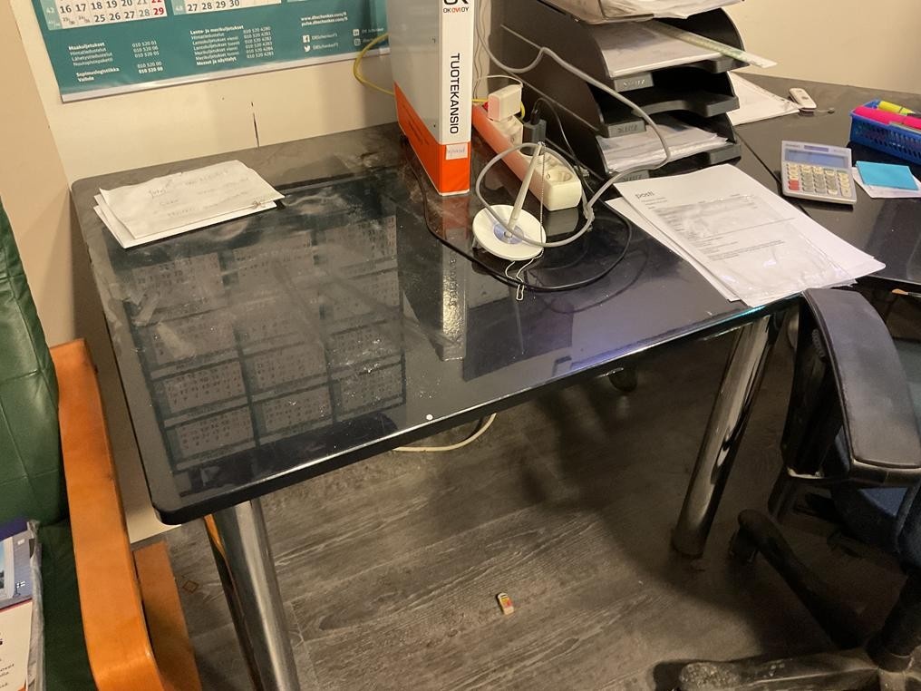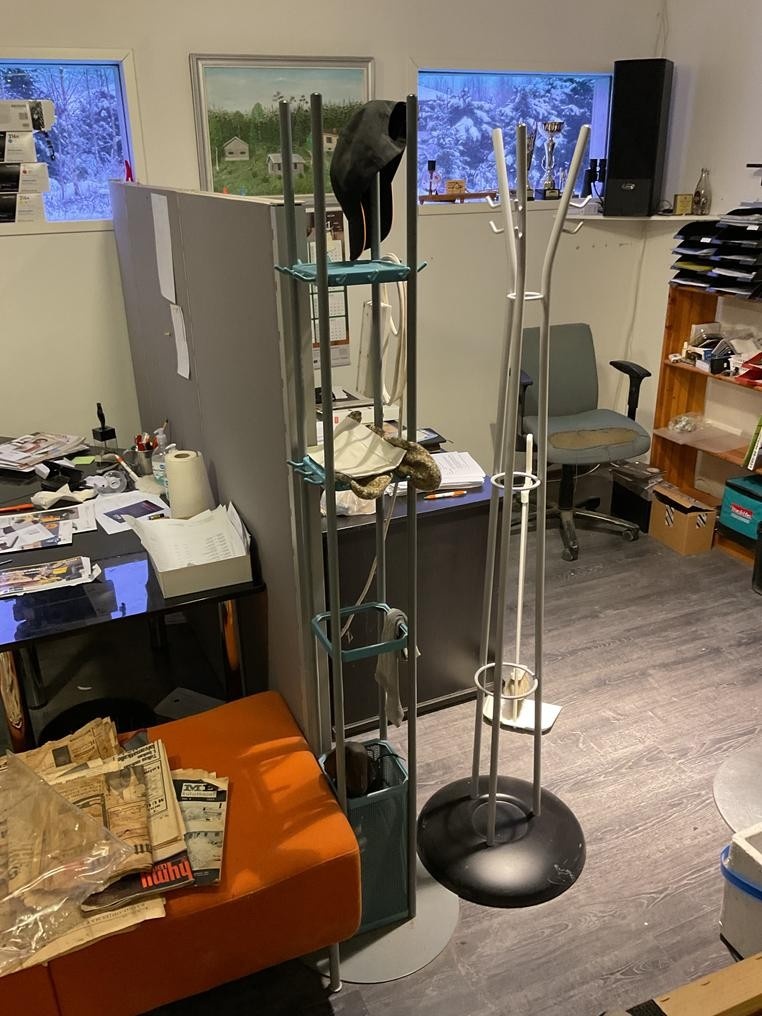 Myyntikohteet » 1. Okmatek Tmi:n konkurssipesä, LOIMAA (1318099-5), 26.11.2025 » 20. Toimistotuoli, 2-osainen toimistopöytä, toimistopöytä, naulakot 2 kappaletta, pöytä + tuolit 4 kappaletta, hylly