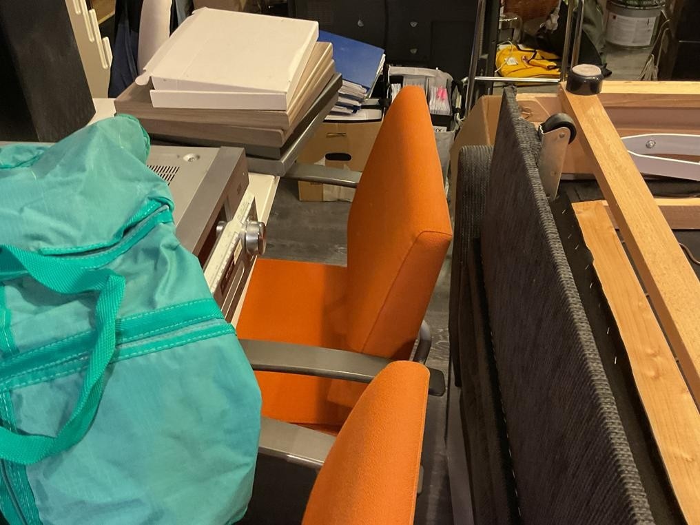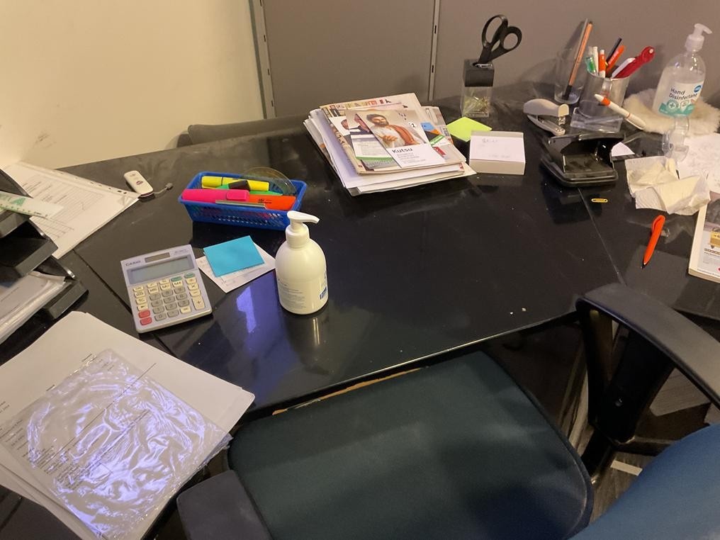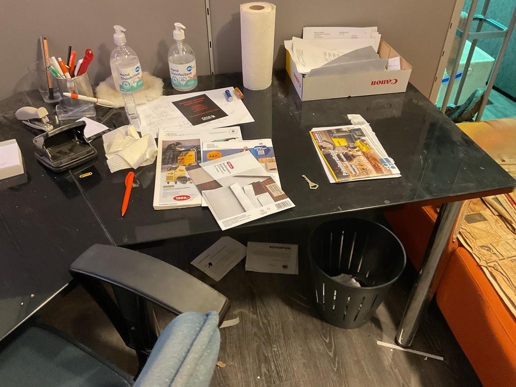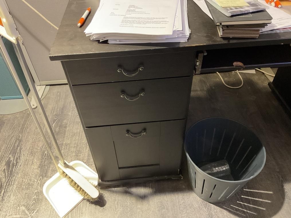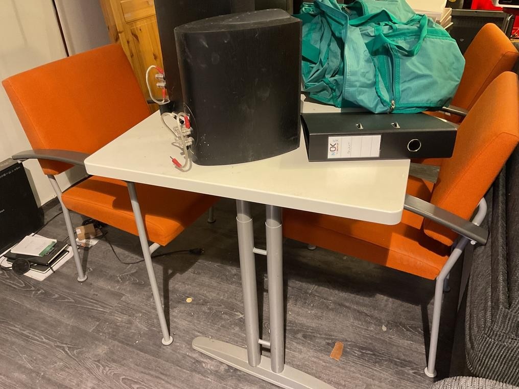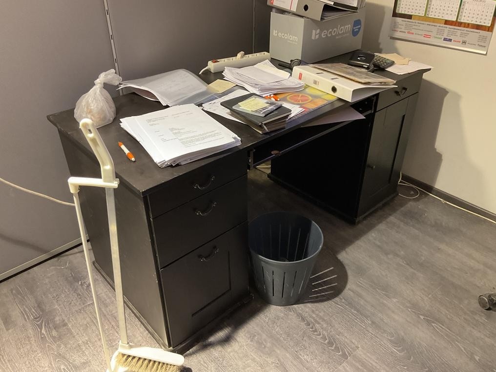 Myyntikohteet » 1. Okmatek Tmi:n konkurssipesä, LOIMAA (1318099-5), 26.11.2025 » 20. Toimistotuoli, 2-osainen toimistopöytä, toimistopöytä, naulakot 2 kappaletta, pöytä + tuolit 4 kappaletta, hylly