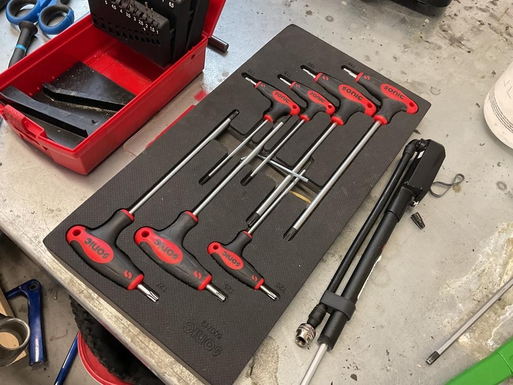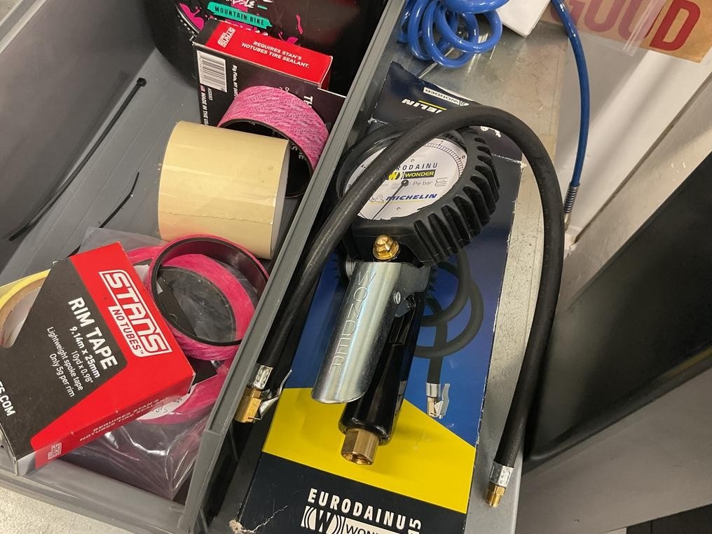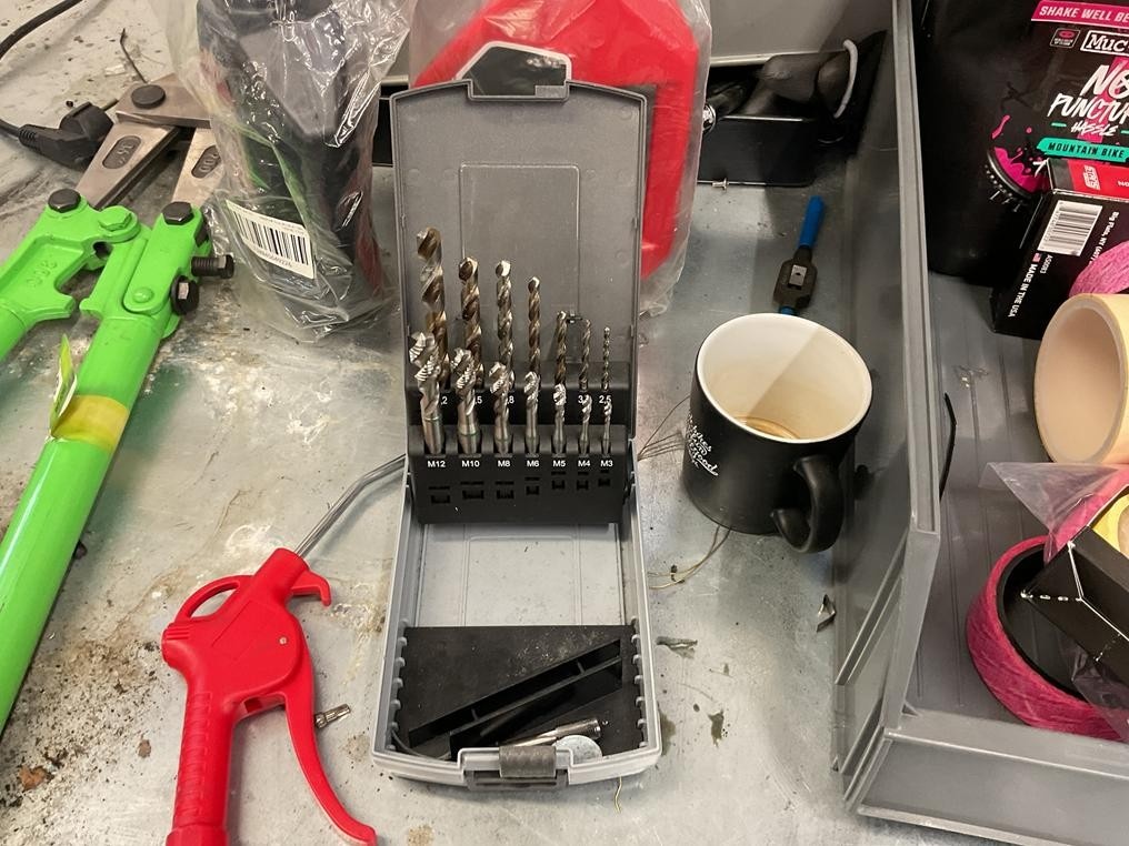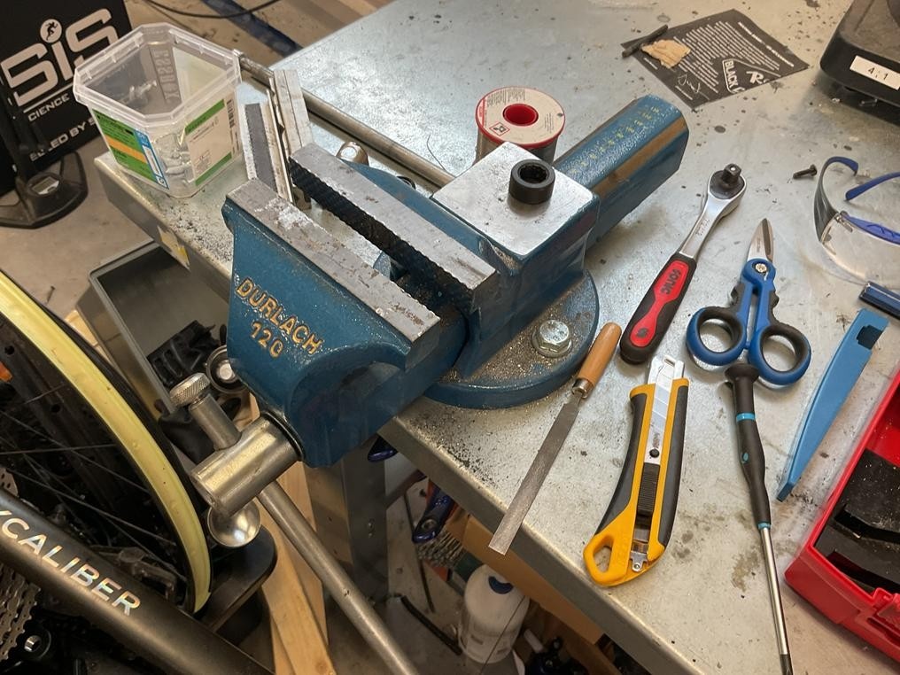 Myyntikohteet » 9. Seven Bikes Oy:n konkurssipesä, TAMPERE (3215327-1), 27.11.2025 » T12. Työpöytä viilapenkillä + pöydällä olevat poranterät ym. työkalut