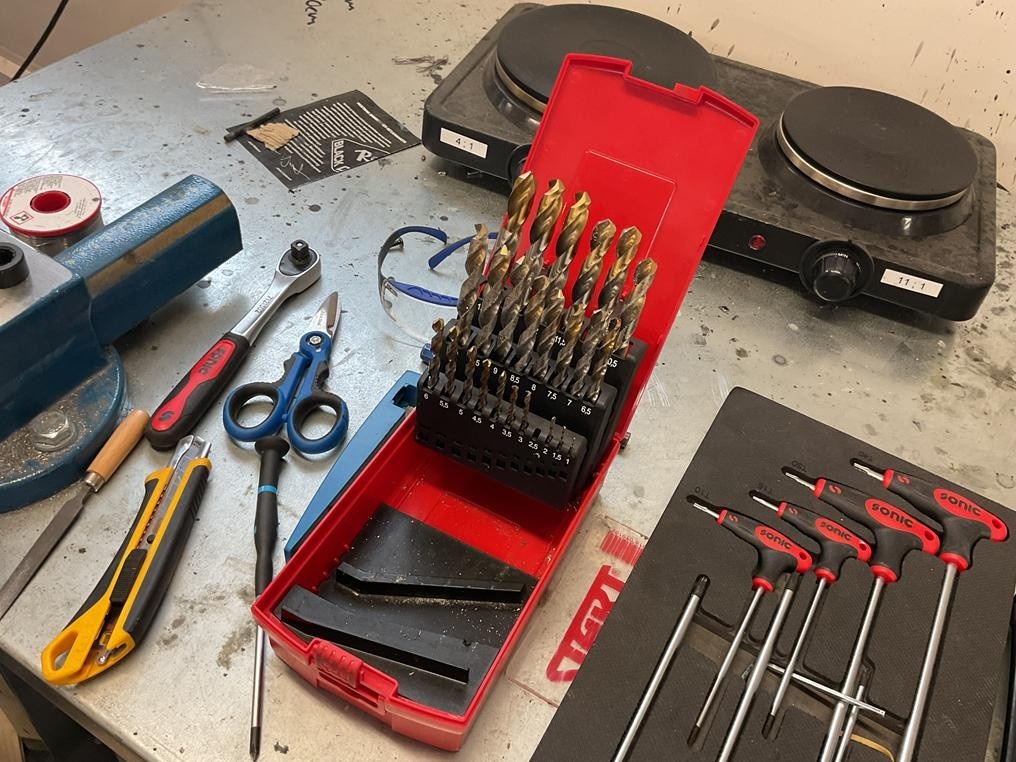 Työpöytä viilapenkillä + pöydällä olevat poranterät ym. työkalut