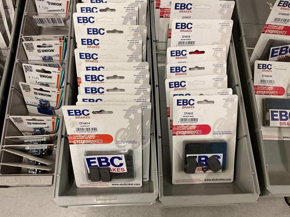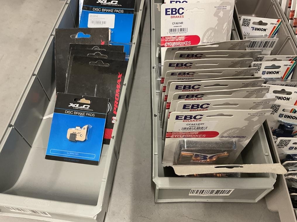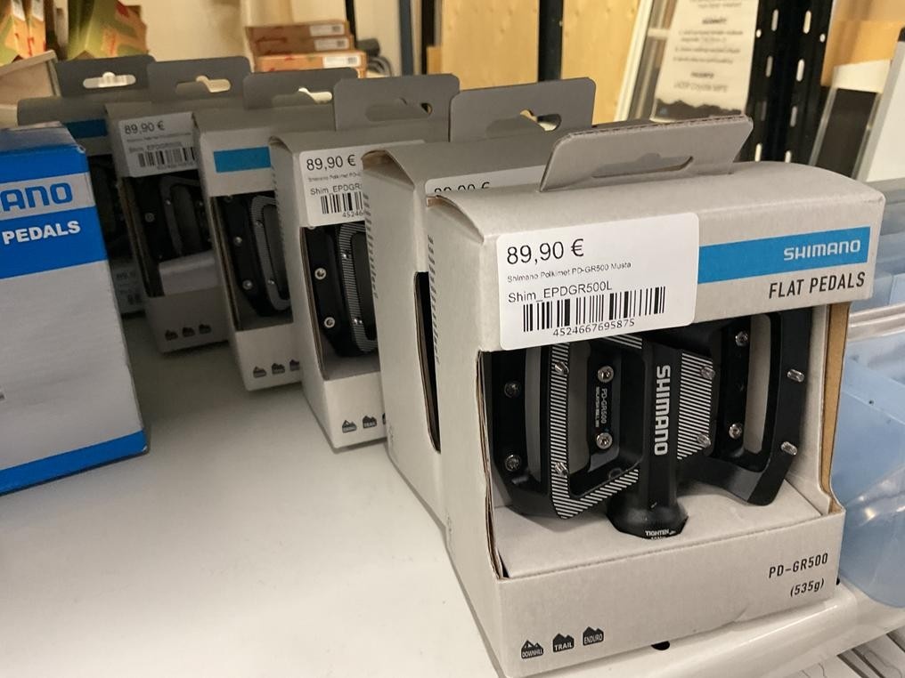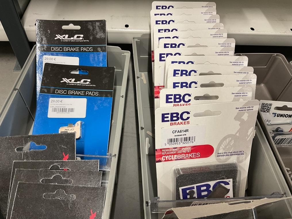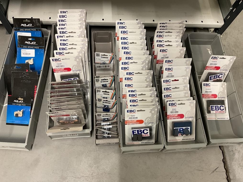 Myyntikohteet » 10. Seven Bikes Oy:n konkurssipesä, TAMPERE (3215327-1), 27.11.2025 » T58. 3-hyllytasolla ja lattialla olevat polkupyörien polkimet / jarrupalat EBC / Shimano yhteensä 103 kappaletta