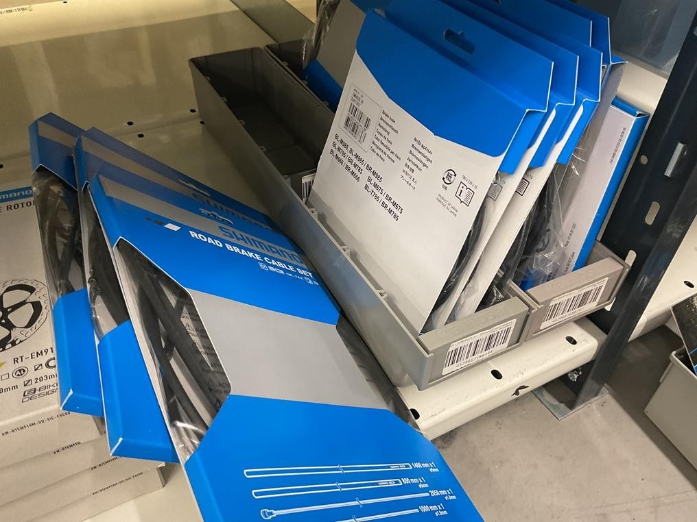 3-hyllytasolla olevat polkupyörien varaosat Shimano (jarrulevyt, jarruletkut) yhteensä 64 kappaletta