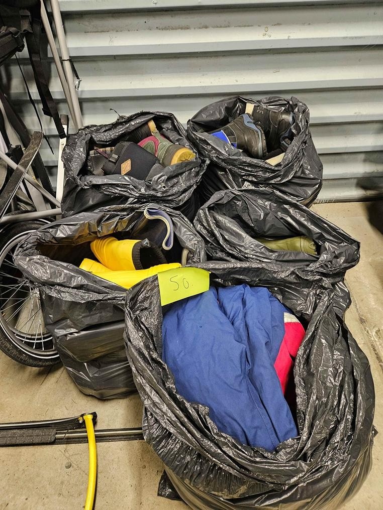 5 jätesäkillistä. Sisältää saappaita, talvikenkiä ja talvihaalareita (mm. Reima merkkisiä).