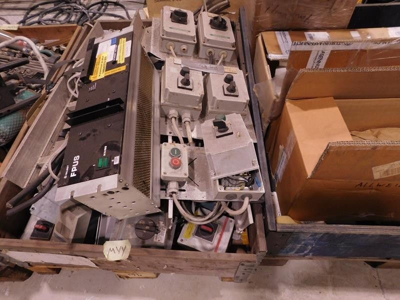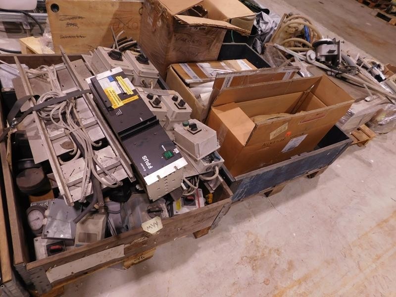 Erä sekalaisia varaosia ja tarvikkeita neljällä lavalla.