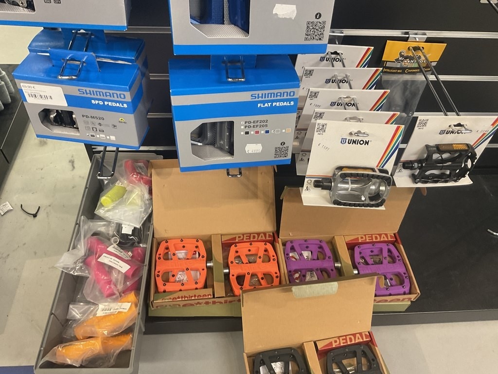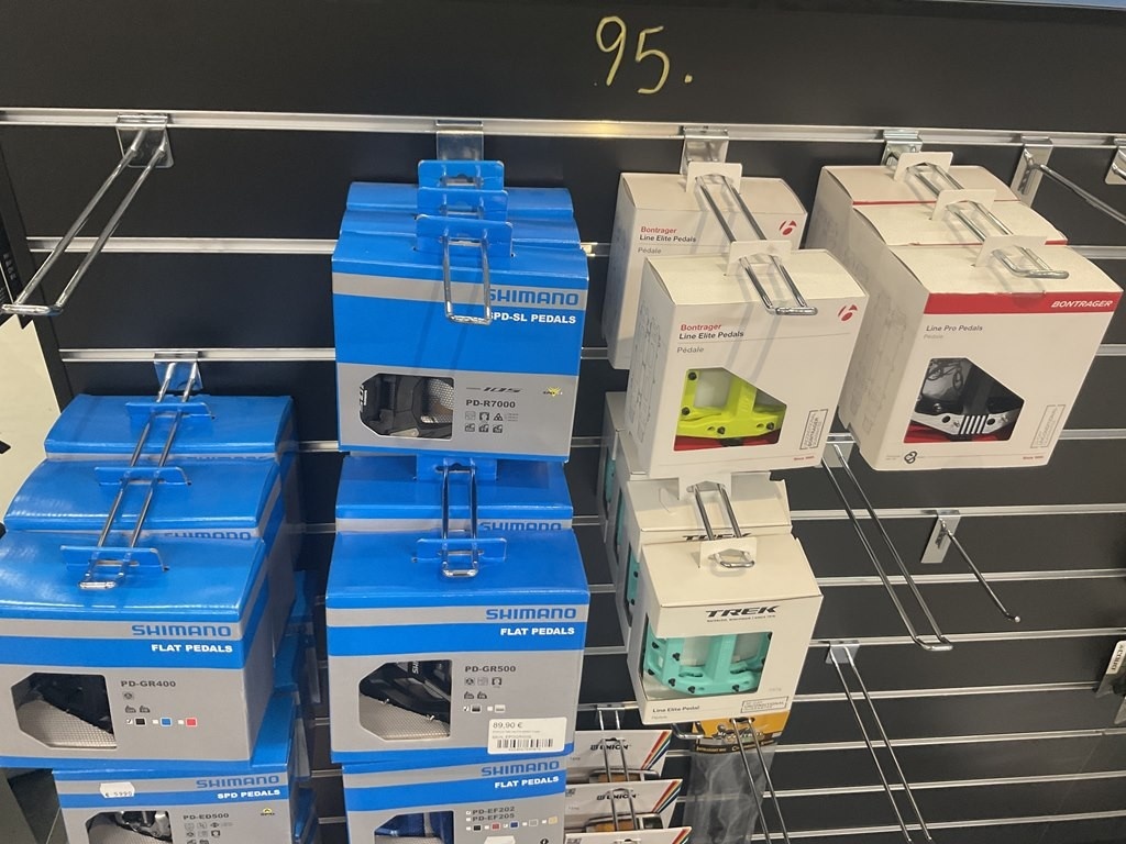 Myyntikohteet » 14. Seven Bikes Oy:n konkurssipesä, TAMPERE (3215327-1), 07.12.2025 » 095. Shimano polkimet – Trek / Bontrager - Wellgo -polkimet tuoteseinässä, yhteensä 37 tuotetta