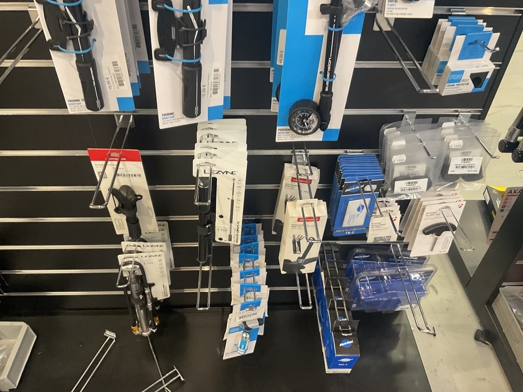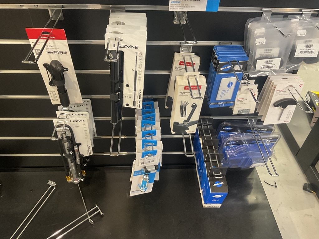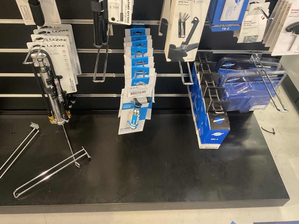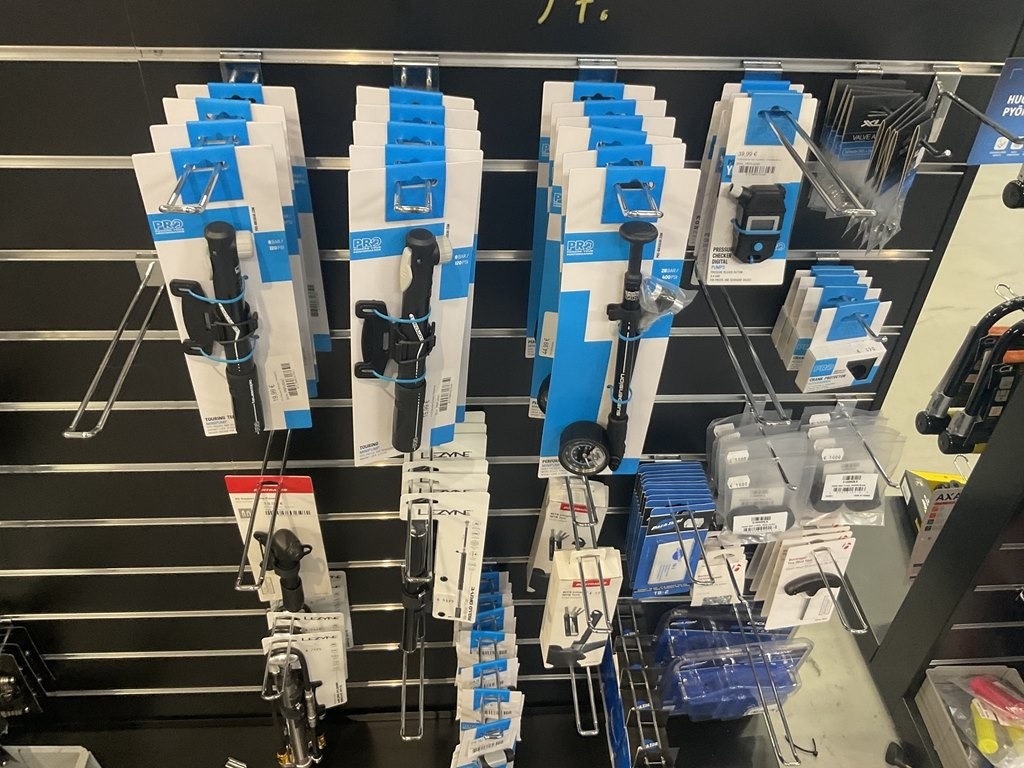 Myyntikohteet » 14. Seven Bikes Oy:n konkurssipesä, TAMPERE (3215327-1), 07.12.2025 » 097. Pro ja Lezynwe käsipumput, rasvat ja työkalut tuotehyllyssä, yhteensä 82 tuotetta