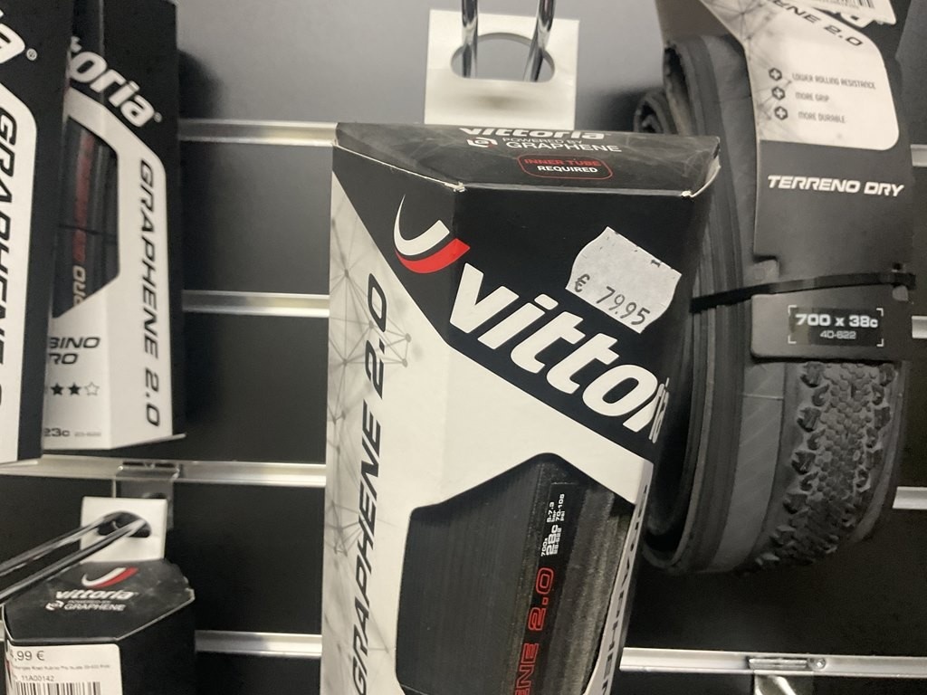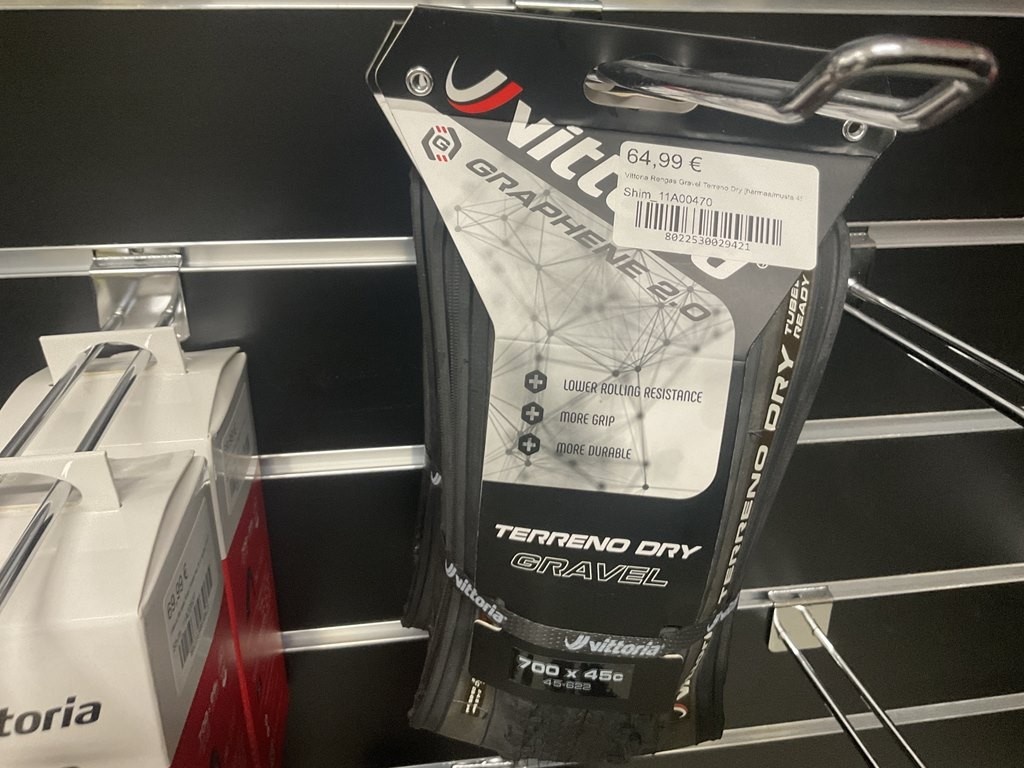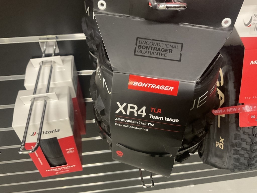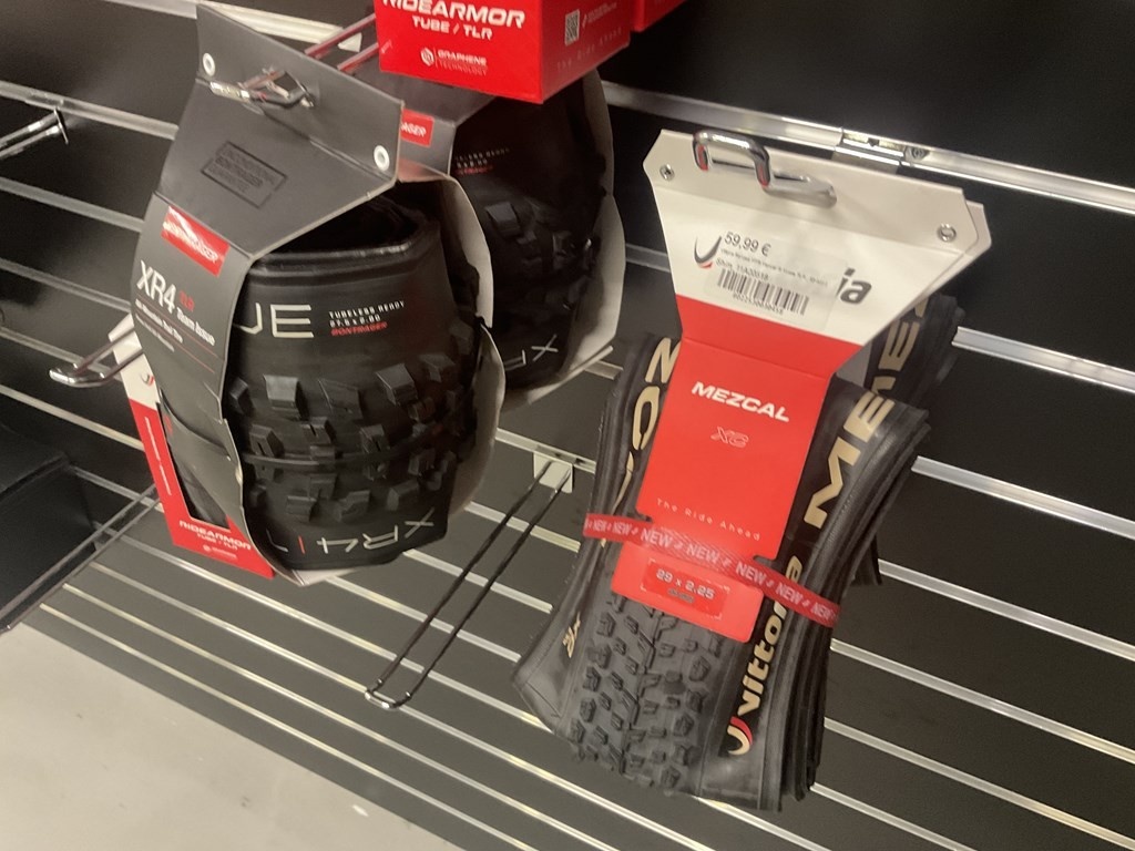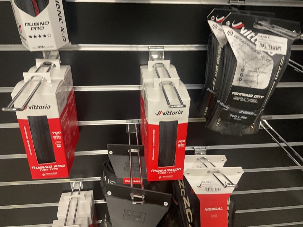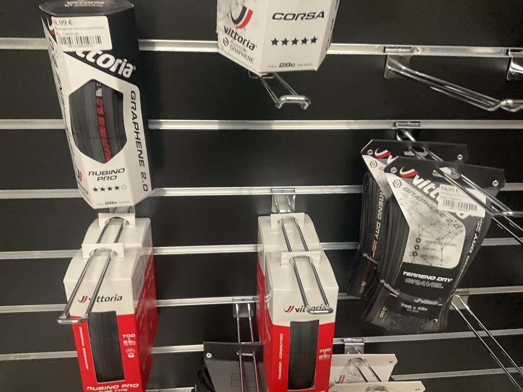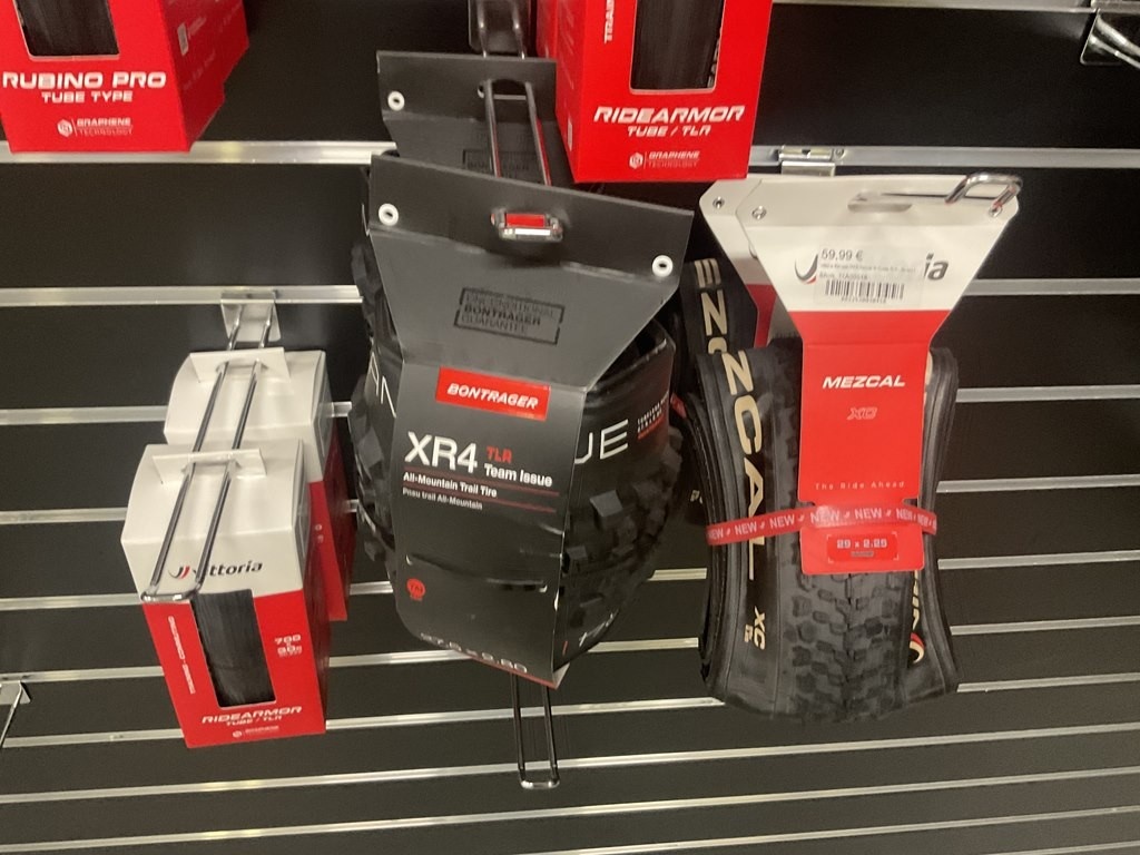 Myyntikohteet » 15. Seven Bikes Oy:n konkurssipesä, TAMPERE (3215327-1), 06.12.2025 » 141. Vittoria ja Bontrager -polkupyörän renkaat tuoteseinässä, yhteensä 18 kpl