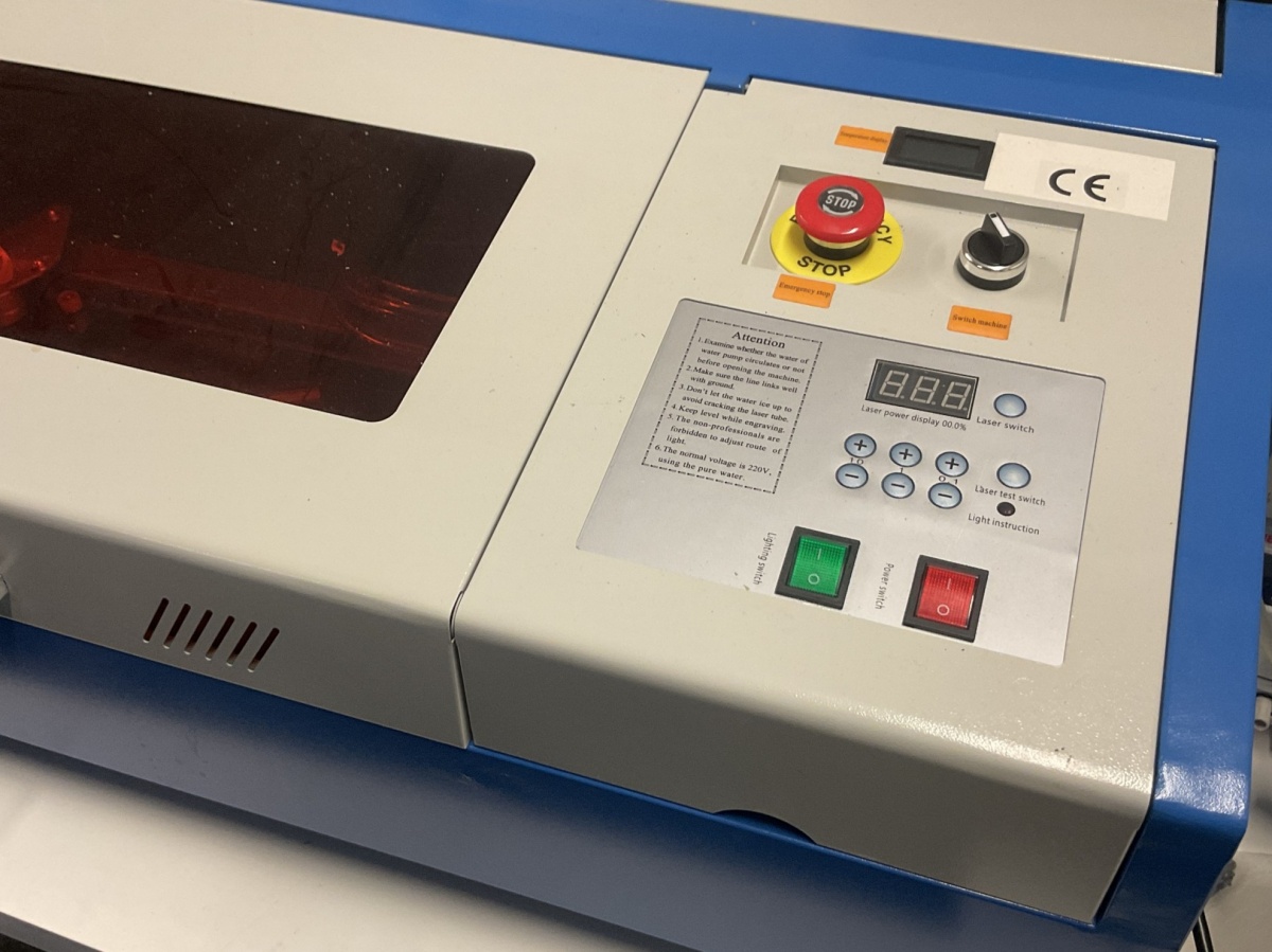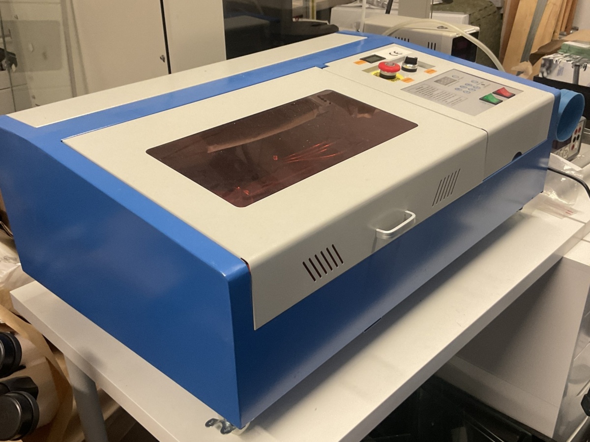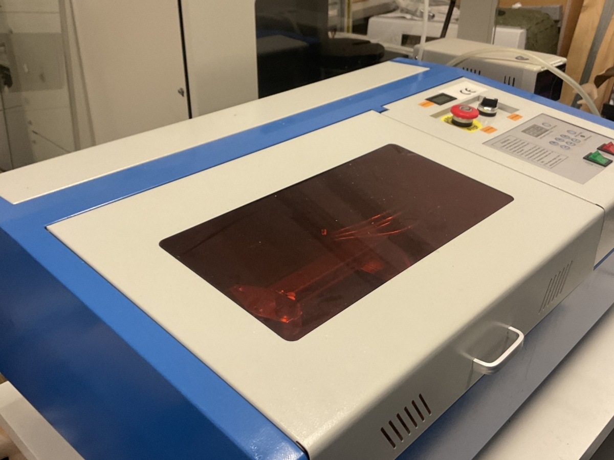 K40-luokan CO₂-laserleikkuri / laserkaiverrin n. 40 W CO₂ -laser, (käytetään mm. akryylin, puun, kartongin, kankaan ja joidenkin muovien leikkaamiseen ja kaivertamiseen.)