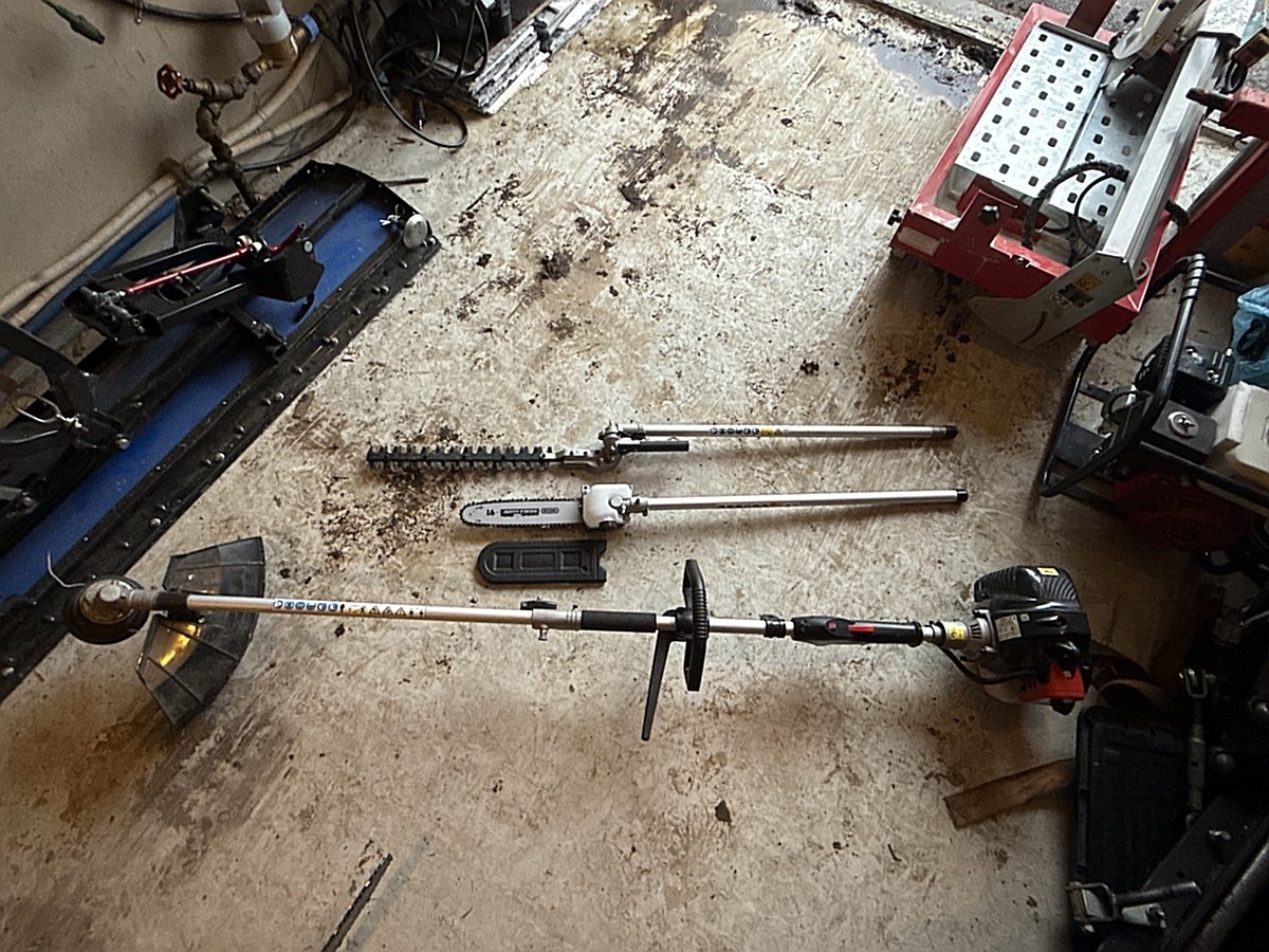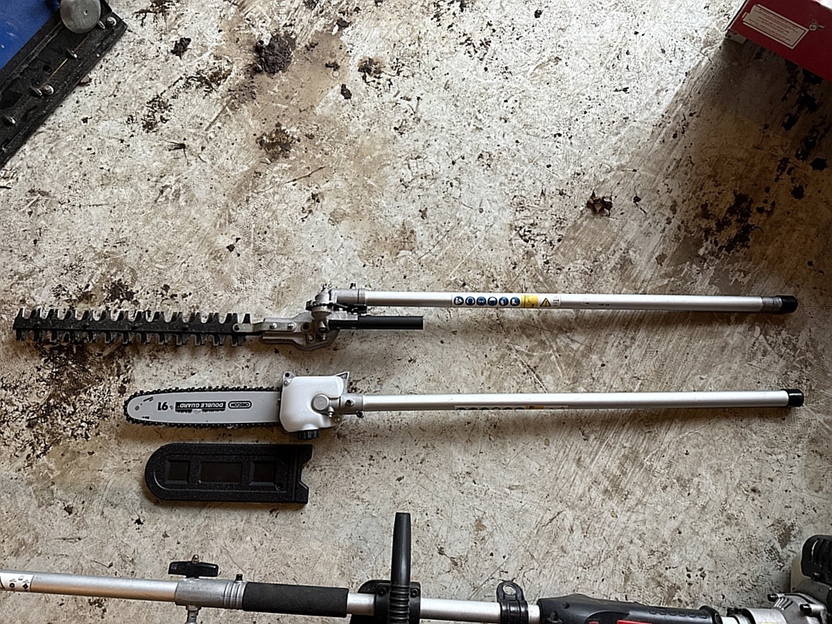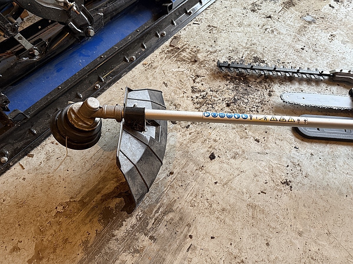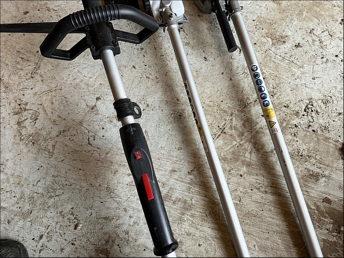 Ruohotrimmeri, raivaussaha ja varsisaha.