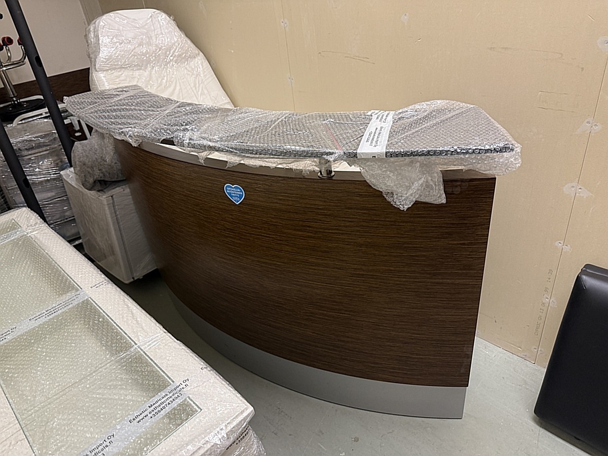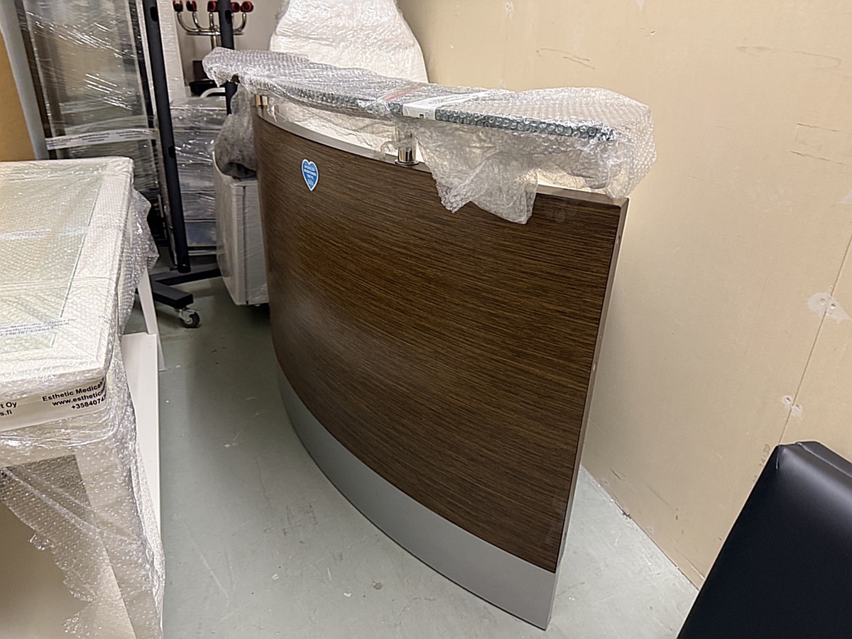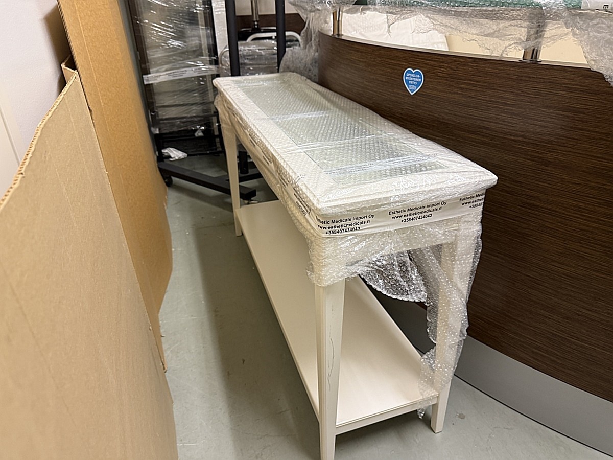 Kauneussalongin tuotteet, vastaanottotiski, hoitopöytä sähkösäädöillä, hierontapöydät yms.