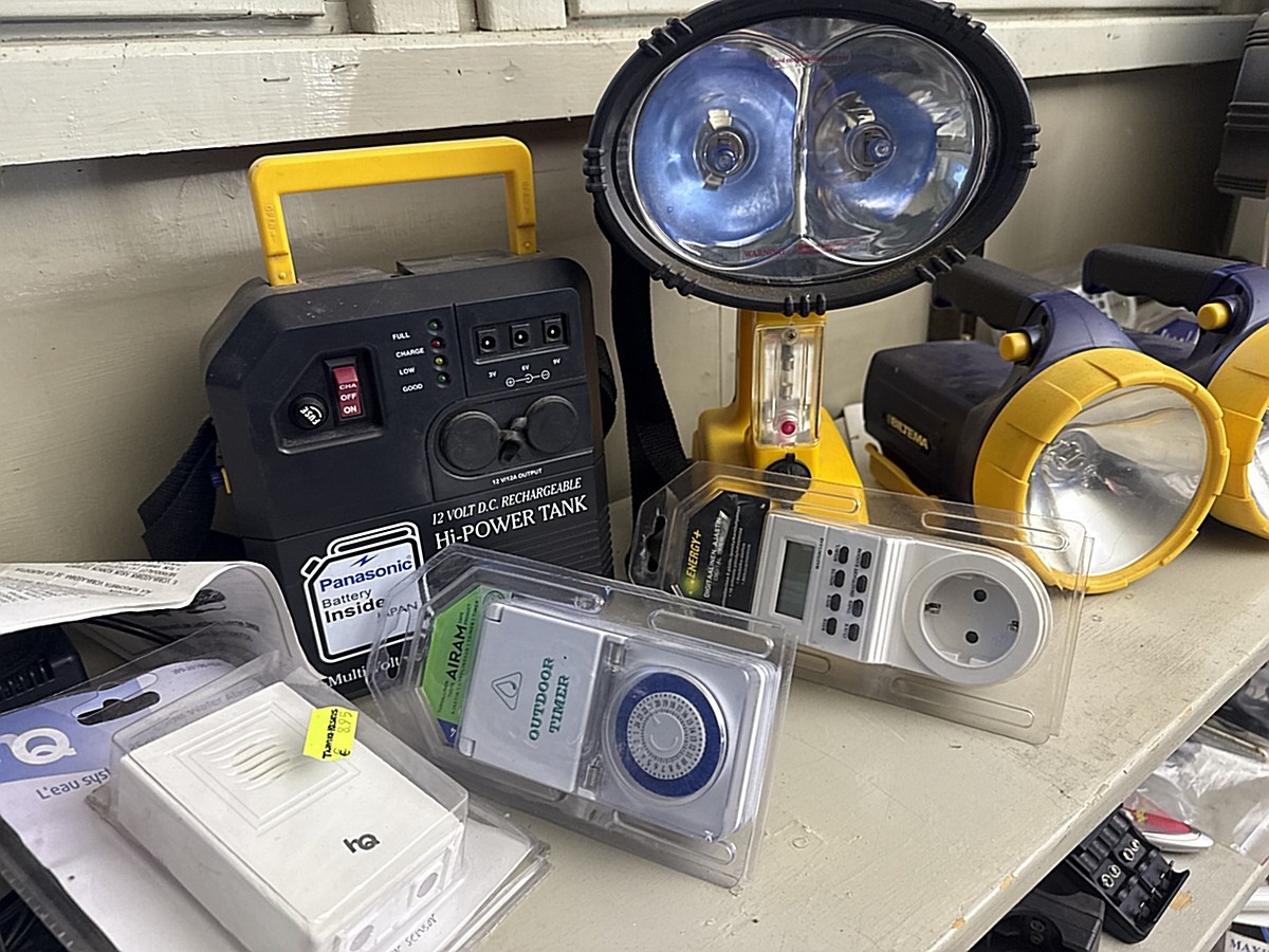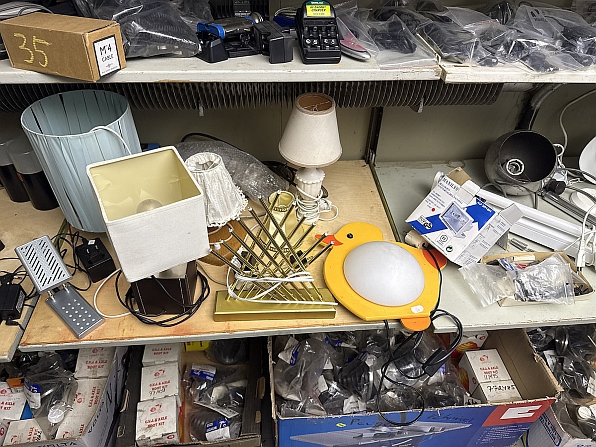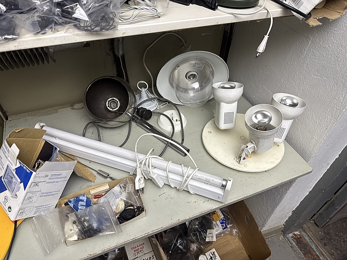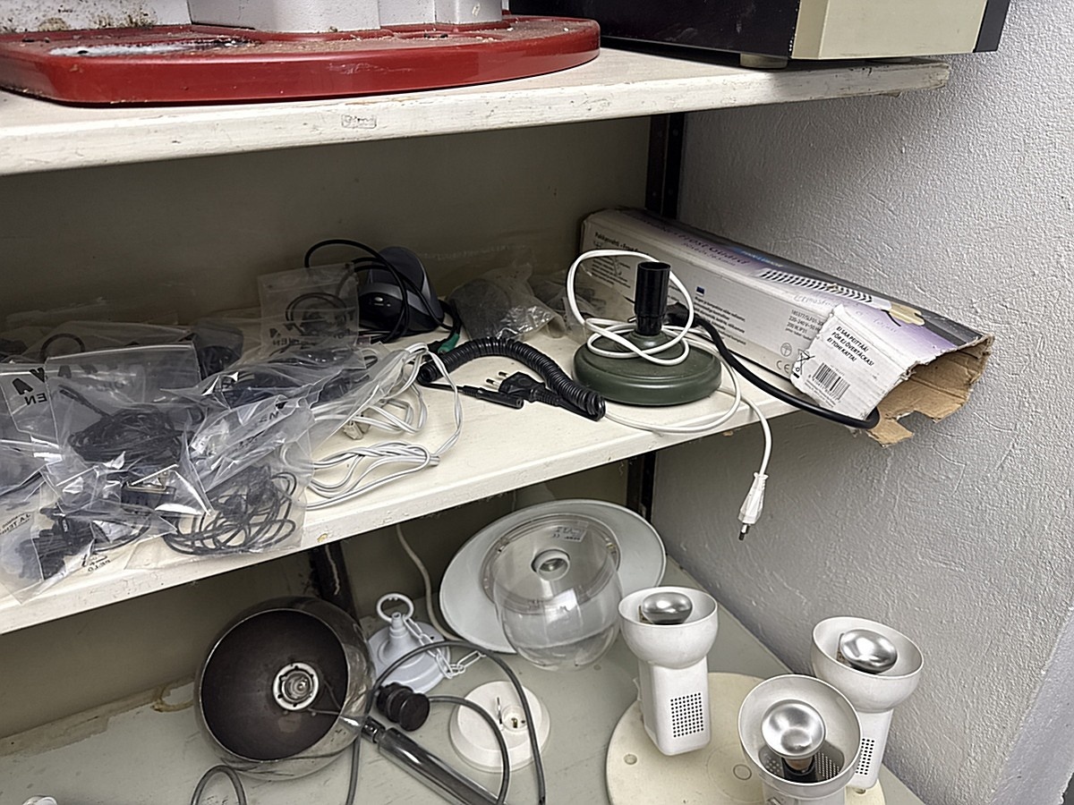 Hyllyn sekalaiset työkalut, varaosat ja tavarat