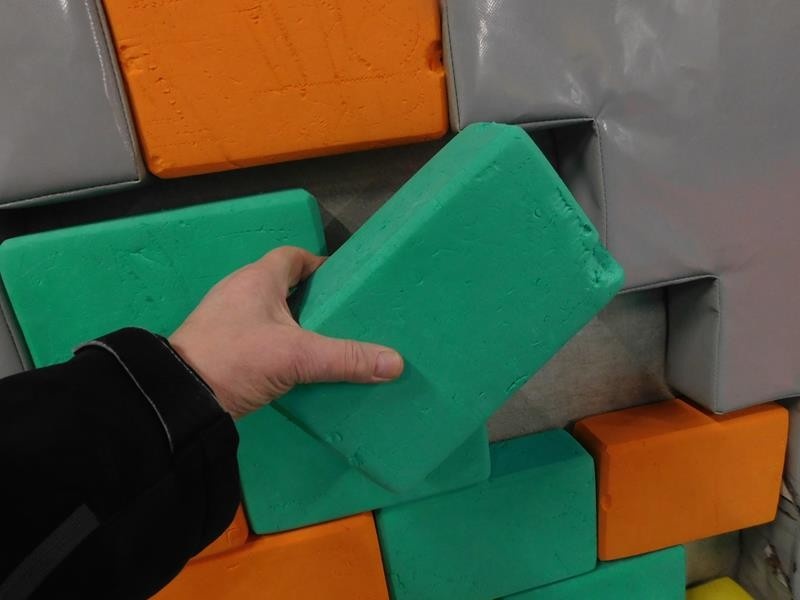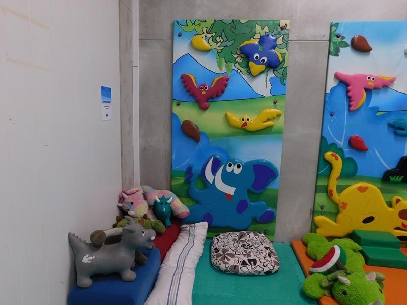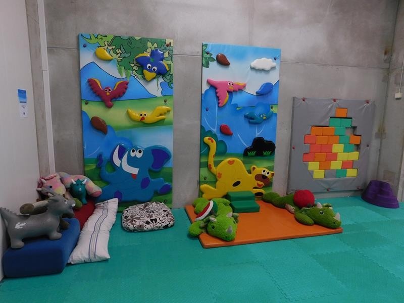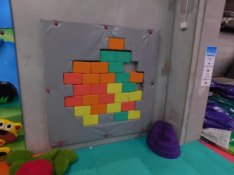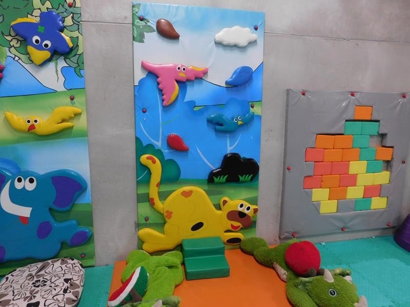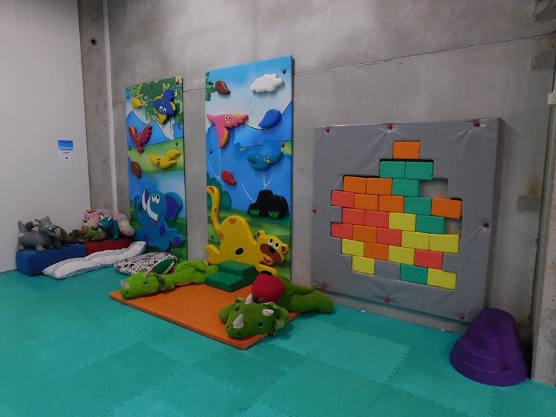 2 kpl pieniä kiipeilyseiniä, "tiiliseinä" pehmopalapeli ja erä pehmoleluja ja tyynyjä nurkkauksessa.