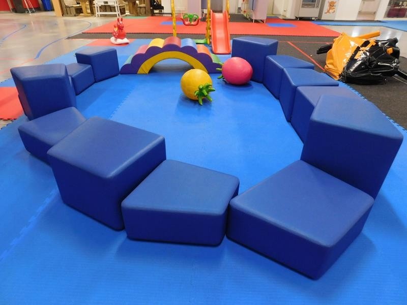 Iskun pehmojakkarat 13 kpl, pomppupallot 2 kpl sekä pehmeä kaarisilta.