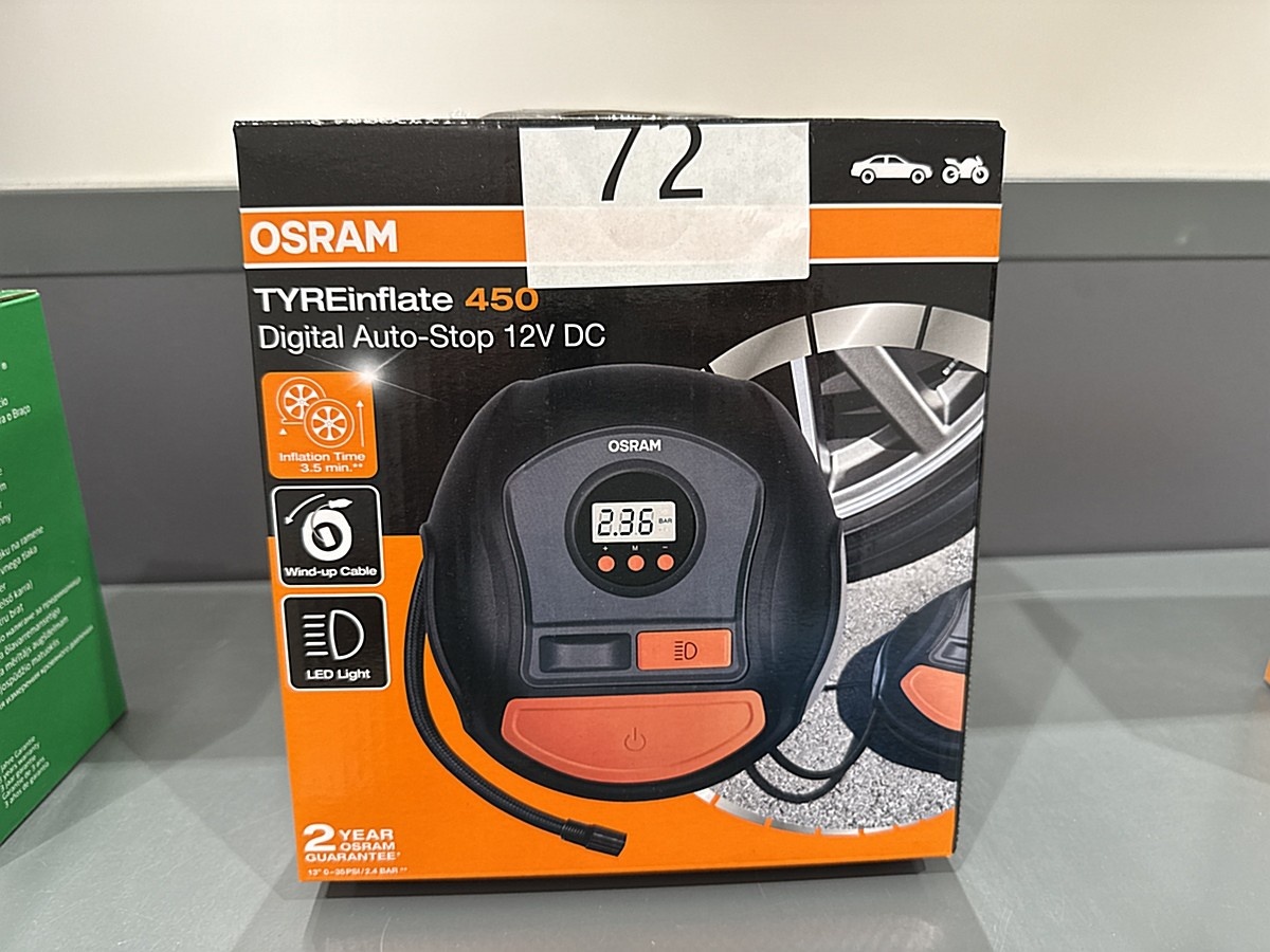 12 V pistokkeeseen liitettävä nopea Osram-ilmakompressori täyttää 13” renkaan tyhjästä 2.4 bariin noin 3,5 minuutissa. Erittäin helppokäyttöinen, pumppu täyttää renkaan automaattisesti asetettuun paineeseen. Monikäyttöinen, soveltuu myös pyörän renkaiden tai pallojen pumppaukseen.