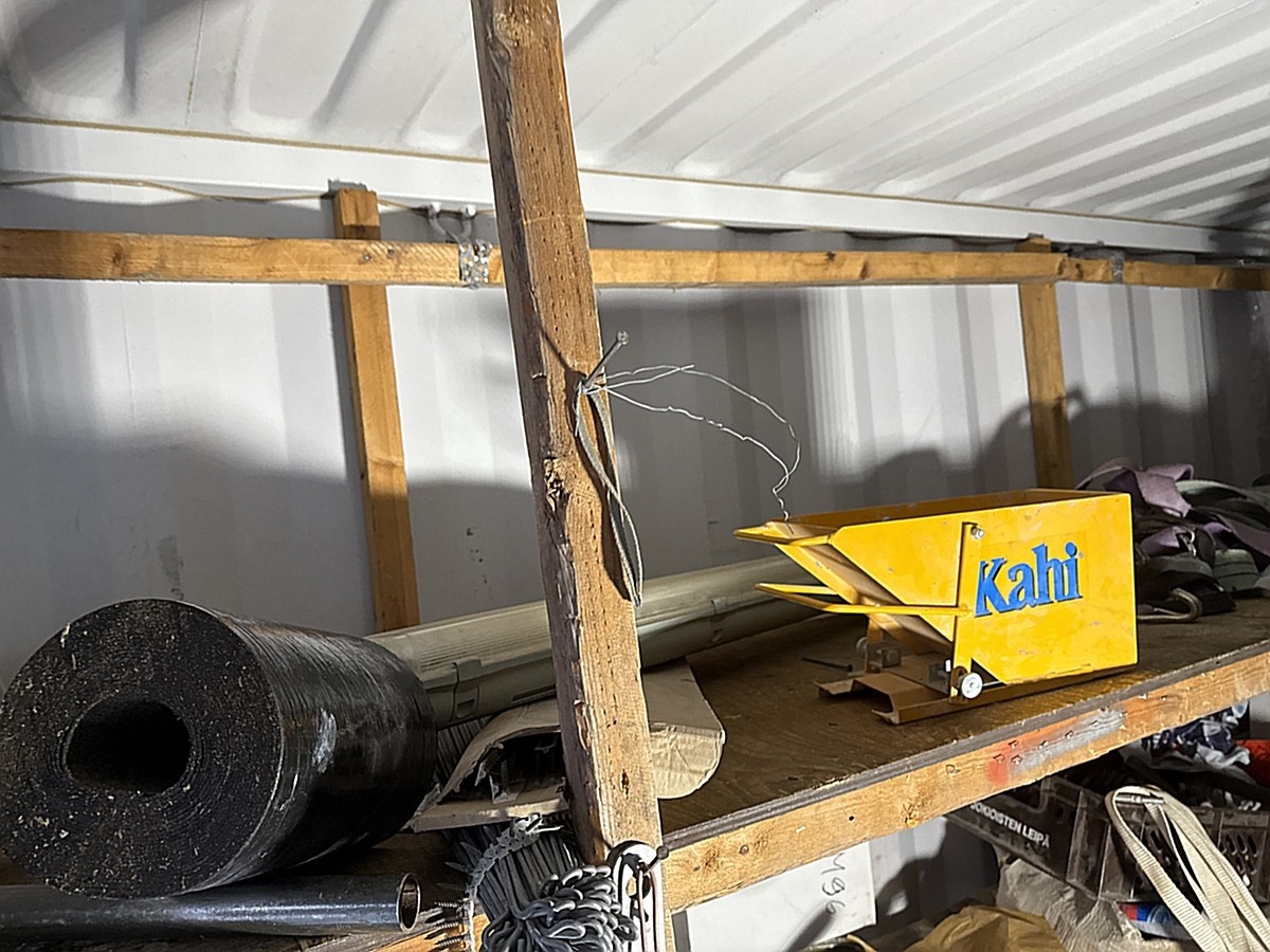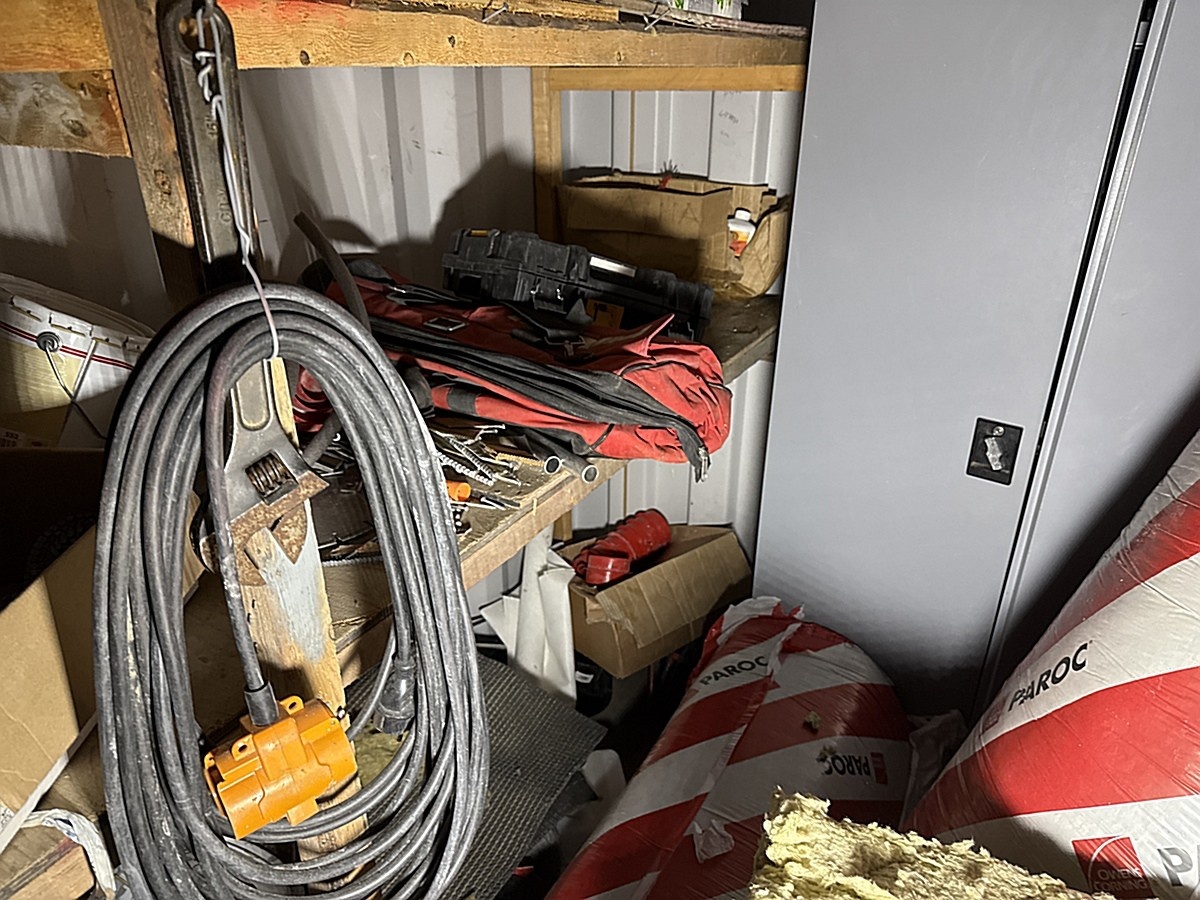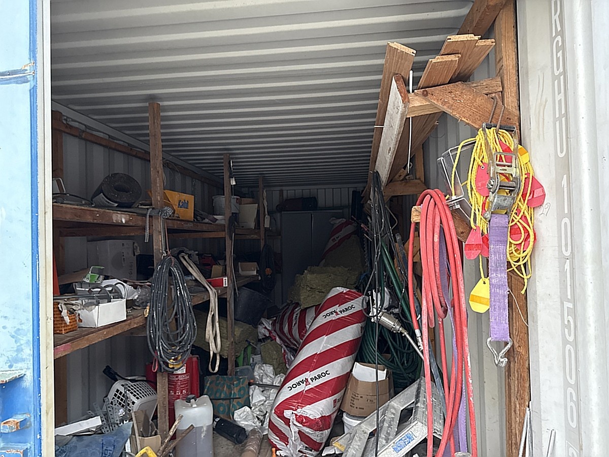 Merikontin sisältö mm. Levyhissi, Wiben työpukki, sekalaiset työkalut ja tarvikkeet.