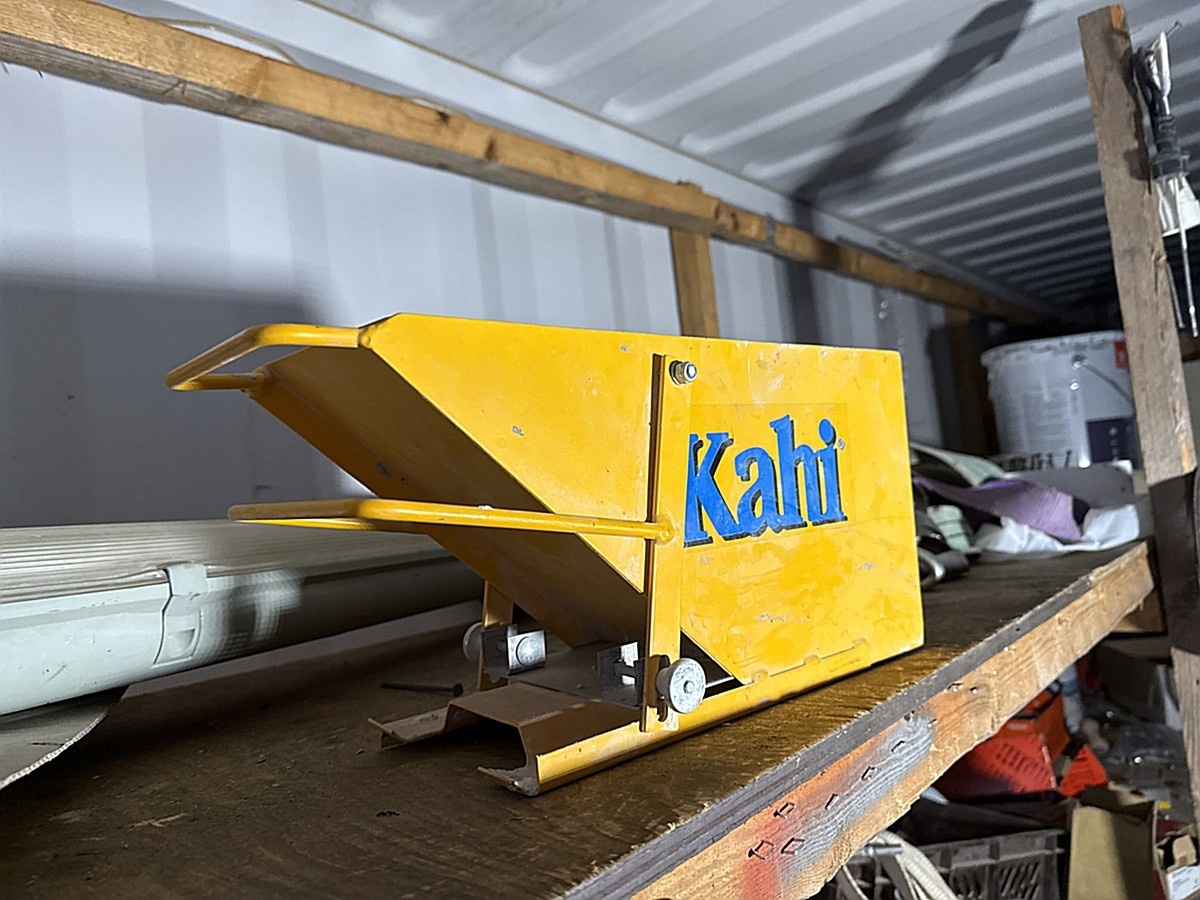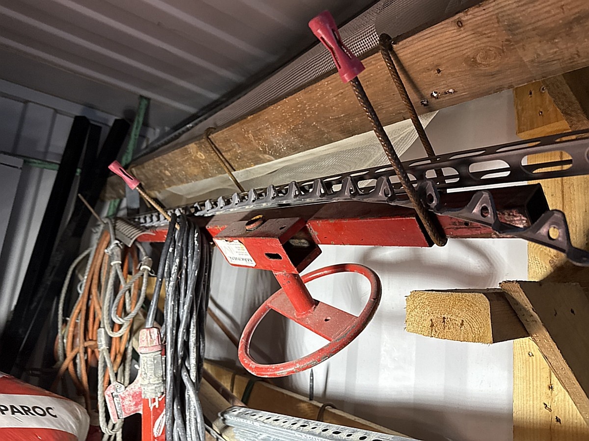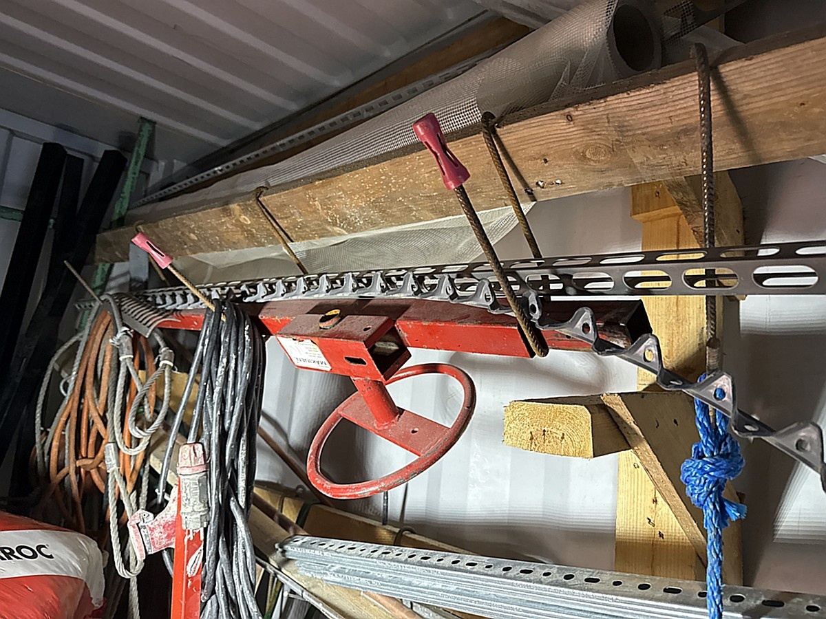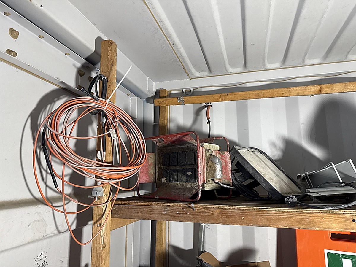Merikontin sisältö mm. Levyhissi, Wiben työpukki, sekalaiset työkalut ja tarvikkeet.