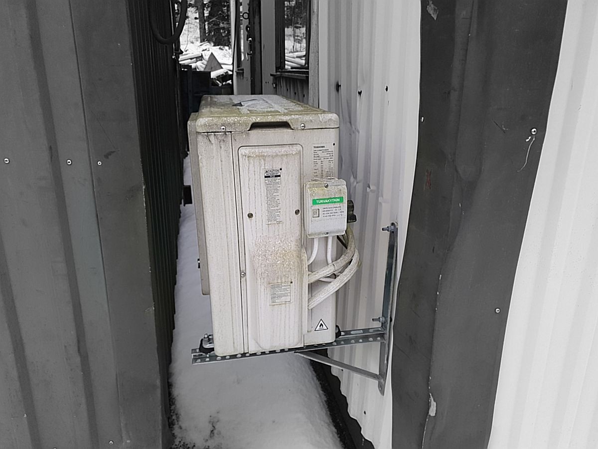 - mitat, ulko: pituus m, leveys 3.7 m / 4.1 m ilmalämpöpumppu asennettuna, korkeus 3.4 m