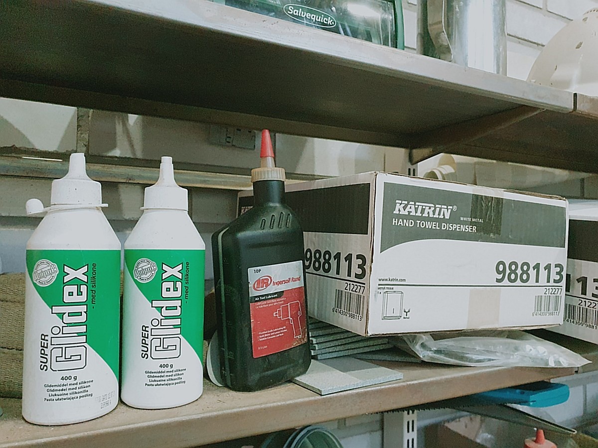 Hyllyn tavarat (ensiapuasema, käsipaperitelineet, opastekyltit ym)