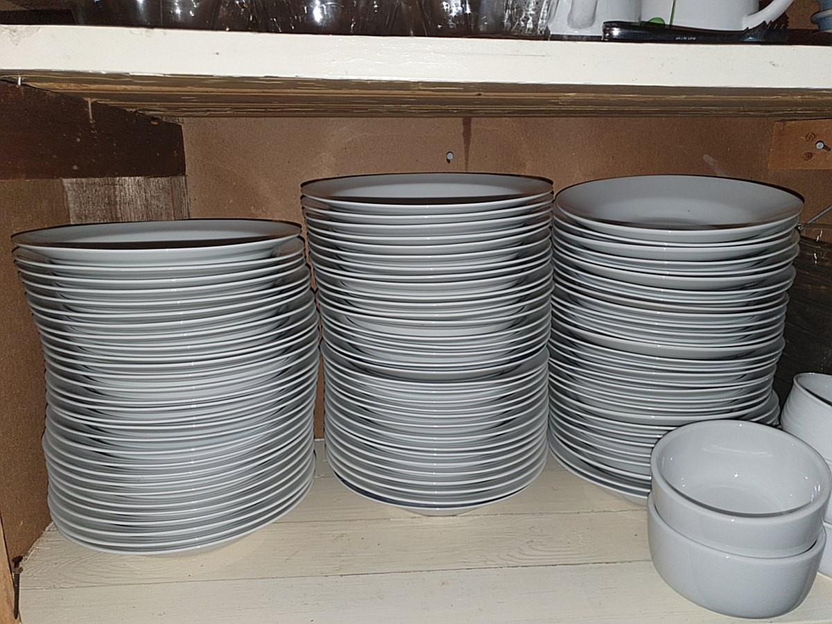 Lasit, lautaset, kahvikupit, kulhot (n. 100 hengelle)