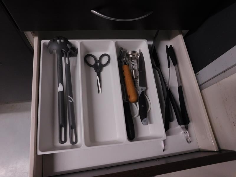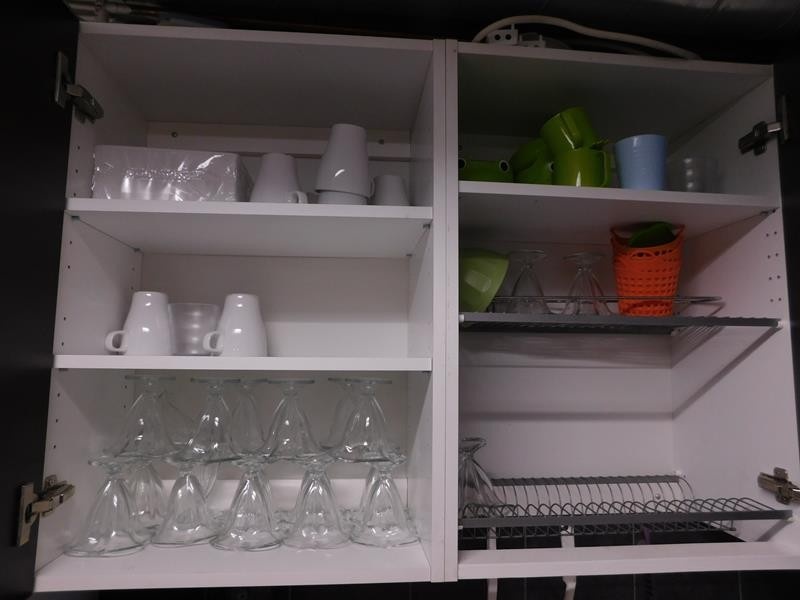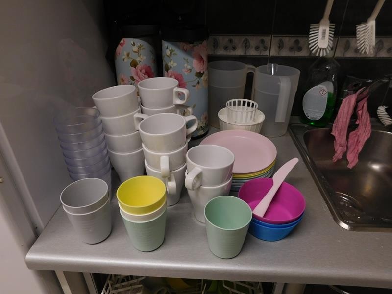 Lasipikarit, keittiötasolla ja koneessa olevat astiat, ruokailuvälineet, mikro, keitin, astiakori.