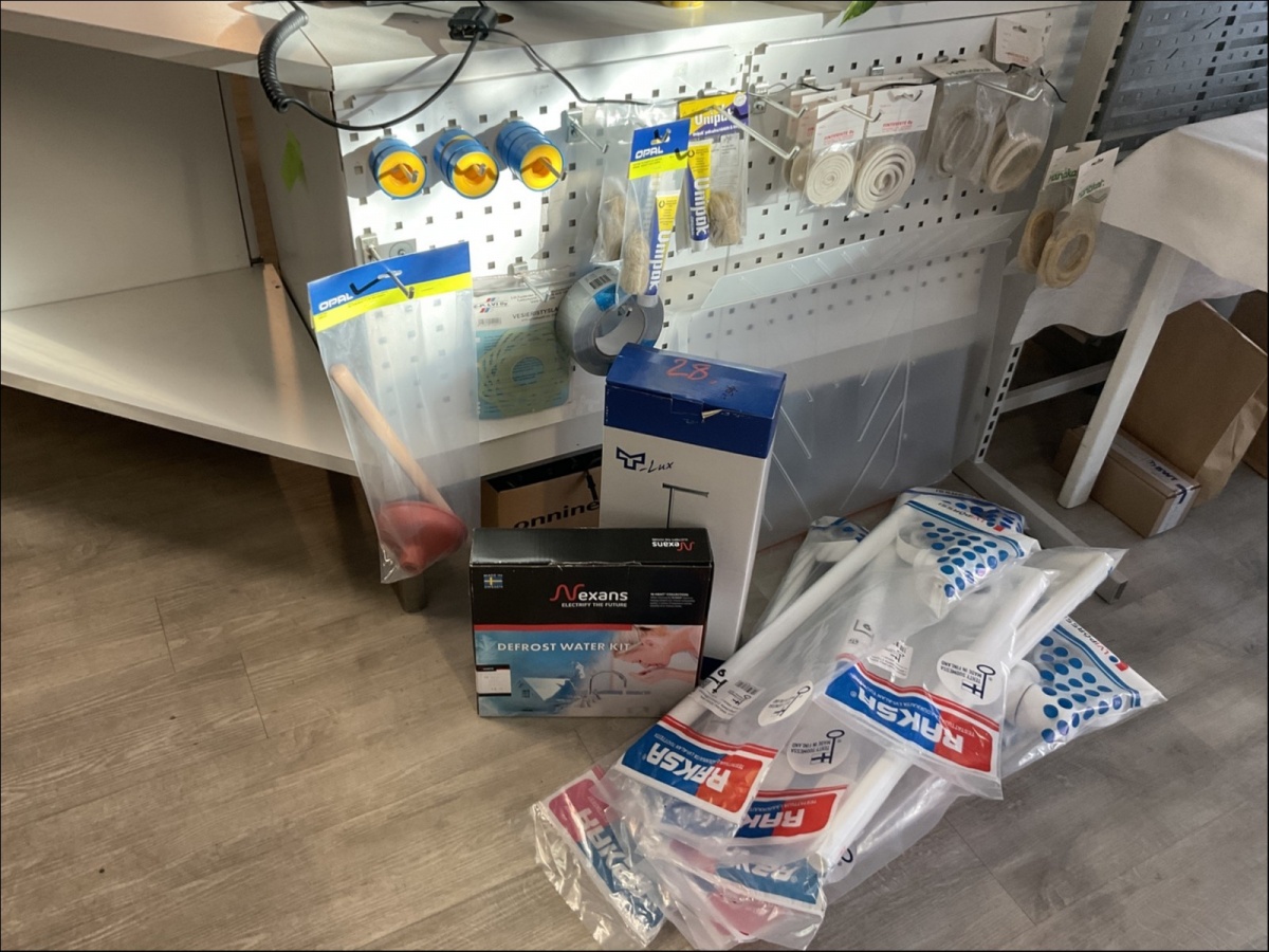Suojatulpat, putkitiivisteet ja tiivisterenkaat, kierretiivistysmateriaalit, karhupumppu, sulanapitokaapeli ja viemäröintisarjat