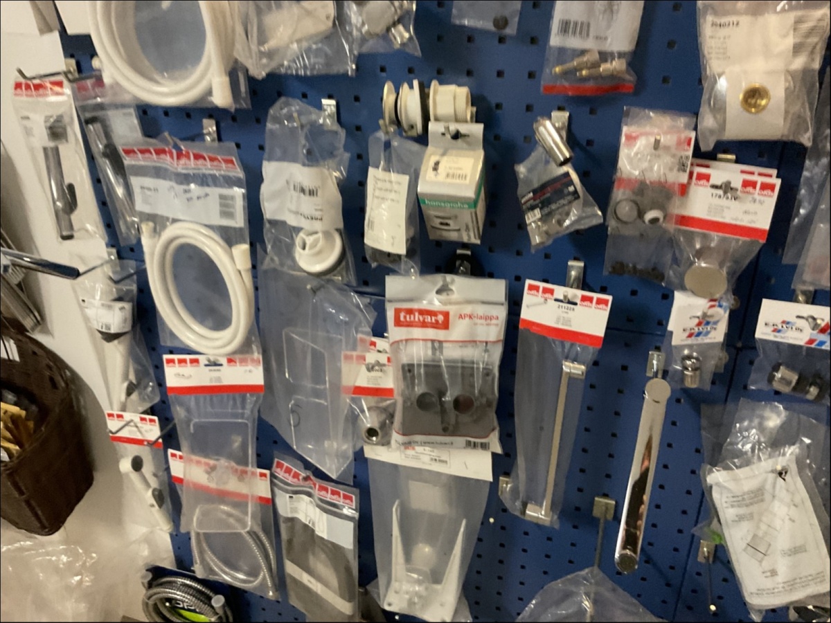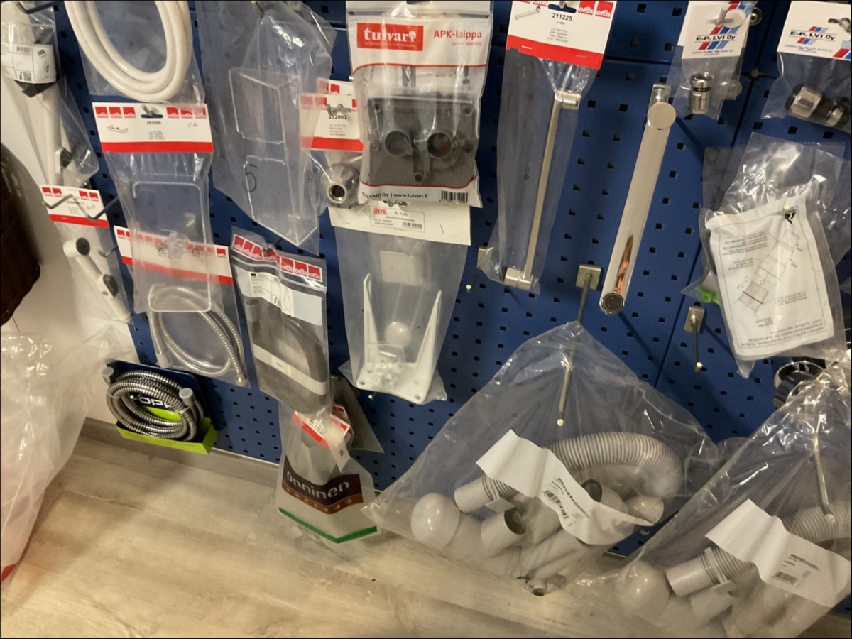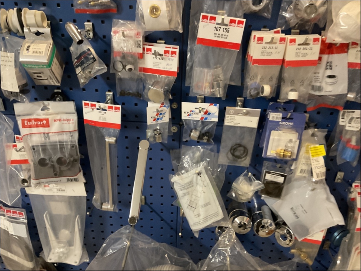 1. Tiivisteet, O-renkaat, tulpat, kierre- ja letkuliittimet, vesilukot, liitosletkut, WC:n ja pesualtaan varaosat, kiinnitysruuvit ja -sarjat, peitelevyt ym.