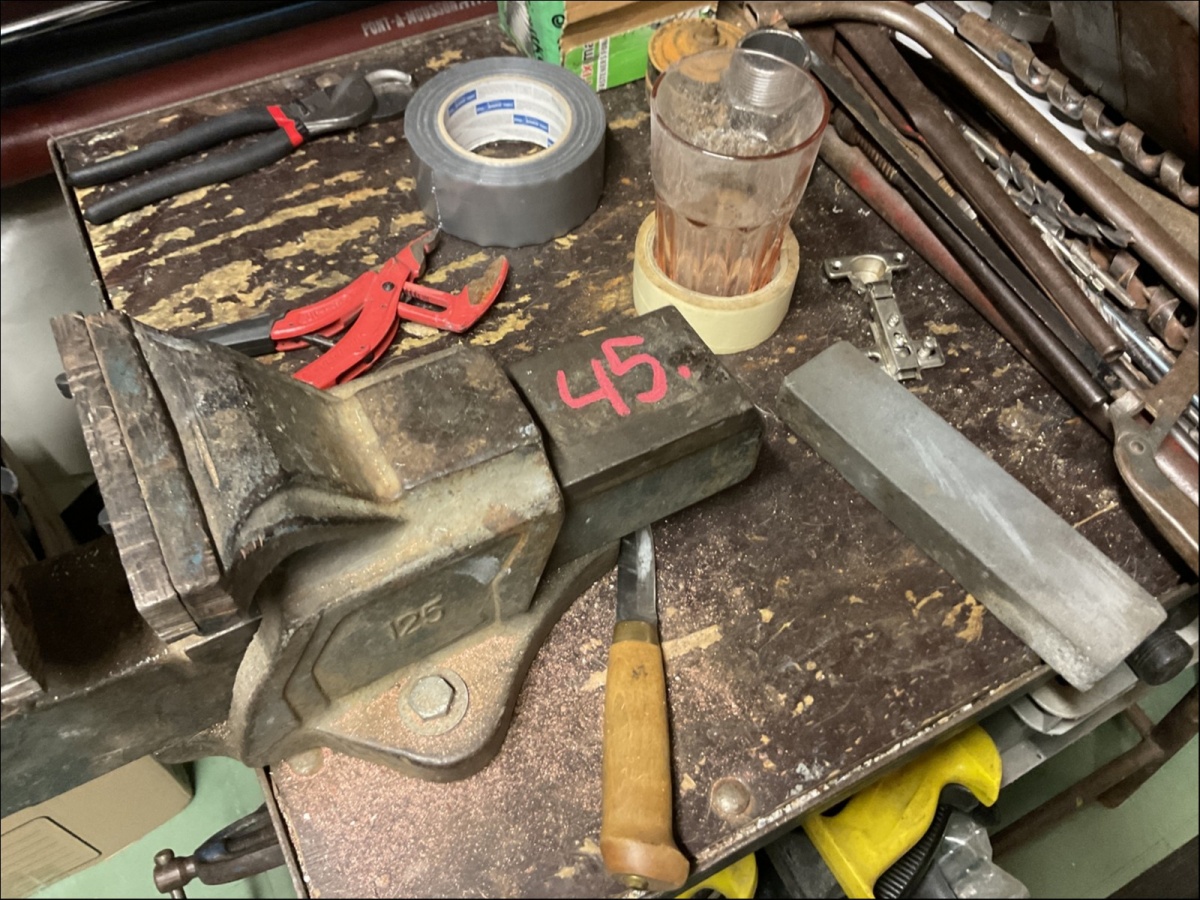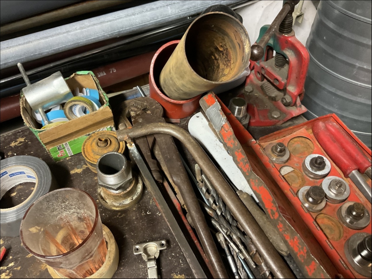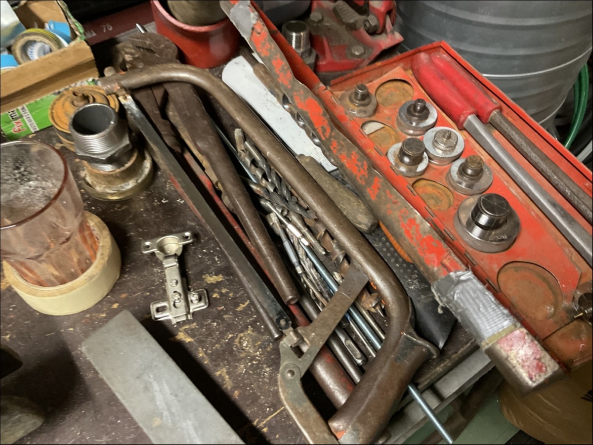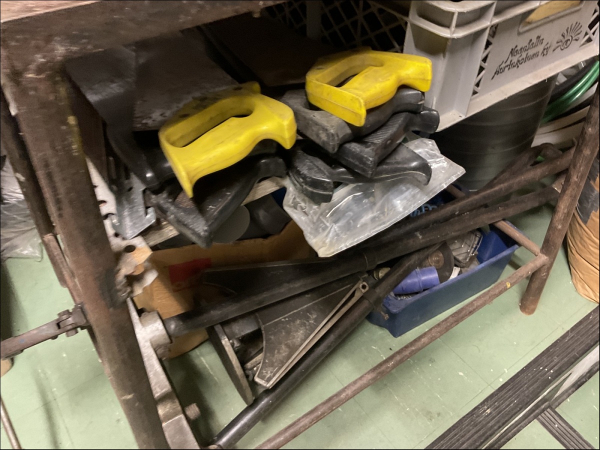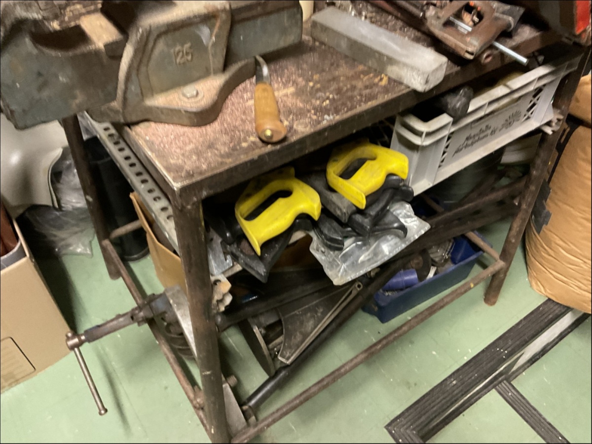 Teräsrunkoinen työpöytä ruuvipenkillä, sahat ja muut käsityökalut ja tarvikkeet