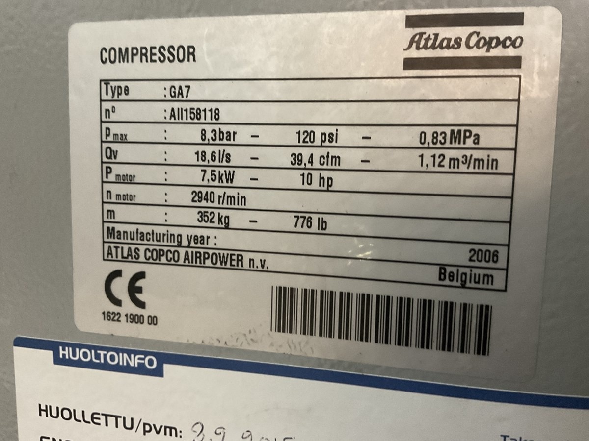 Myyntikohteet » Kiinteistö ja Sijoitus Laakso Oy:n konkurssipesä, KARKKILA, 12.02.2026 » 18. Atlas Copco GA 7 FF -ruuvikompressori
