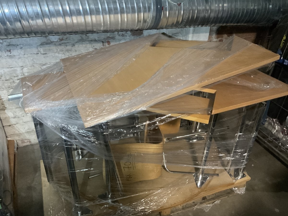 1. Metallijalkaiset pöydät ja tuolit kuormalavalla