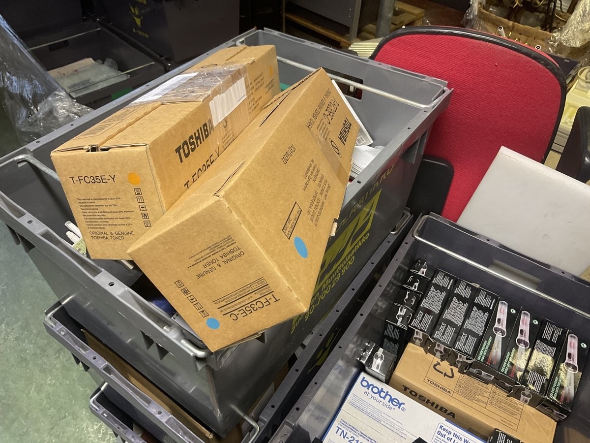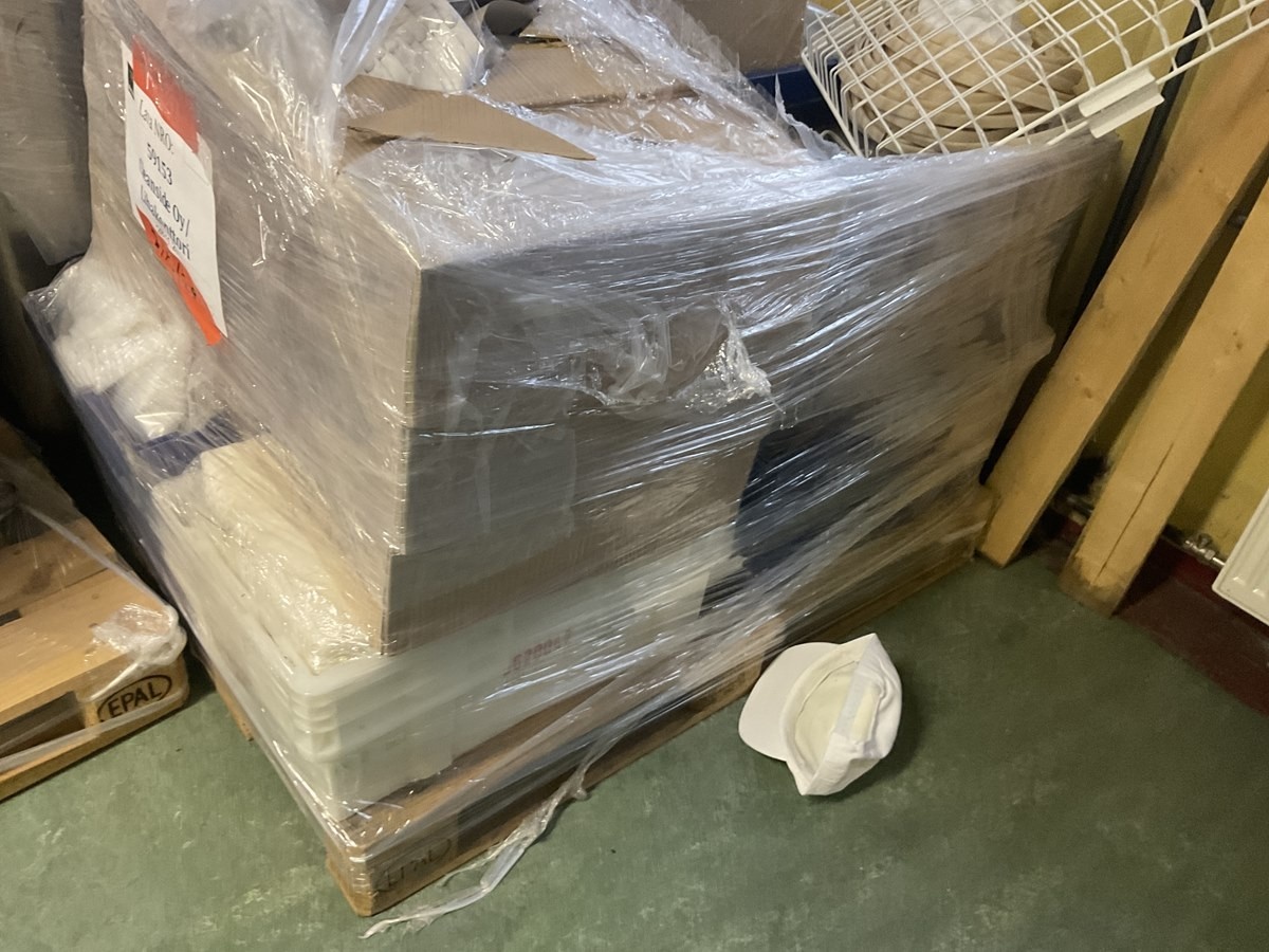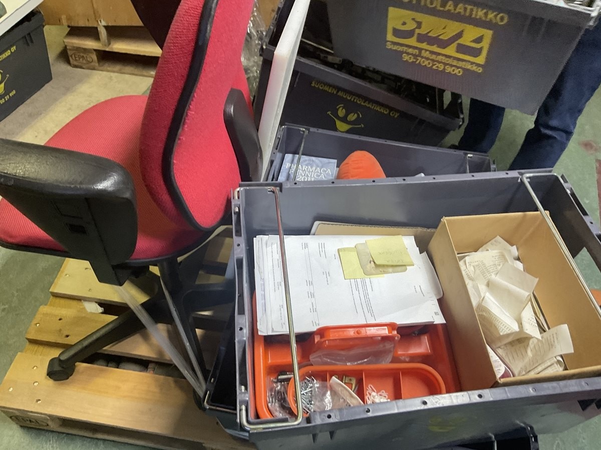 2. Kuormalavalla toimistotuoli ja toimistotarvikkeita