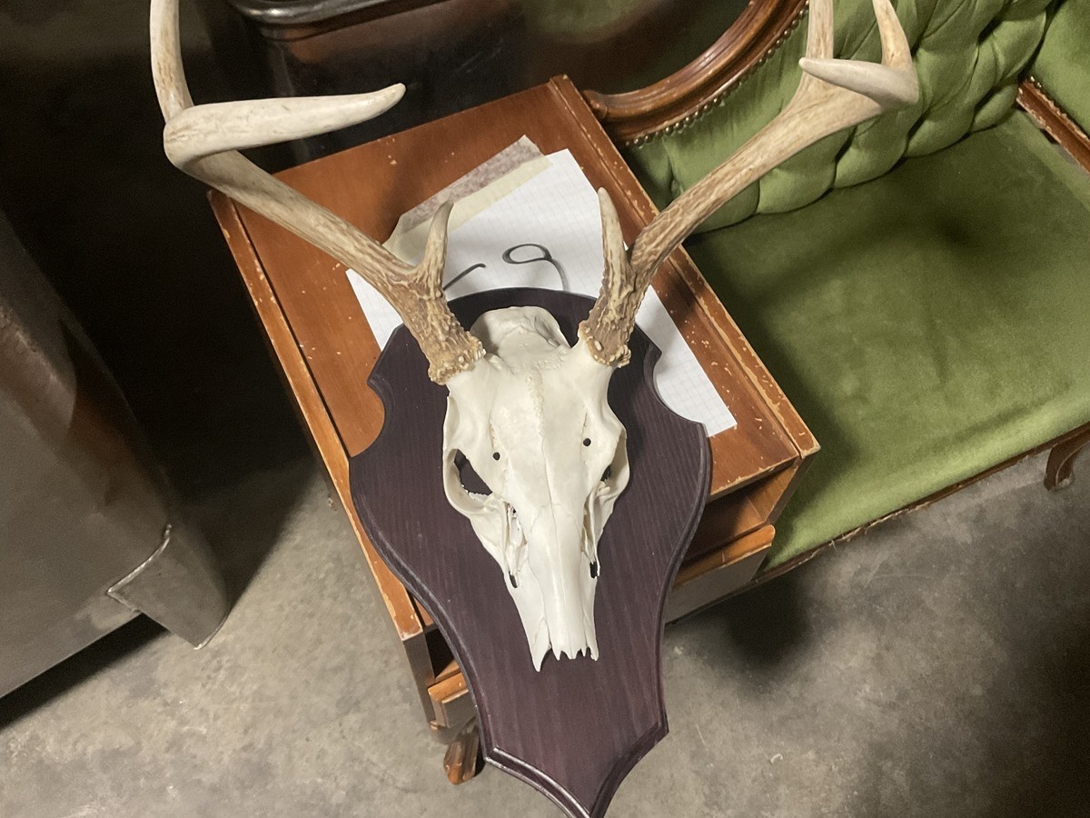 Myyntikohteet » Kiinteistö ja Sijoitus Laakso Oy:n konkurssipesä, KARKKILA, 12.02.2026 » 88-89. Täytetty kauris / peuran pää + sarvet. Täytetty peuran pää (trofee) – seinälle asennettava metsästystrofee. Kaksi peuran kallotrofeeta sarvineen – kiinnitettyinä puualustoihin.