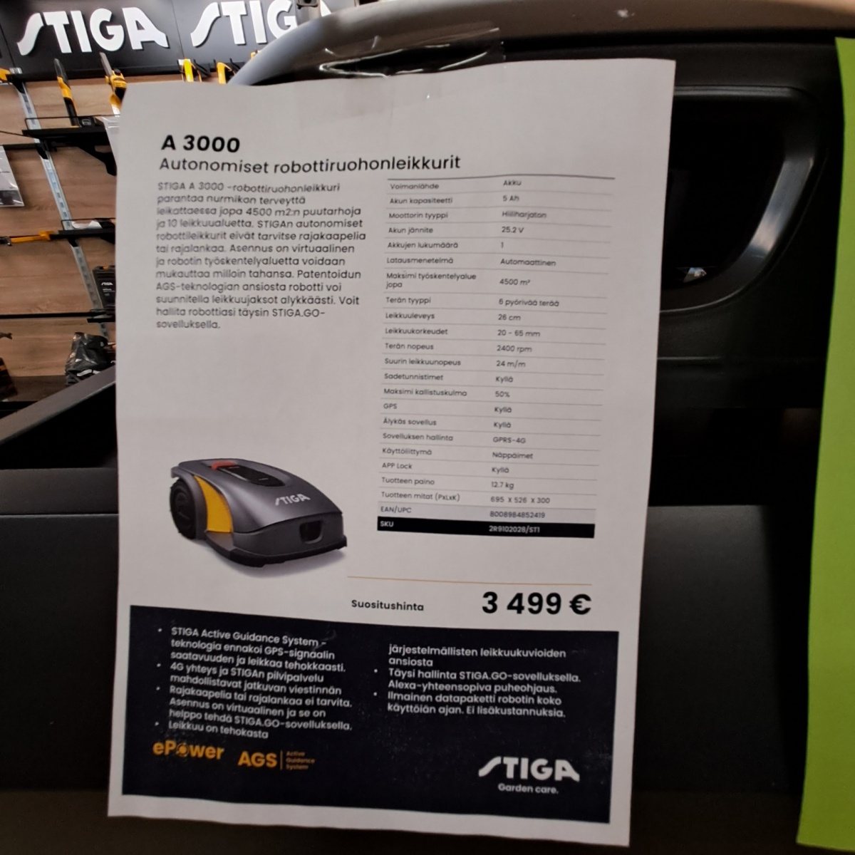 Myyntikohteet » 1. Outokummun Pienkone Oy:n konkurssipesä, OUTUKUMPU (3333390-1), 14.02.2026 » 09. Robottiruohonleikkuri Stiga A 3000, Max. työskentelyalue 4500 m² (UUSI)