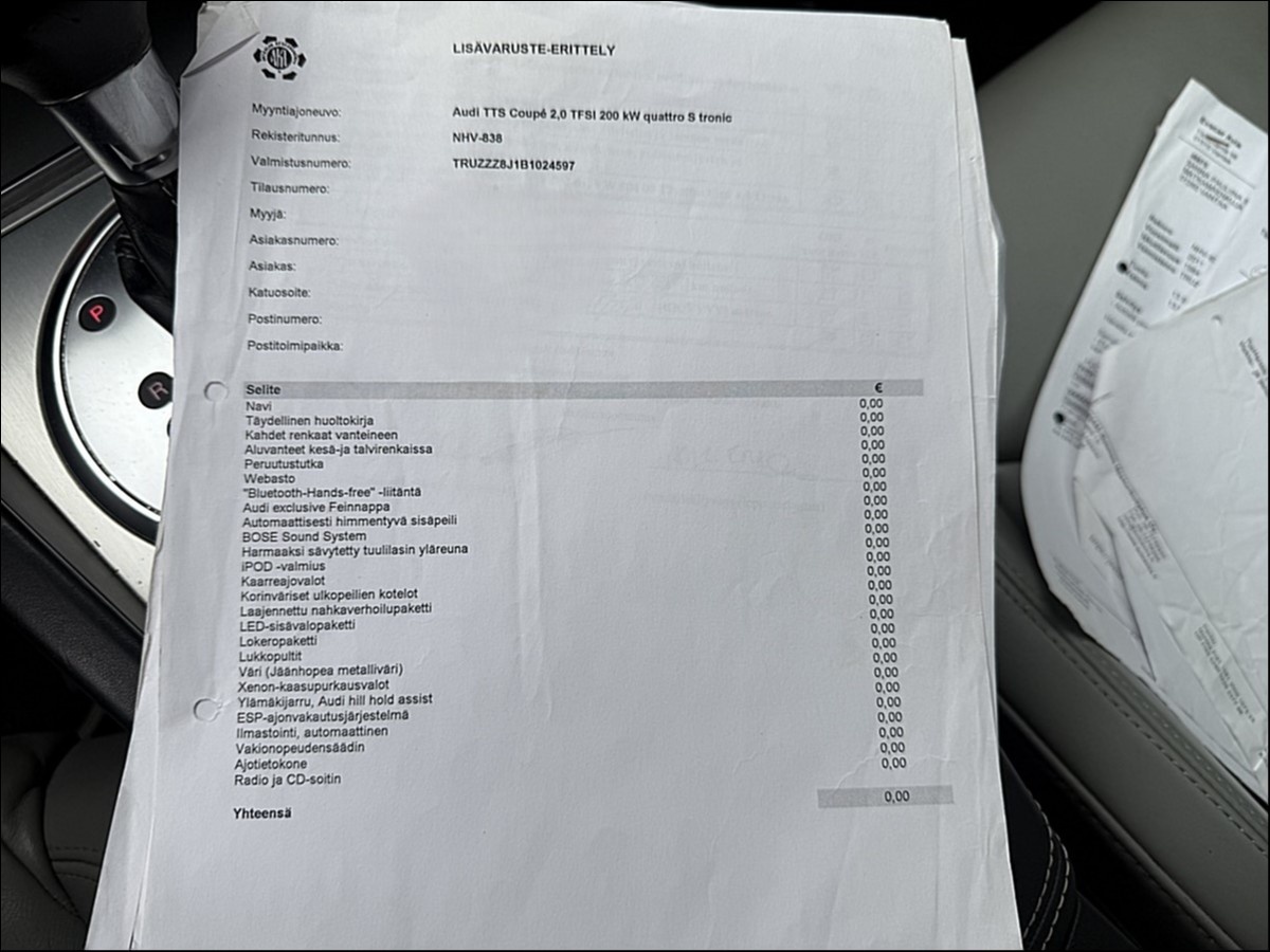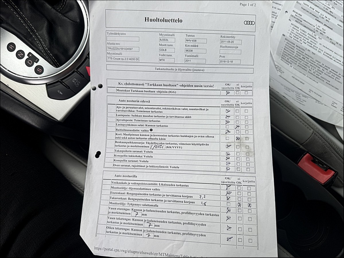 Myyntikohteet » 1. Cron Solution Oy:n konkurssipesä (2914129-6), HÄMEENLINNA, 13.02.2026 » 01. Henkilöauto Audi AUDI TTS 2.0 vm. 2011