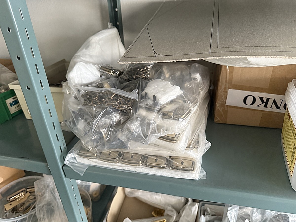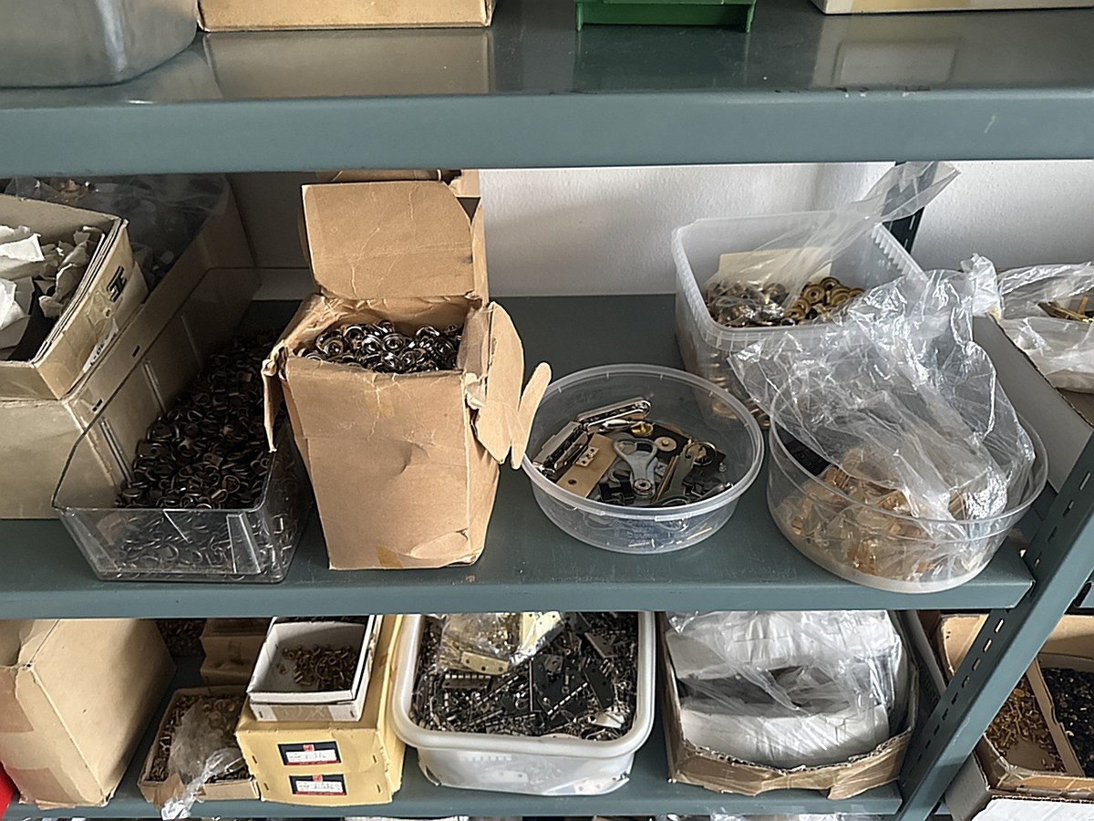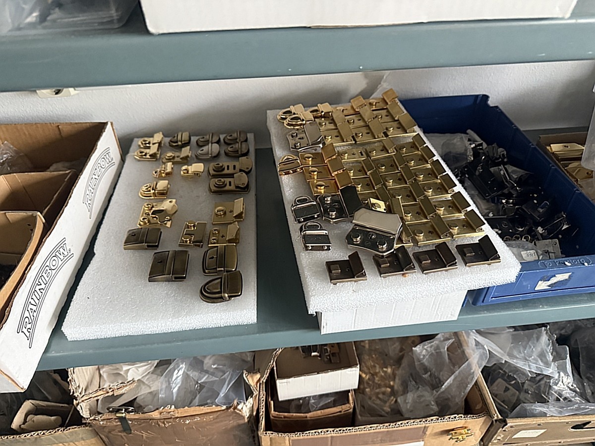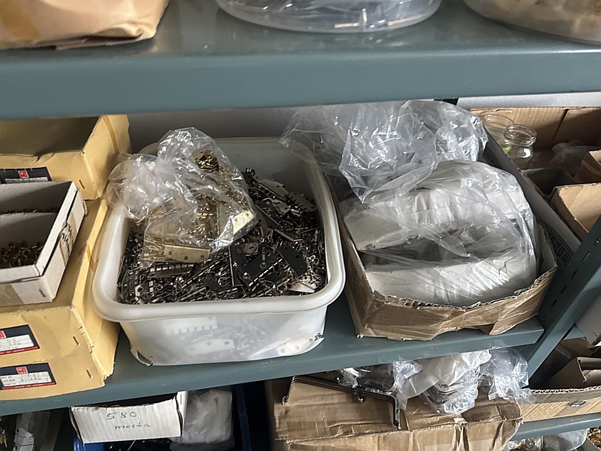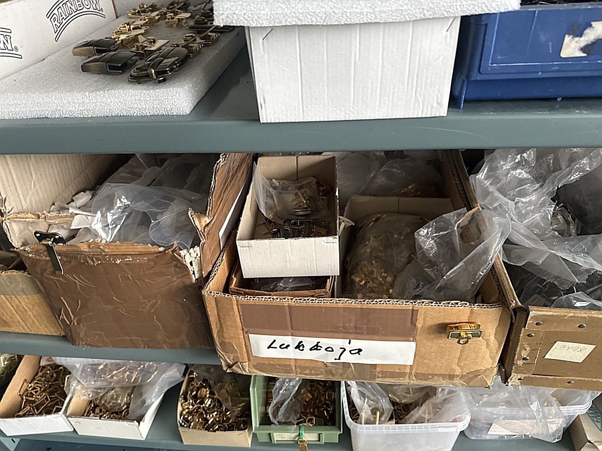 Laukkujen ja lompakoiden valmistukseen liittyviä osia iso erä, hyllyt sisältyy kauppaan.