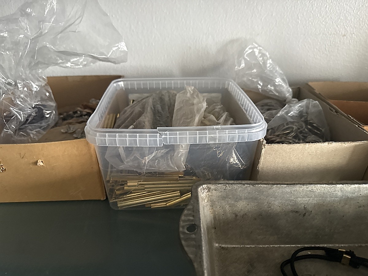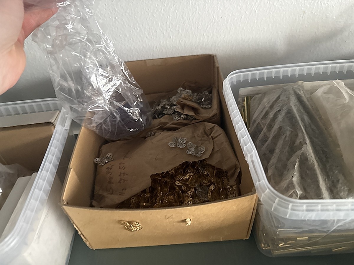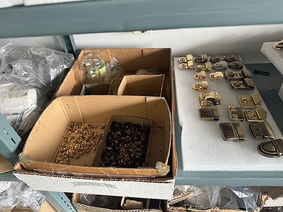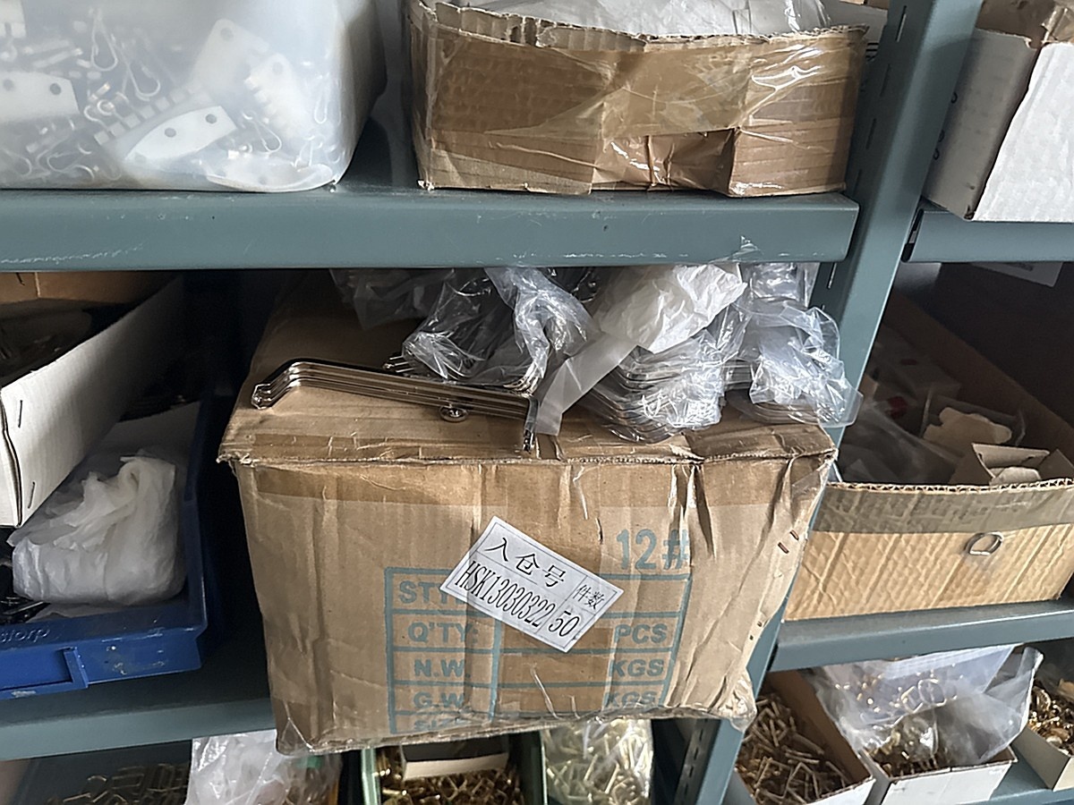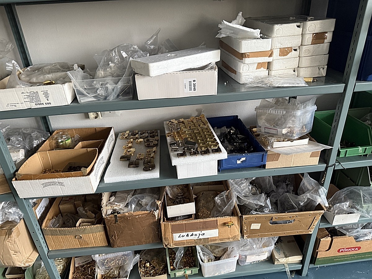 Laukkujen ja lompakoiden valmistukseen liittyviä osia iso erä, hyllyt sisältyy kauppaan.