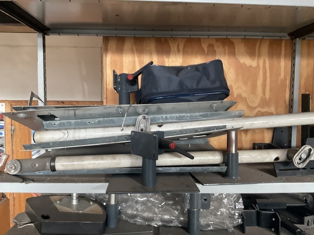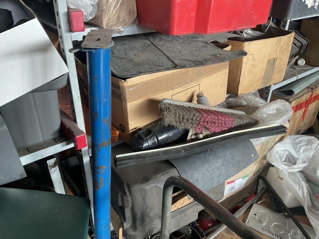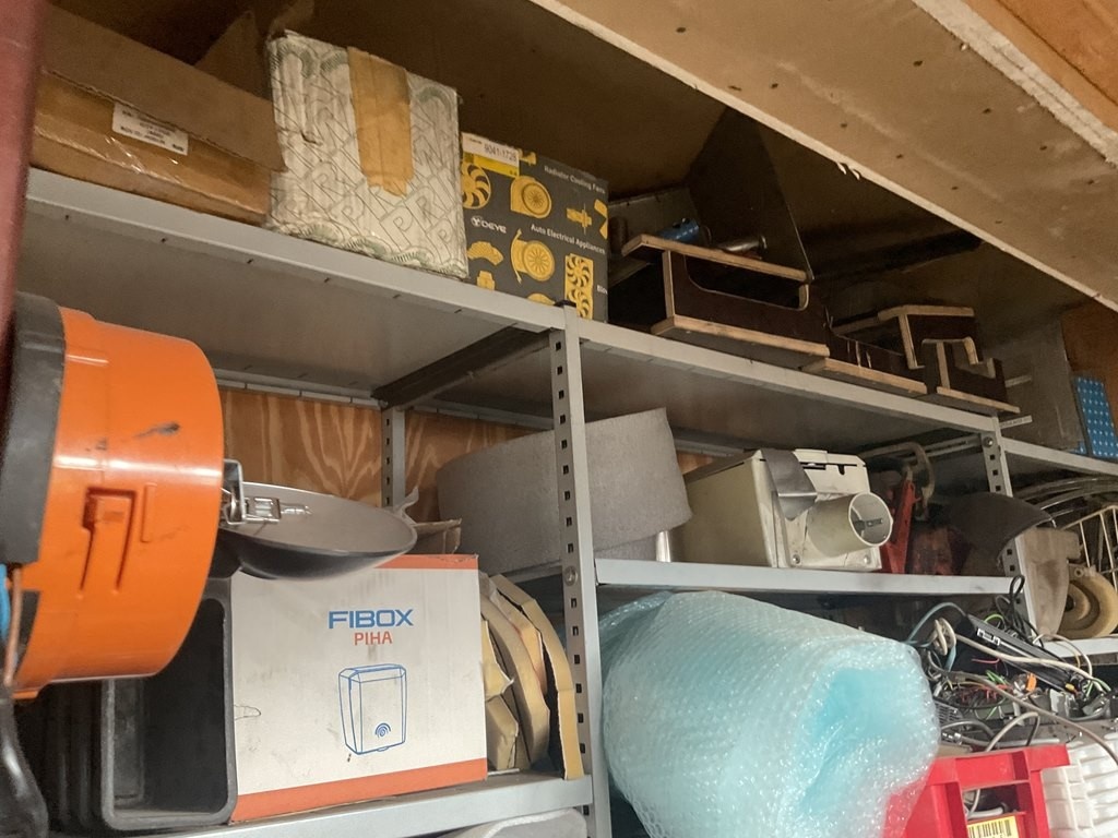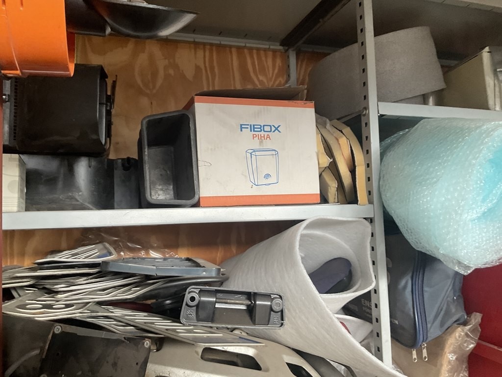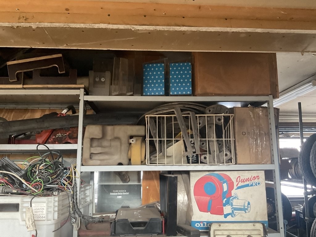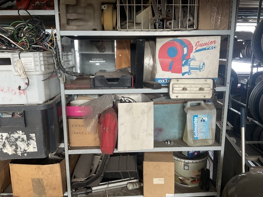 Ajoneuvokaluston käytetyt tarvikkeet ja osat varastohyllyssä mm.