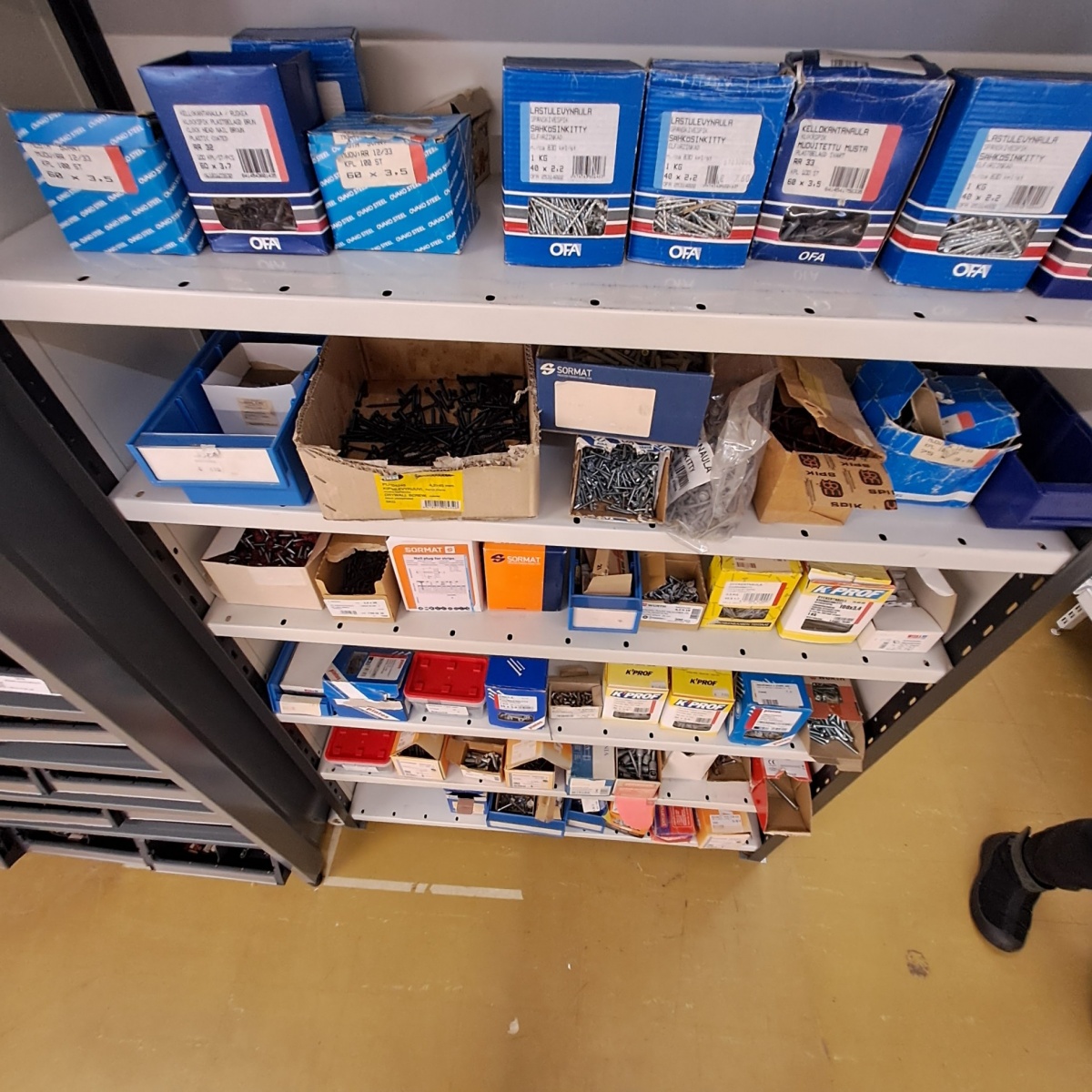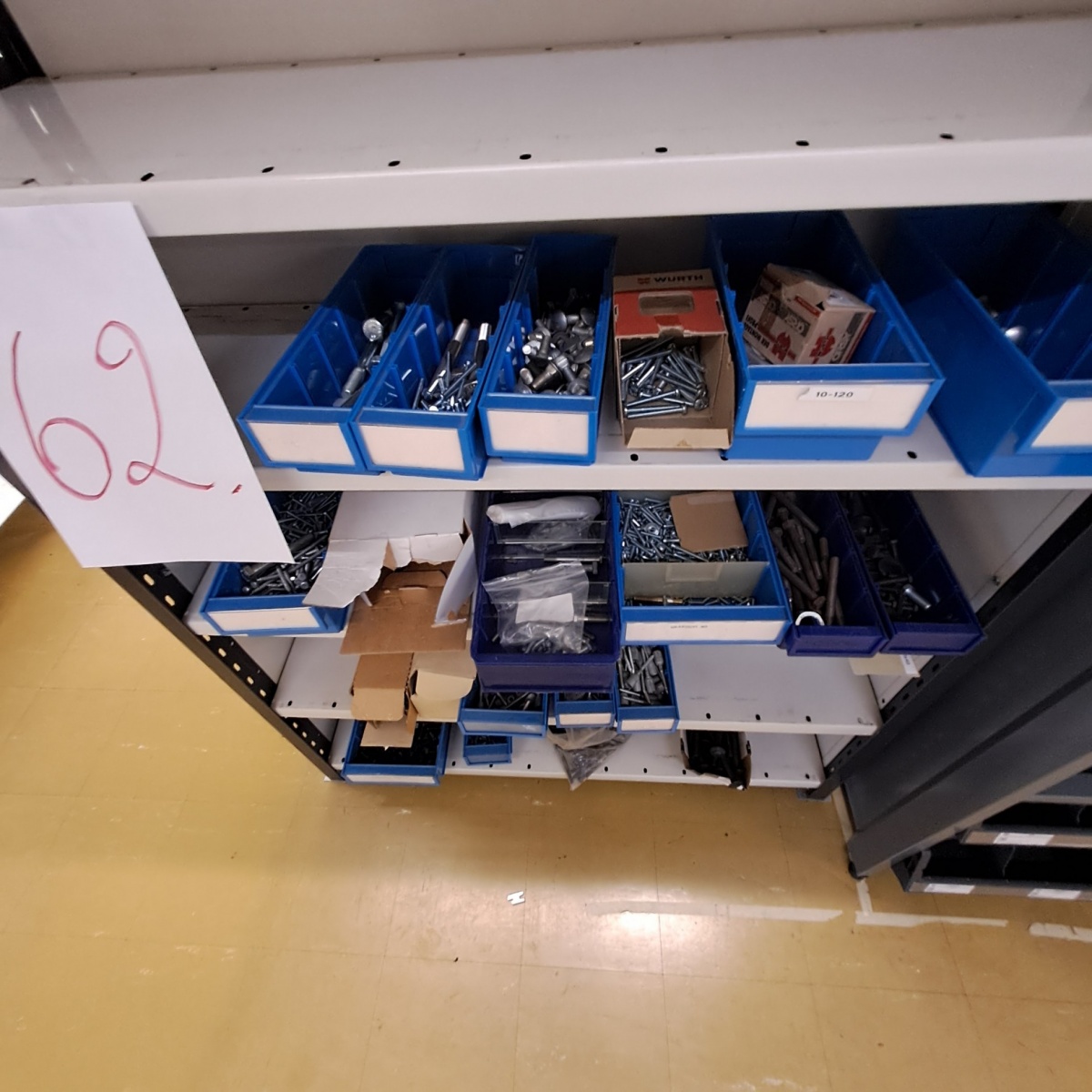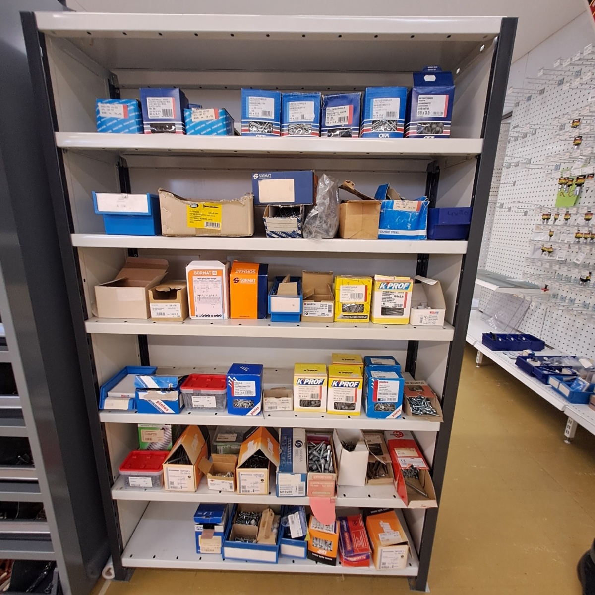 Myyntikohteet » 3. Outokummun Pienkone Oy:n konkurssipesä, OUTUKUMPU (3333390-1), 03.03.2026 » 62. Kaksipuoleinen hylly ja siinä olevat kiinnitystarvikkeet
