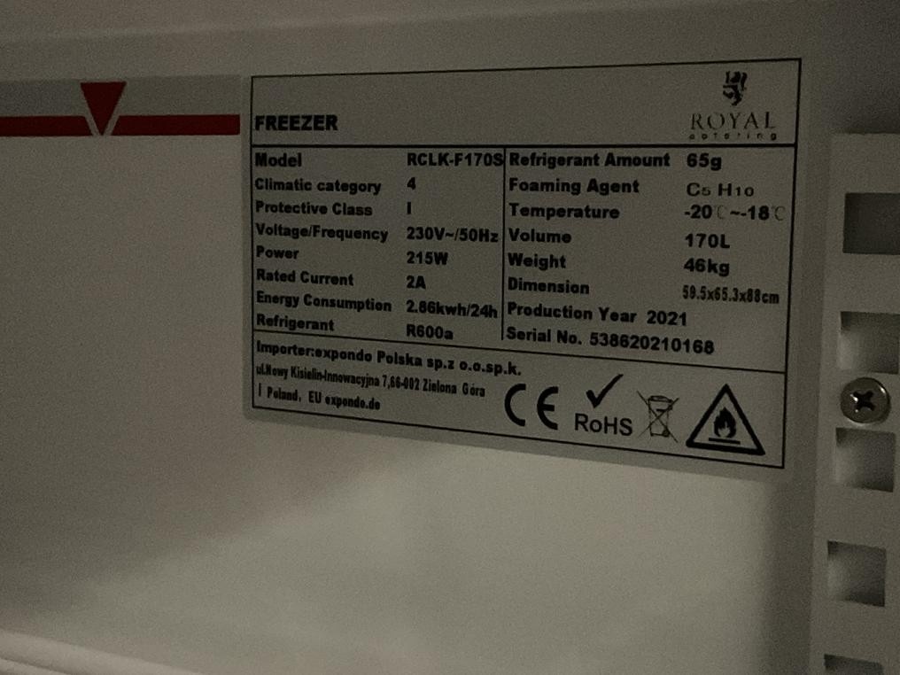 Myyntikohteet » 1. Paimelan Ranch Oy:n konkurssipesä, VESIVEHMAA (2480918-9), 03.03.2026 » 07. Pakastinkaappi Royal Catering RCLK-F170S, tilavuus 170 L