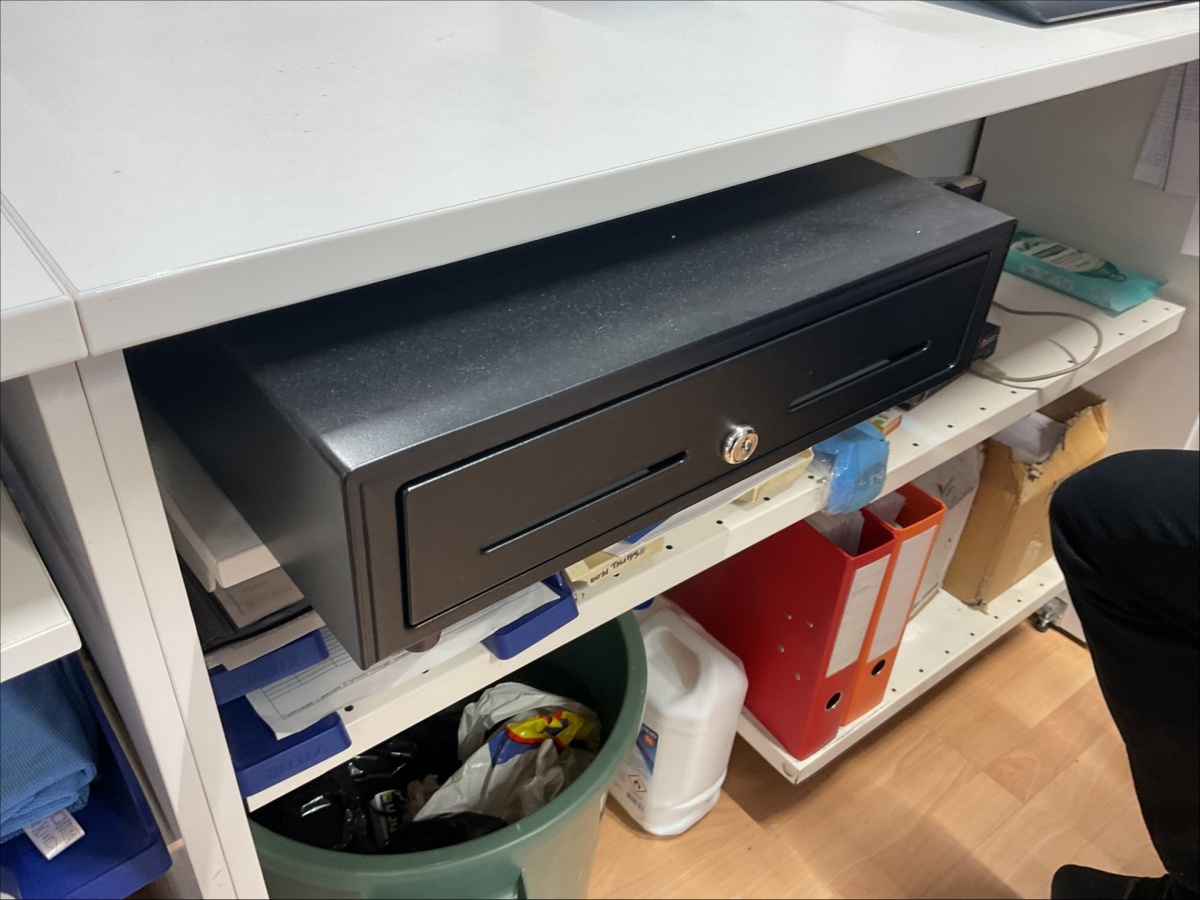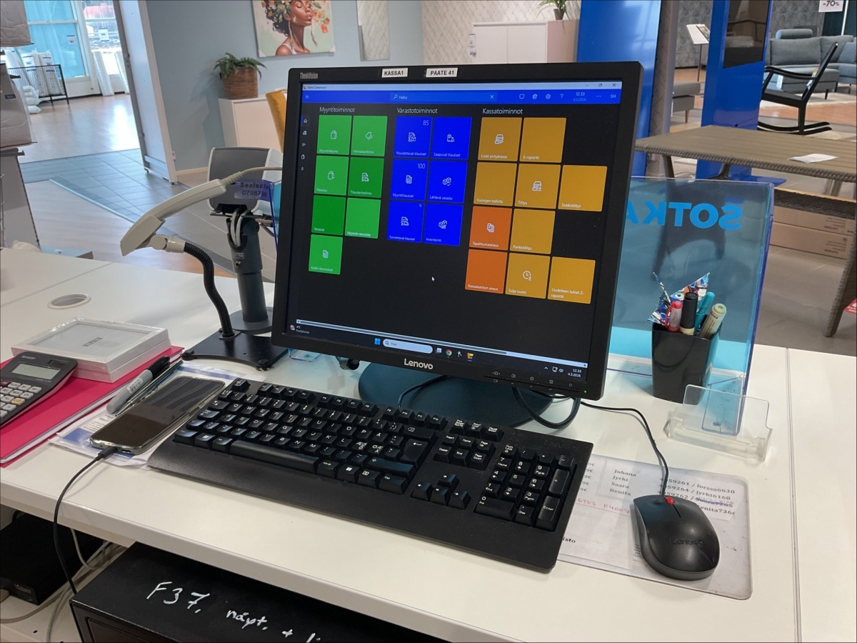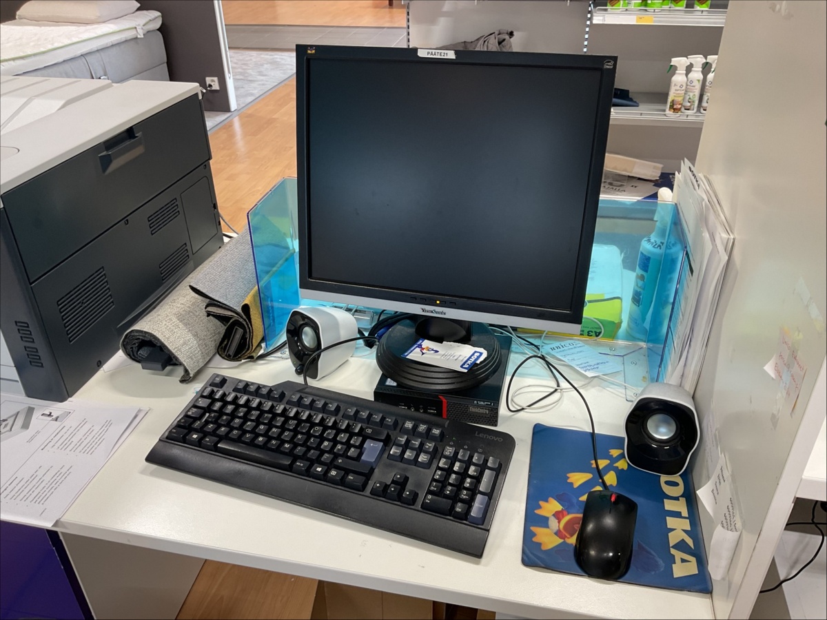 Myyntikohteet » 6. Indoor Group Oy:n konkurssipesä, FORSSA (1512332-9), 04.03.2026 » F37. Näytöt 3 kpl, näppäimistöt 3 kpl, kassalippaat 2 kpl