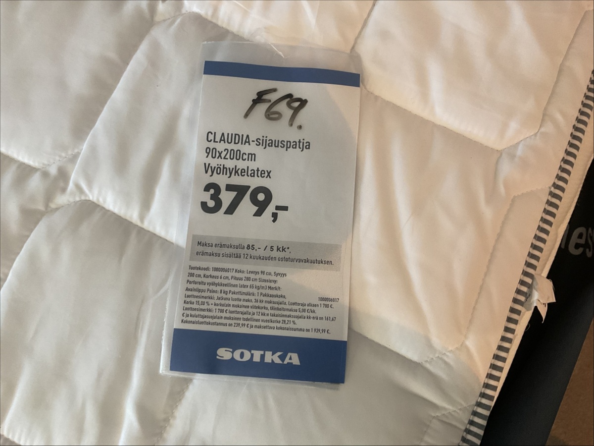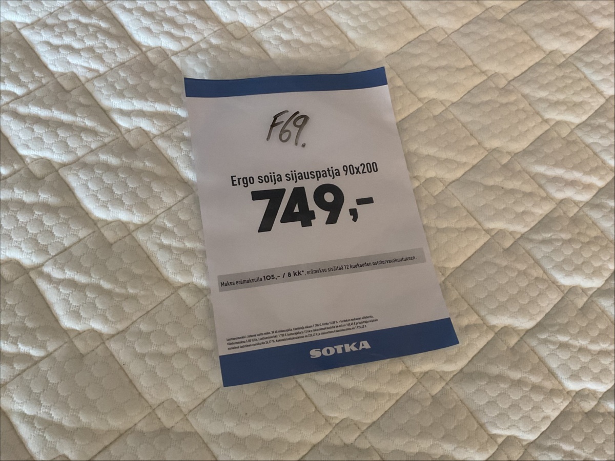 Myyntikohteet » 8. Indoor Group Oy:n konkurssipesä, FORSSA (1512332-9), 09.03.2026 » F69. CLAUDIA-sijauspatja (90 x 200 cm), Ergo soija sijauspatja (90 x 200 cm)