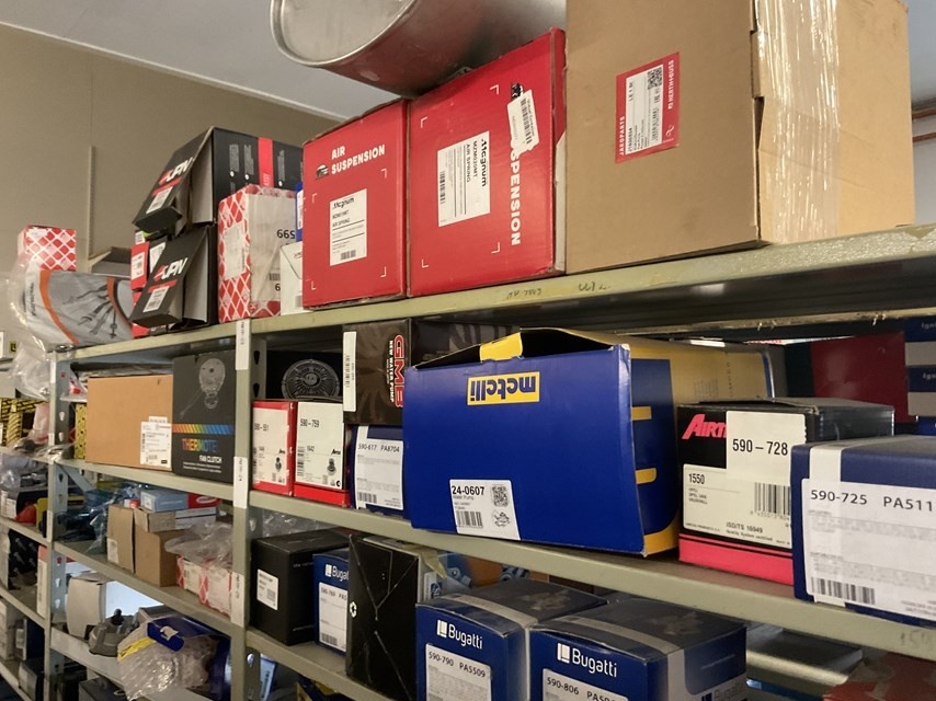 Auton alustan, pyörän ja jarrujärjestelmän varaosat kolmessa hyllyvälikössä, Yhteensä n. 235 – 380 kappaletta