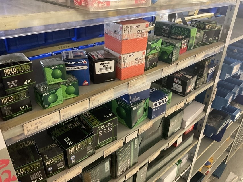 Moottorin huolto-osahylly, laakereita, kiinnitystarvikkeita ja pieniä varaosia ym. Yhteensä 3 hyllyvälikkä